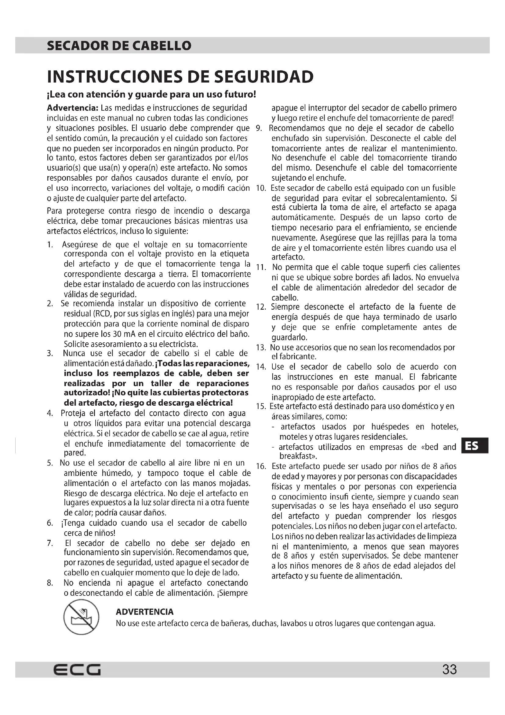 de edad ymayores ypor personas con discapacidades físicas y mentales o por personas con experiencia oconocimiento insu ciente, siempre ycuando sean supervisadas o se les haya enseñado el uso seguro del artefacto y puedan comprender los riesgos potenciales. Los niños no deben jugar con el artefacto. Los niños no deben realizar las actividades de limpieza ni el mantenimiento, a menos que sean mayores de 8 años y estén supervisados. Se debe mantener alos niños menores de 8 años de edad alejados del artefacto ysu fuente de alimentación. ADVERTENCIA No use este artefacto cerca de bañeras, duchas, lavabos uotros lugares que contengan agua.ES