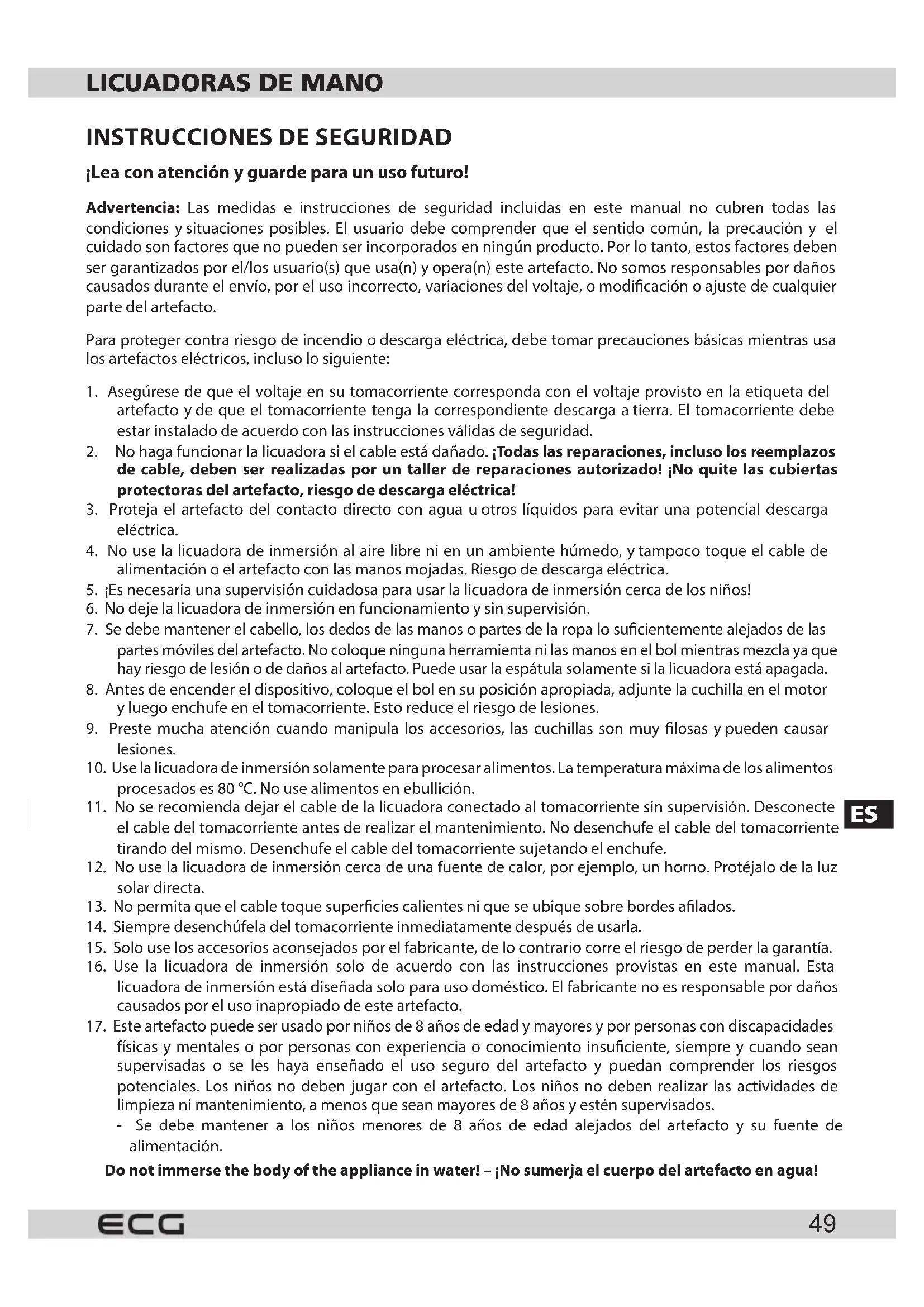 físicas y mentales o por personas con experiencia o conocimiento insuciente, siempre y cuando sean supervisadas o se les haya enseñado el uso seguro del artefacto y puedan comprender los riesgos potenciales. Los niños no deben jugar con el artefacto. Los niños no deben realizar las actividades de limpieza ni mantenimiento, a menos que sean mayores de 8 años y estén supervisados. - Se debe mantener a los niños menores de 8 años de edad alejados del artefacto y su fuente de alimentación. Do not immerse the body of the appliance in water! – ¡No sumerja el cuerpo del artefacto en agua!ES