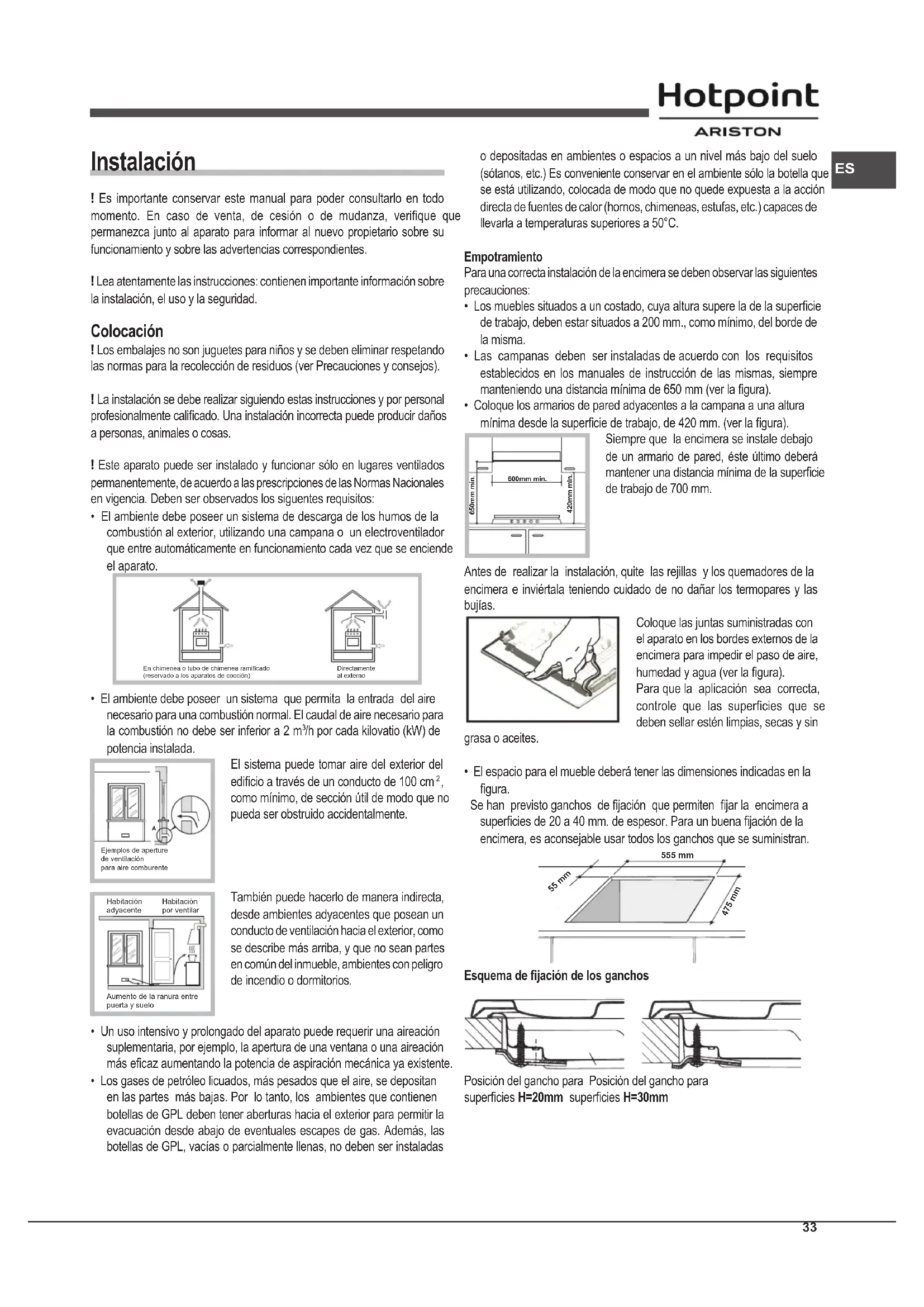 - El espacio para el mueble deberá tener las dimensiones indicadas en la gura. Se han previsto ganchos de jación que permiten jar la encimera a supercies de 20 a 40 mm. de espesor. Para un buena jación de la encimera, es aconsejable usar todos los ganchos que se suministran. 555 mm 55 mm 475 mm Esquema de jación de los ganchos Posición del gancho para Posición del gancho para supercies H=20mm supercies H=30mm 600mm min. 420mm min. 650mm min.34
