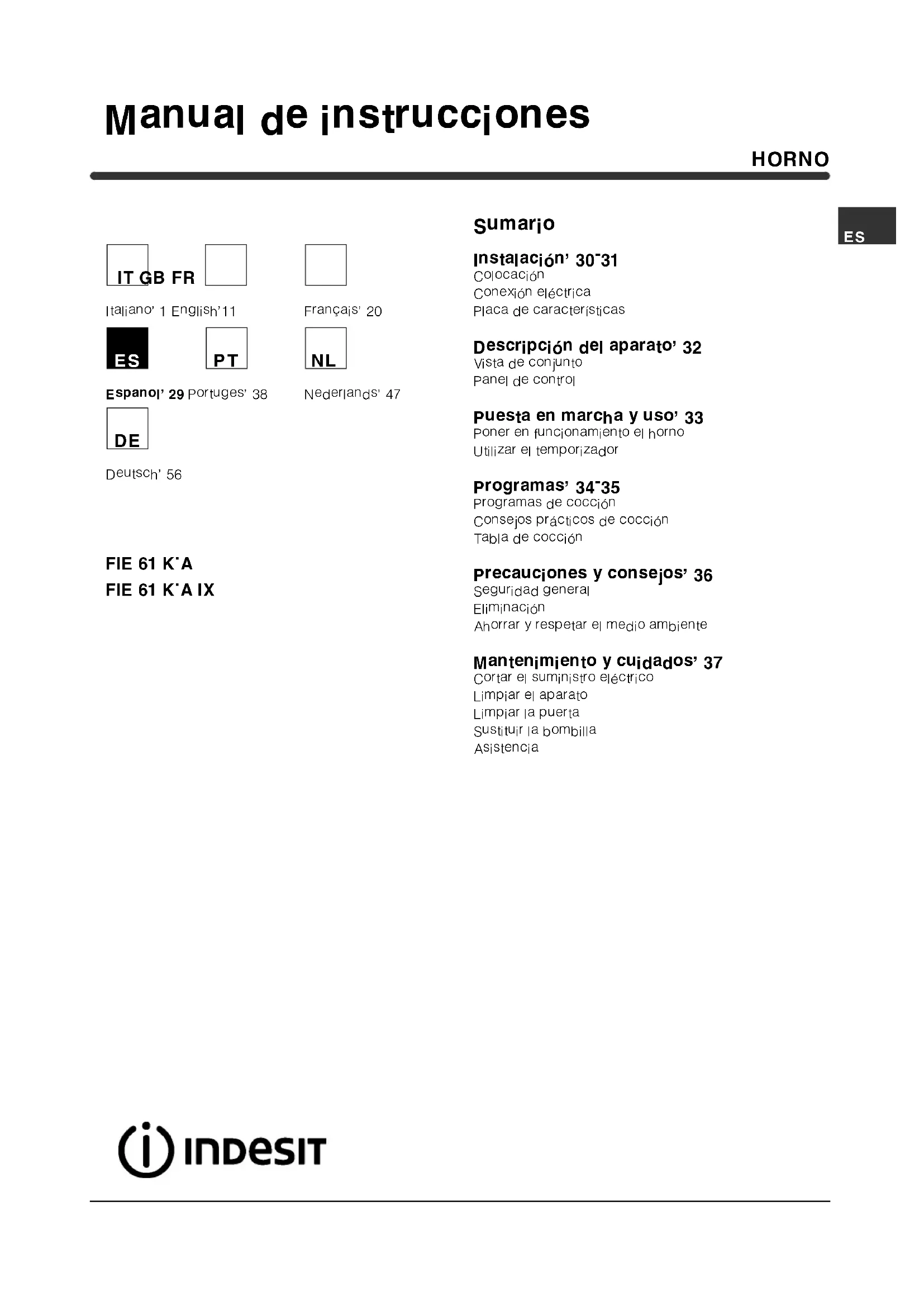 FIE 61 K.A (AN) - Horno INDESIT - Manual de uso y guía de instrucciones gratis