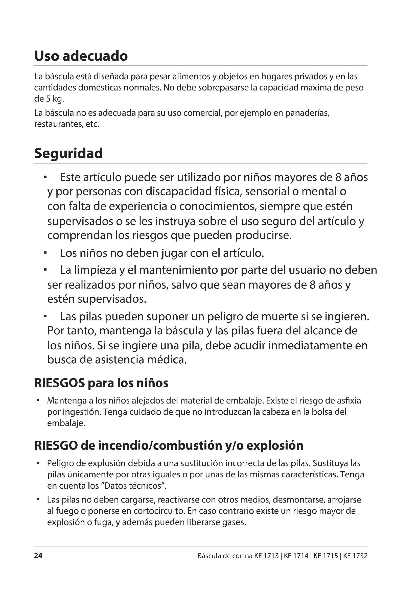 Báscula de cocina KE 1713 | KE 1714 | KE 1715 | KE 1732 Uso adecuado La báscula está diseñada para pesar alimentos y objetos en hogares privados y en las cantidades domésticas normales. No debe sobrepasarse la capacidad máxima de peso de 5 kg. La báscula no es adecuada para su uso comercial, por ejemplo en panaderías, restaurantes, etc. Seguridad Este artículo puede ser utilizado por niños mayores de 8 años y por personas con discapacidad física, sensorial o mental o con falta de experiencia o conocimientos, siempre que estén supervisados o se les instruya sobre el uso seguro del artículo y comprendan los riesgos que pueden producirse. Los niños no deben jugar con el artículo. La limpieza y el mantenimiento por parte del usuario no deben ser realizados por niños, salvo que sean mayores de 8 años y estén supervisados. Las pilas pueden suponer un peligro de muerte si se ingieren. Por tanto, mantenga la báscula y las pilas fuera del alcance de los niños. Si se ingiere una pila, debe acudir inmediatamente en busca de asistencia médica. RIESGOS para los niños Mantenga a los niños alejados del material de embalaje. Existe el riesgo de asxia por ingestión. Tenga cuidado de que no introduzcan la cabeza en la bolsa del embalaje. RIESGO de incendio/combustión y/o explosión Peligro de explosión debida a una sustitución incorrecta de las pilas. Sustituya las pilas únicamente por otras iguales o por unas de las mismas características. Tenga en cuenta los “Datos técnicos”. Las pilas no deben cargarse, reactivarse con otros medios, desmontarse, arrojarse al fuego o ponerse en cortocircuito. En caso contrario existe un riesgo mayor de explosión o fuga, y además pueden liberarse gases.Seguridad