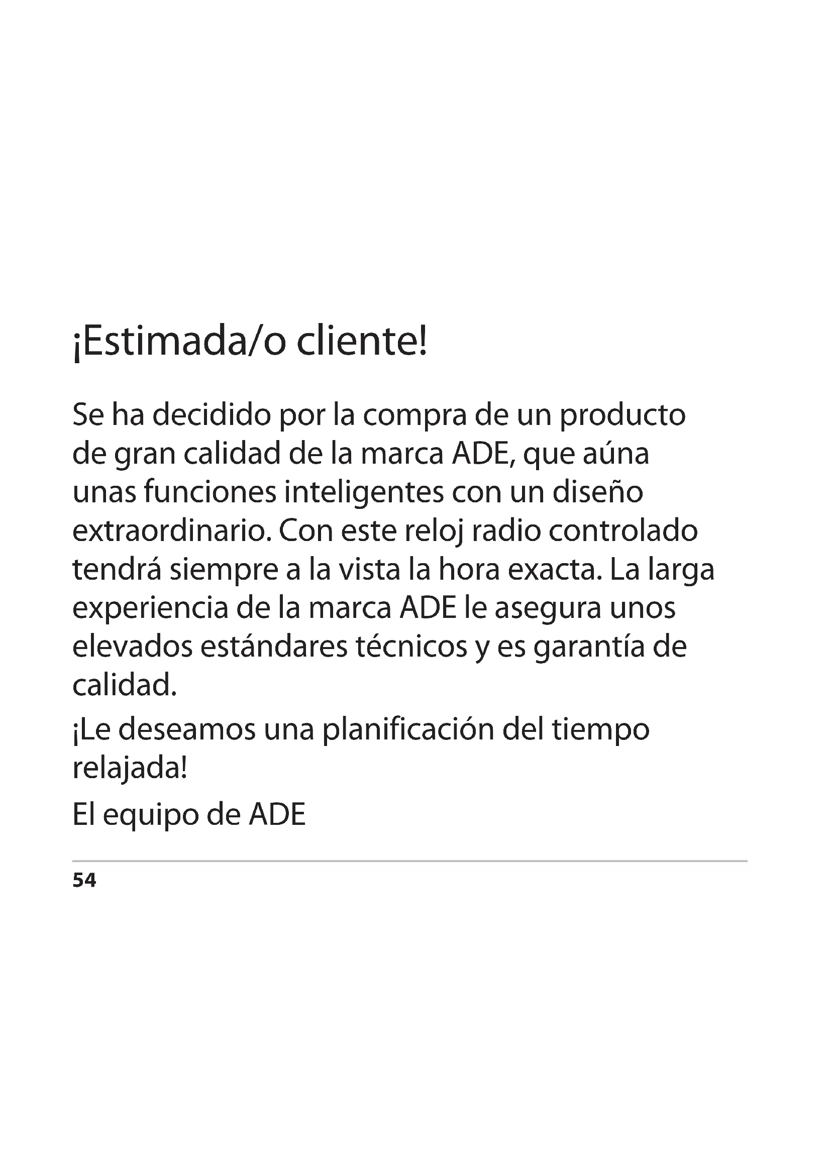 Datos técnicos Modelo: Reloj radio controlado DCF CK 1704 Pilas: 2 x LR03 (AAA)/1,5 V Intensidad de corriente: < 40 mA Recibe frecuencia: 77,5 kHz Rango de medida: 0 °C - 50 °C (32 °F - 122 °F) Distribuidor original (no hay dirección de servicio técnico): GRENDS GmbH Stahltwiete 23 22761 Hamburgo, Alemania Nuestros productos se están desarrollando y mejorando continuamente. Por este motivo cabe la posibilidad de que en cualquier momento pudiera haber cambios en el diseño o modificaciones técnicas.76 Declaración de conformidad GRENDS GmbH declara por la presente que el reloj radiocontrolado CK 1704 cumple con las directivas 2014/53/UE y 2011/65/UE. El texto completo de la declaración de conformidad CE está disponible en la siguiente dirección de Internet: www.ade- germany.de/doc Esta declaración perderá su validez si se ha realizado una modificación en el artículo que no haya sido previamente autorizada por nuestra parte. Hamburgo, mayo de 2023 GRENDS GmbH77