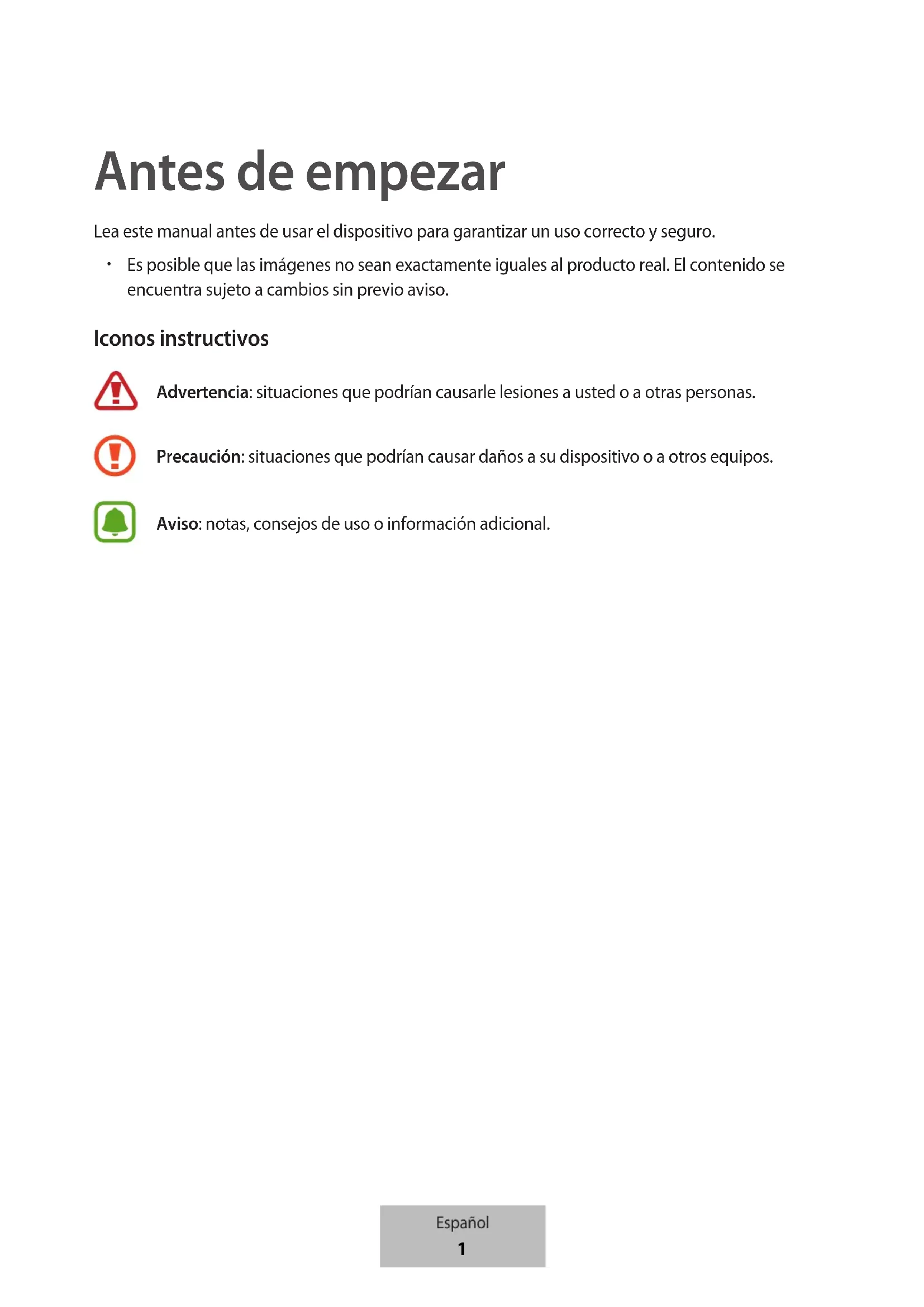 Es posible que las imágenes no sean exactamente iguales al producto real. El contenido se encuentra sujeto a cambios sin previo aviso. Iconos instructivos Advertencia: situaciones que podrían causarle lesiones a usted o a otras personas. Precaución: situaciones que podrían causar daños a su dispositivo o a otros equipos. Aviso: notas, consejos de uso o información adicional. Español