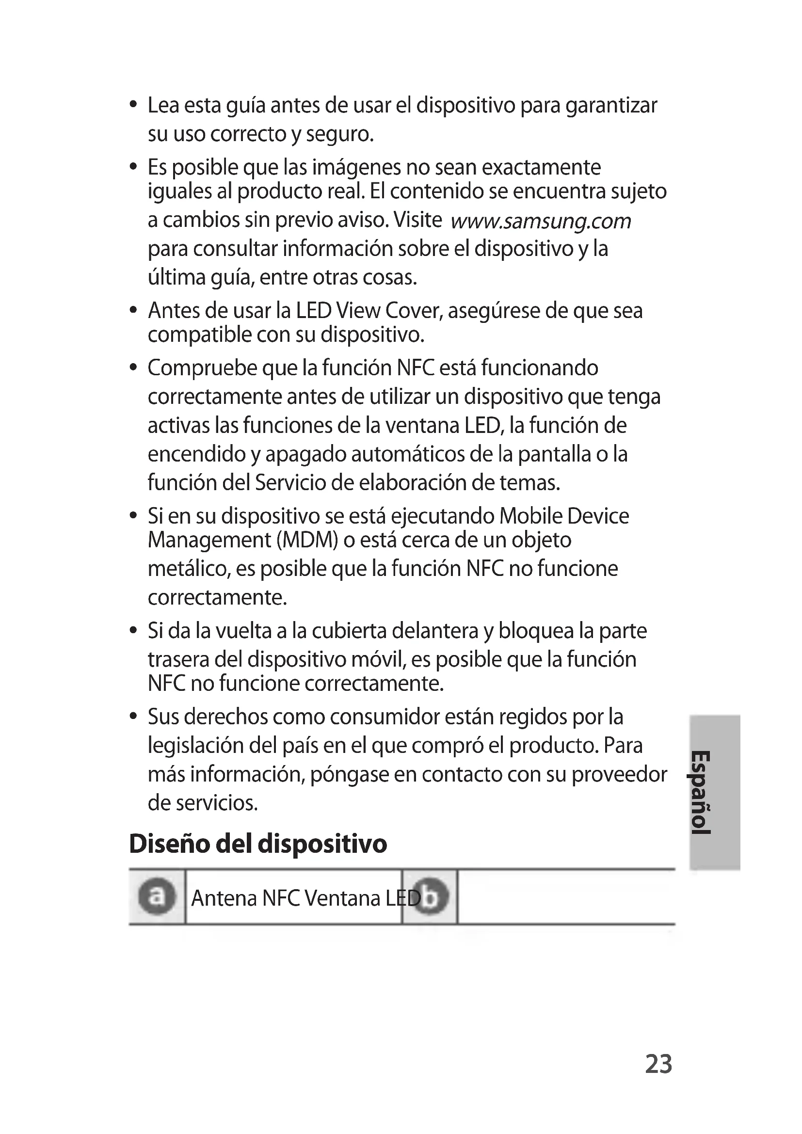 Accesorios y, a continuación, utilice la función de edición de iconos LED. Asimismo, podrá utilizar la aplicación de edición del icono LED que aparece al colocar la LED View Cover en el dispositivo móvil. Información de seguridad Lea toda la información de seguridad antes de usar el dispositivo para garantizar un uso correcto y seguro. Para ver toda la información de seguridad, consulte la web de Samsung. Use baterías, cargadores, accesorios y suministros aprobados por el fabricante No toque el dispositivo con las manos mojadas No golpee ni deje caer el cargador ni el dispositivo El dispositivo puede utilizarse en lugares con una temperatura ambiente entre 0°C y 35°C. Puede conservar el dispositivo a una temperatura ambiente entre -20°C y 50°C. Si utiliza o almacena el dispositivo a una temperatura fuera de los intervalos recomendados, el dispositivo puede dañarse, o puede reducirse la vida útil de la batería Evite que la clavija multifunción y el extremo pequeño del cargador entren en contacto con materiales conductores, como líquidos, polvo, polvos metálicos o grafito26 No deje que los niños ni animales se metan el dispositivo en la boca No desmonte, modifique ni repare el dispositivo Eliminación correcta La presencia de este símbolo en el producto, accesorios o material informativo que lo acompañan indica que ni el producto ni sus accesorios electrónicos (como el cargador, auriculares, cable USB) deberán eliminarse junto con otros residuos domésticos. Para obtener información sobre el compromiso de Samsung con el medio ambiente y las obligaciones específicas del producto con normativas concretas, como REACH, RAEE, sobre baterías, etc., visite samsung.com/uk/aboutsamsung/samsungelectronics/ corporatecitizenship/data_corner.html27 Español Declaración de conformidad Visite www.samsung.com/mobile_doc para acceder a la declaración de conformidad. Resumen Declaración de Conformidad SAMSUNG declara, bajo su responsabilidad, que este aparato cumple con lo dispuesto en la Directiva 2014/53/ UE del Parlamento Europeo y del Consejo, de 16 de abril de 2014, trasladada a la legislación española mediante el Real Decreto 188/2016, de 6 de mayo. Banda y modo Banda y modo Potencia de salida NFC 13,56 MHz Campo magnético H 42 dBuA/m a 10 m28