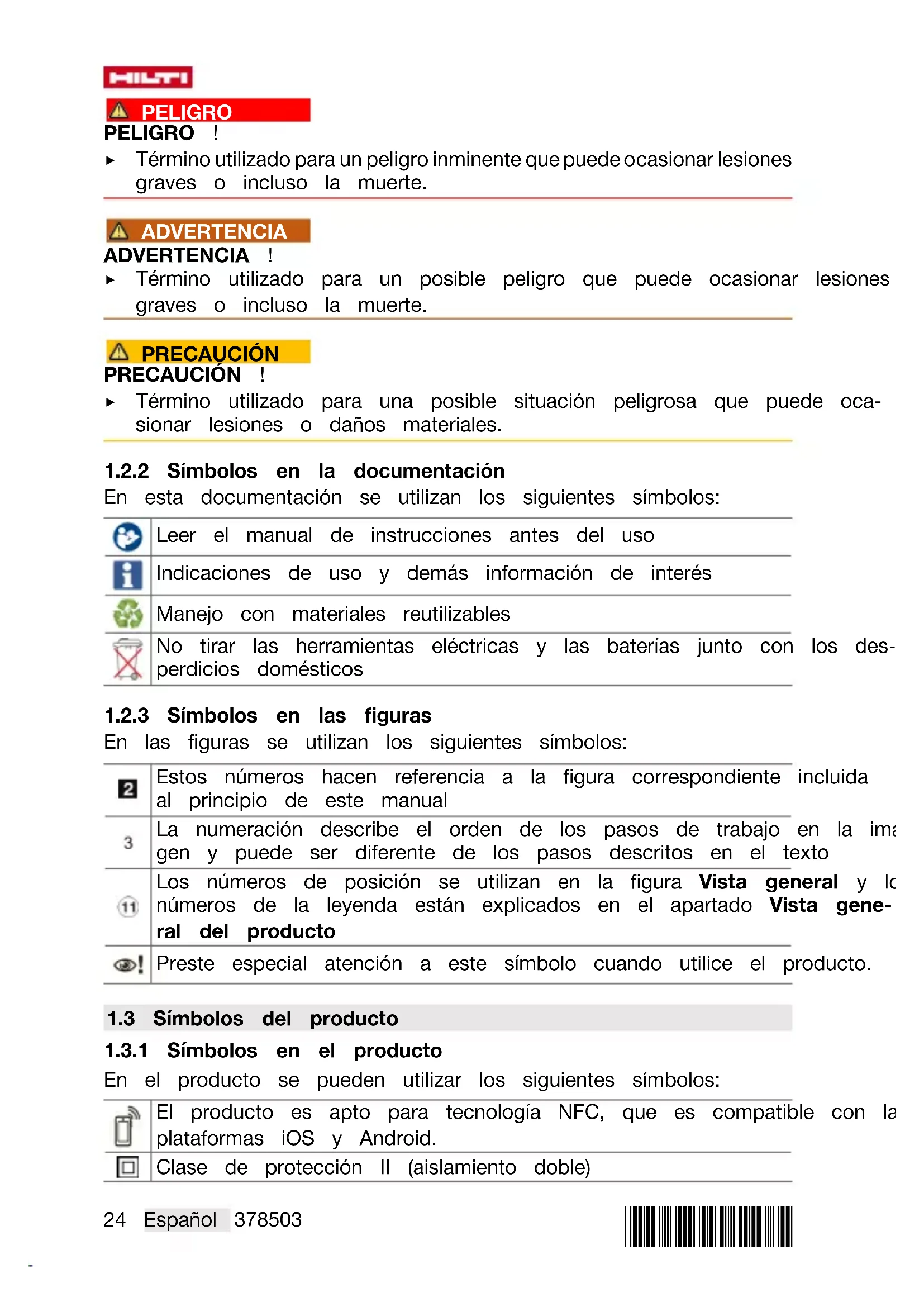 Las advertencias de seguridad advierten de peligros derivados del manejo del producto. Se utilizan las siguientes palabras de peligro:24 Español 378503 *378503* PELIGRO PELIGRO ! ▶ Término utilizado para un peligro inminente que puede ocasionar lesiones graves o incluso la muerte. ADVERTENCIA ADVERTENCIA ! ▶ Término utilizado para un posible peligro que puede ocasionar lesiones graves o incluso la muerte. PRECAUCIÓN PRECAUCIÓN ! ▶ Término utilizado para una posible situación peligrosa que puede oca- sionar lesiones o daños materiales.