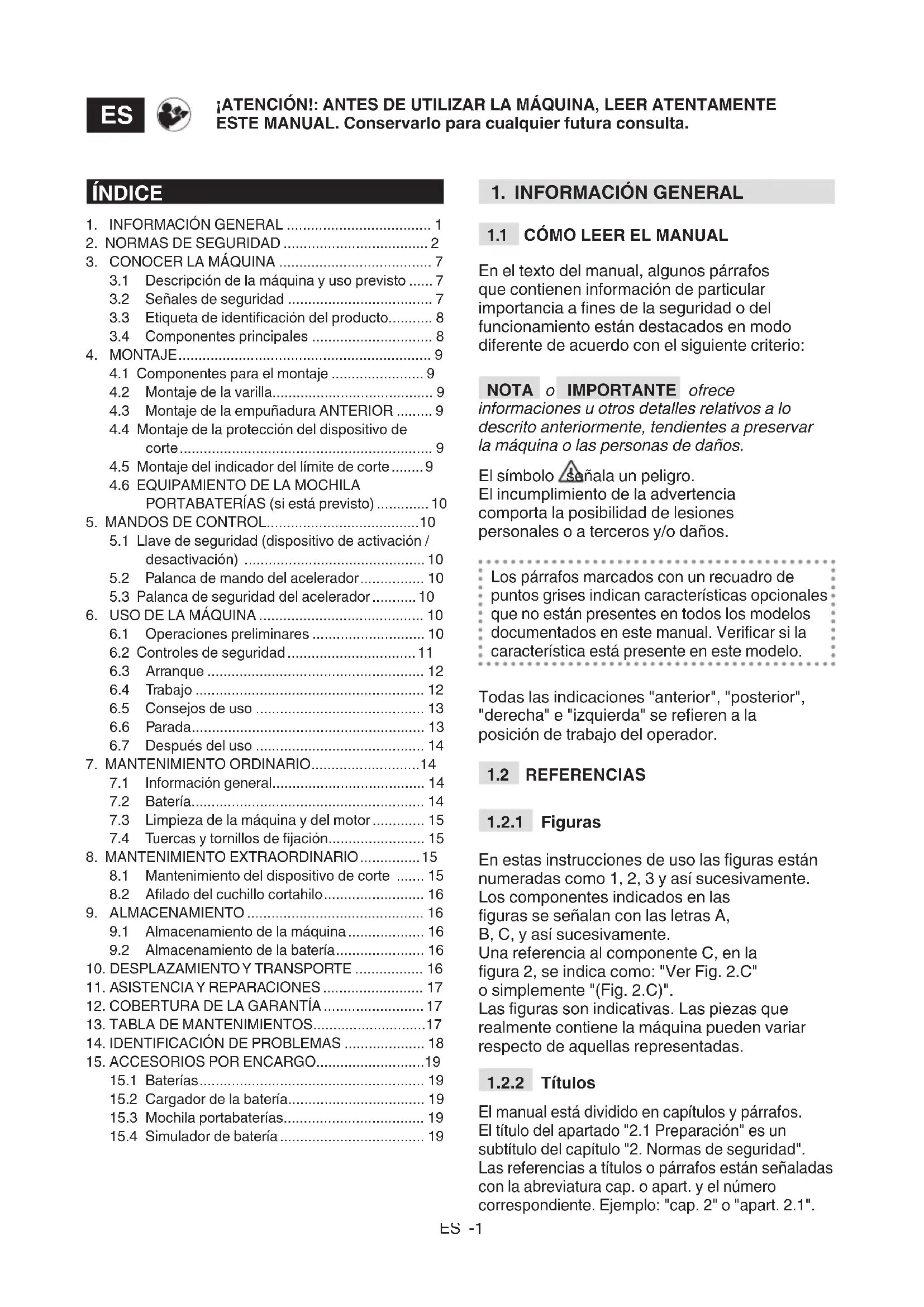 IMPORTANTE Las siguientes normas de seguridad integran las prescripciones de seguridad presentes en el manual especíco de la batería y del cargador de batería adjunto a la máquina.ES -6
