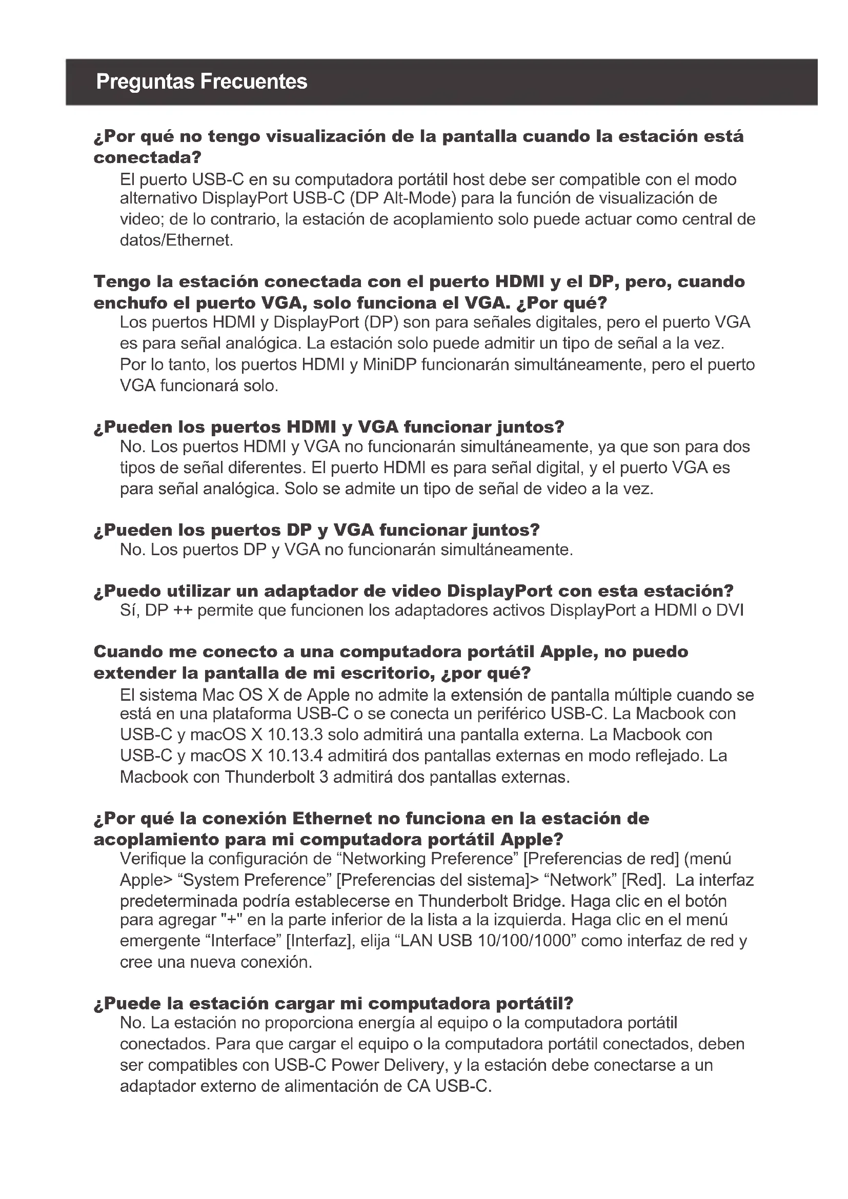 HDMI Up to 3840 x 2160@30 Hz Up to 3840 x 2160@30 Hz VGA Up to 1080P@60 Hz Windows 10 / Chrome OS / Mac OS XWindows 10 / Chrome OS /Mac OS XWindows 10 / Chrome OS /Mac OS XWindows 10 / Mac OS XWindows 10 / Mac OS XWindows 10 / Mac OS X Paso 1 Encienda la computadora anfitriona Enchufe el adaptador de energía USB-C de la laptop al puerto USB-C con entrega de energía * Paso 2 Conecte los dispositivos externos a los puertos adecuados según sea necesario (Referirse la descripción del producto para obtener información sobre los puertos) Paso 3 Conecte los monitores externos a la salida de vídeo con la opción: DisplayPort y puerto HDMI para monitores dobles simultáneos o puerto VGA para monitores individuales. El puerto VGA no se puede utilizar en forma simultánea con el puerto HDMI o DisplayPort. Paso 4 Conecte el cable USB-C conectado en GUD3C02B Pal puerto USB-C de la computadora anfitriona. La pantalla de la laptop puede parpadear unas pocas veces antes que GUD3C02B pueda reconocer a todos los dispositivos *Nota: Sin enchufar el adaptador de energía USB-C de la laptop, GUD3C02B puede aún funcionar en el paso 2-3, pero GUD3C02B no suministrará energía a la laptop para su carga.Preguntas Frecuentes ¿Por qué no tengo visualización de la pantalla cuando la estación está conectada? El puerto USB-C en su computadora portátil host debe ser compatible con el modo alternativo DisplayPort USB-C (DP Alt-Mode) para la función de visualización de video; de lo contrario, la estación de acoplamiento solo puede actuar como central de datos/Ethernet. Tengo la estación conectada con el puerto HDMI y el DP, pero, cuando enchufo el puerto VGA, solo funciona el VGA. ¿Por qué? Los puertos HDMI y DisplayPort (DP) son para señales digitales, pero el puerto VGA es para señal analógica. La estación solo puede admitir un tipo de señal a la vez. Por lo tanto, los puertos HDMI y MiniDP funcionarán simultáneamente, pero el puerto VGA funcionará solo. ¿Pueden los puertos HDMI y VGA funcionar juntos? No. Los puertos HDMI y VGA no funcionarán simultáneamente, ya que son para dos tipos de señal diferentes. El puerto HDMI es para señal digital, y el puerto VGA es para señal analógica. Solo se admite un tipo de señal de video a la vez. ¿Pueden los puertos DP y VGA funcionar juntos? No. Los puertos DP y VGA no funcionarán simultáneamente. ¿Puedo utilizar un adaptador de video DisplayPort con esta estación? Sí, DP ++ permite que funcionen los adaptadores activos DisplayPort a HDMI o DVI Cuando me conecto a una computadora portátil Apple, no puedo extender la pantalla de mi escritorio, ¿por qué? El sistema Mac OS X de Apple no admite la extensión de pantalla múltiple cuando se está en una plataforma USB-C o se conecta un periférico USB-C. La Macbook con USB-C y macOS X 10.13.3 solo admitirá una pantalla externa. La Macbook con USB-C y macOS X 10.13.4 admitirá dos pantallas externas en modo reflejado. La Macbook con Thunderbolt 3 admitirá dos pantallas externas. ¿Por qué la conexión Ethernet no funciona en la estación de acoplamiento para mi computadora portátil Apple? Verifique la configuración de “Networking Preference” [Preferencias de red] (menú Apple> “System Preference” [Preferencias del sistema]> “Network” [Red]. La interfaz predeterminada podría establecerse en Thunderbolt Bridge. Haga clic en el botón para agregar "+" en la parte inferior de la lista a la izquierda. Haga clic en el menú emergente “Interface” [Interfaz], elija “LAN USB 10/100/1000” como interfaz de red y cree una nueva conexión. ¿Puede la estación cargar mi computadora portátil? No. La estación no proporciona energía al equipo o la computadora portátil conectados. Para que cargar el equipo o la computadora portátil conectados, deben ser compatibles con USB-C Power Delivery, y la estación debe conectarse a un adaptador externo de alimentación de CA USB-C. ¿Puedo usar un adaptador de alimentación de CA de mayor capacidad con la estación para cargar mi computadora portátil? Sí. Puede usar cualquier adaptador de alimentación de CA USB-C disponible con la estación para cargar su computadora portátil. Cuando el adaptador de alimentación de CA USB-C está conectado a la estación de acoplamiento, la estación de acoplamiento consumirá una potencia máxima de 15 W cuando todos los puertos estén conectados y transmitiendo datos. La capacidad de potencia restante se dirigirá a la computadora portátil conectada, con un máximo de 85 W de potencia. ¿Funciona esta estación cuando se conecta a un puerto Thunderbolt 3? Sí, funciona. La estación de acoplamiento funciona cuando se conecta a un puerto Thunderbolt 3 en su computadora. Sin embargo, debido a las características de compatibilidad de los sistemas operativos, los resultados serán diferentes. Por ejemplo, el sistema Mac OS X solo admite una sola extensión de pantalla cuando se usa un periférico USB-C, pero el sistema operativo Windows puede admitir múltiples extensiones de pantalla. ¿Funciona esta estación cuando se conecta a un puerto Thunderbolt 2? No, no funciona. La estación solo funcionará cuando se conecte a un puerto USB-C o Thunderbolt 3. Conecte la estación de acoplamiento a su computadora con el cable anclado a red. El puerto particular de la estación de acoplamiento no es compatible con Thunderbolt 2; solo con el Mini DisplayPort. ¿Funcionará la estación con Apple Super Drive? No. La estación no funciona con Apple Super Drive. SuperDrive requiere una conexión directa. ¿Cuántos discos duros externos se pueden conectar a la Estacion? Solo uno. El disco duro externo debe estar conectado al puerto USB marcado con "BC 1.2" o logotipo Lightning. Este puerto USB admite una potencia máxima de 1.5A y podrá proporcionar suficiente energía al dispositivo de disco duro externo. Mi disco duro no funciona cuando estoy conectado a la base. ¿Por qué? Asegúrese de que el disco duro 