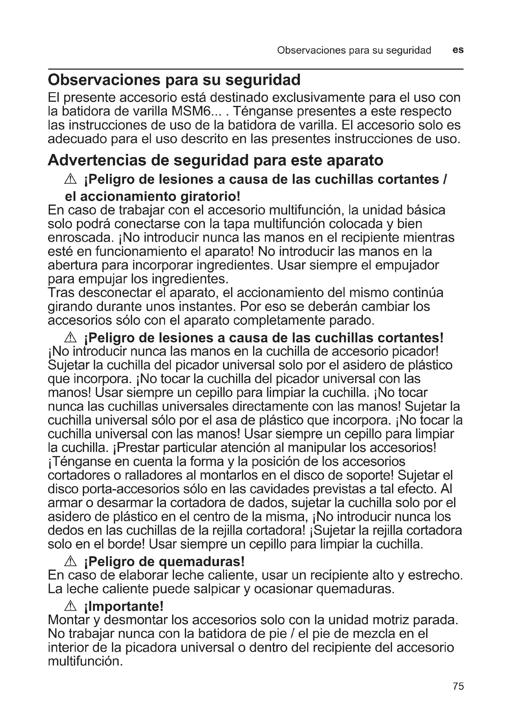 Observaciones para su seguridad El presente accesorio está destinado exclusivamente para el uso con la batidora de varilla MSM6... . Ténganse presentes a este respecto las instrucciones de uso de la batidora de varilla. El accesorio solo es adecuado para el uso descrito en las presentes instrucciones de uso. Advertencias de seguridad para este aparato A ¡Peligro de lesiones a causa de las cuchillas cortantes / el accionamiento giratorio! En caso de trabajar con el accesorio multifunción, la unidad básica solo podrá conectarse con la tapa multifunción colocada y bien enroscada. ¡No introducir nunca las manos en el recipiente mientras esté en funcionamiento el aparato! No introducir las manos en la abertura para incorporar ingredientes. Usar siempre el empujador para empujar los ingredientes. Tras desconectar el aparato, el accionamiento del mismo continúa girando durante unos instantes. Por eso se deberán cambiar los accesorios sólo con el aparato completamente parado. A ¡Peligro de lesiones a causa de las cuchillas cortantes! ¡No introducir nunca las manos en la cuchilla de accesorio picador! Sujetar la cuchilla del picador universal solo por el asidero de plástico que incorpora. ¡No tocar la cuchilla del picador universal con las manos! Usar siempre un cepillo para limpiar la cuchilla. ¡No tocar nunca las cuchillas universales directamente con las manos! Sujetar la cuchilla universal sólo por el asa de plástico que incorpora. ¡No tocar la cuchilla universal con las manos! Usar siempre un cepillo para limpiar la cuchilla. ¡Prestar particular atención al manipular los accesorios! ¡Ténganse en cuenta la forma y la posición de los accesorios cortadores o ralladores al montarlos en el disco de soporte! Sujetar el disco porta-accesorios sólo en las cavidades previstas a tal efecto. Al armar o desarmar la cortadora de dados, sujetar la cuchilla solo por el asidero de plástico en el centro de la misma, ¡No introducir nunca los dedos en las cuchillas de la rejilla cortadora! ¡Sujetar la rejilla cortadora solo en el borde! Usar siempre un cepillo para limpiar la cuchilla. A ¡Peligro de quemaduras! En caso de elaborar leche caliente, usar un recipiente alto y estrecho. La leche caliente puede salpicar y ocasionar quemaduras. A ¡Importante! Montar y desmontar los accesorios solo con la unidad motriz parada. No trabajar nunca con la batidora de pie / el pie de mezcla en el interior de la picadora universal o dentro del recipiente del accesorio multifunción.76 Accesorio picador universal