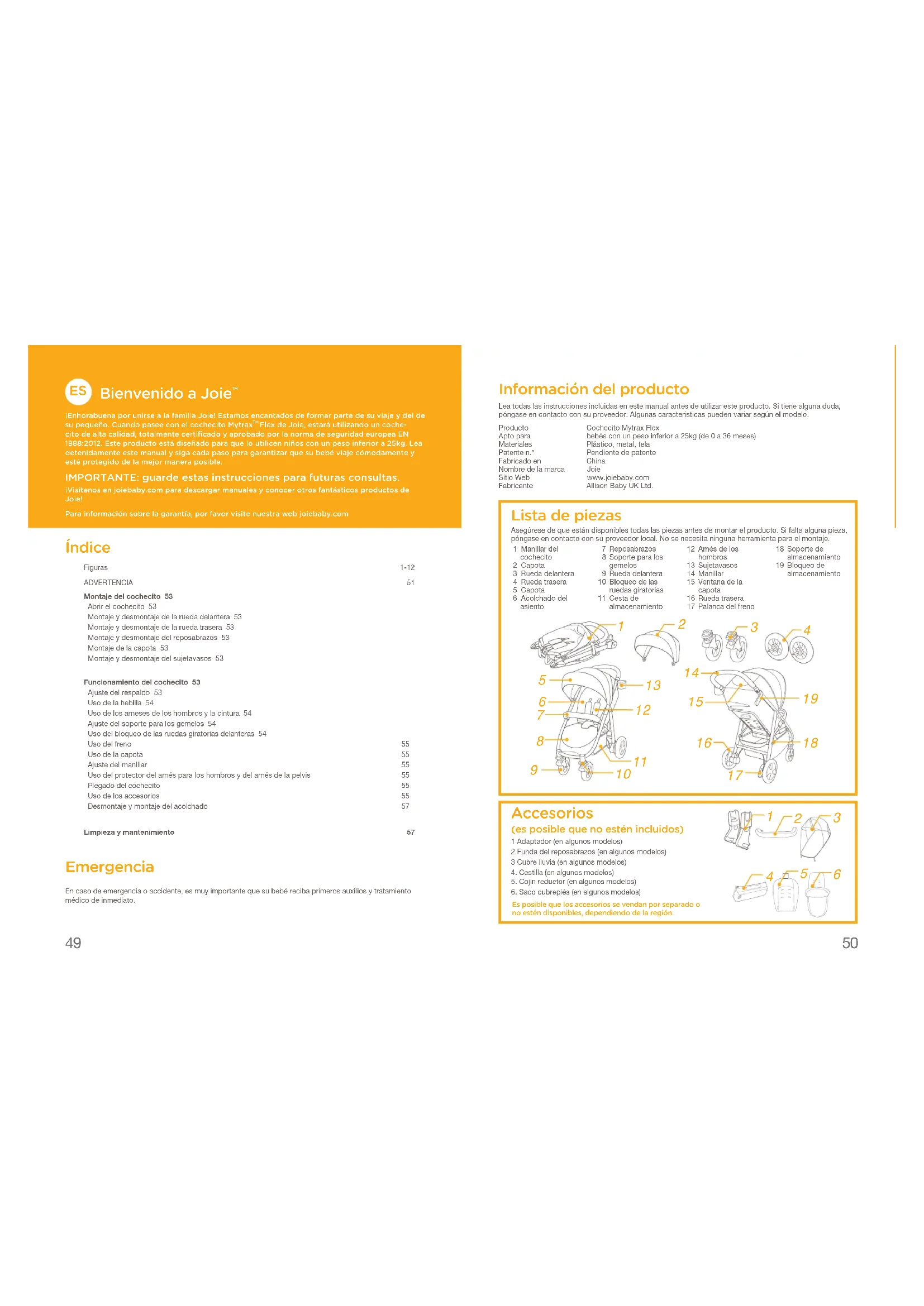 ¡Enhorabuena por unirse a la familia Joie! Estamos encantados de formar parte de su viaje y del de su pequeño. Cuando pasee con el cochecito Mytrax Flex de Joie, estará utilizando un coche-cito de alta calidad, totalmente certificado y aprobado por la norma de seguridad europea EN 1888:2012. Este producto está diseñado para que lo utilicen niños con un peso inferior a 25kg. Lea detenidamente este manual y siga cada paso para garantizar que su bebé viaje cómodamente y esté protegido de la mejor manera posible. IMPORTANTE: guarde estas instrucciones para futuras consultas. ¡Visítenos en joiebaby.com para descargar manuales y conocer otros fantásticos productos de Joie!Para información sobre la garantía, por favor visite nuestra web joiebaby.com Índice Figuras 1-12ADVERTENCIA 51Montaje del cochecito 53 Abrir el cochecito 53 Montaje y desmontaje de la rueda delantera 53 Montaje y desmontaje de la rueda trasera 53 Montaje y desmontaje del reposabrazos 53 Montaje de la capota 53 Montaje y desmontaje del sujetavasos 53 Funcionamiento del cochecito 53 Ajuste del respaldo 53 Uso de la hebilla 54 Uso de los arneses de los hombros y la cintura 54 Ajuste del soporte para los gemelos 54 Uso del bloqueo de las ruedas giratorias delanteras 54 Uso del freno 55 Uso de la capota 55 Ajuste del manillar 55 Uso del protector del arnés para los hombros y del arnés de la pelvis 55 Plegado del cochecito 55 Uso de los accesorios 55 Desmontaje y montaje del acolchado 57 Limpieza y mantenimiento 57 Emergencia En caso de emergencia o accidente, es muy importante que su bebé reciba primeros auxilios y tratamiento médico de inmediato. Información del producto Lea todas las instrucciones incluidas en este manual antes de utilizar este producto. Si tiene alguna duda, póngase en contacto con su proveedor. Algunas características pueden variar según el modelo.Producto Cochecito Mytrax FlexApto para bebés con un peso inferior a 25kg (de 0 a 36 meses)Materiales Plástico, metal, telaPatente n.º Pendiente de patenteFabricado en ChinaNombre de la marca JoieSitio Web www.joiebaby.comFabricante Allison Baby UK Ltd. 1 Manillar del cochecito 2 Capota 3 Rueda delantera 4 Rueda trasera 5 Capota 6 Acolchado del asiento 7 Reposabrazos 8 Soporte para los gemelos 9 Rueda delantera10 Bloqueo de las ruedas giratorias11 Cesta de almacenamiento12 Arnés de los hombros13 Sujetavasos14 Manillar15 Ventana de la capota16 Rueda trasera17 Palanca del freno18 Soporte de almacenamiento19 Bloqueo de almacenamiento Lista de piezas Asegúrese de que están disponibles todas las piezas antes de montar el producto. Si falta alguna pieza, póngase en contacto con su proveedor local. No se necesita ninguna herramienta para el montaje. Accesorios (es posible que no estén incluidos) 1 Adaptador (en algunos modelos)2 Funda del reposabrazos (en algunos modelos)3 Cubre lluvia (en algunos modelos)4. Cestilla (en algunos modelos)5. Cojín reductor (en algunos modelos)6. Saco cubrepiés (en algunos modelos)Es posible que los accesorios se vendan por separado o no estén disponibles, dependiendo de la región.