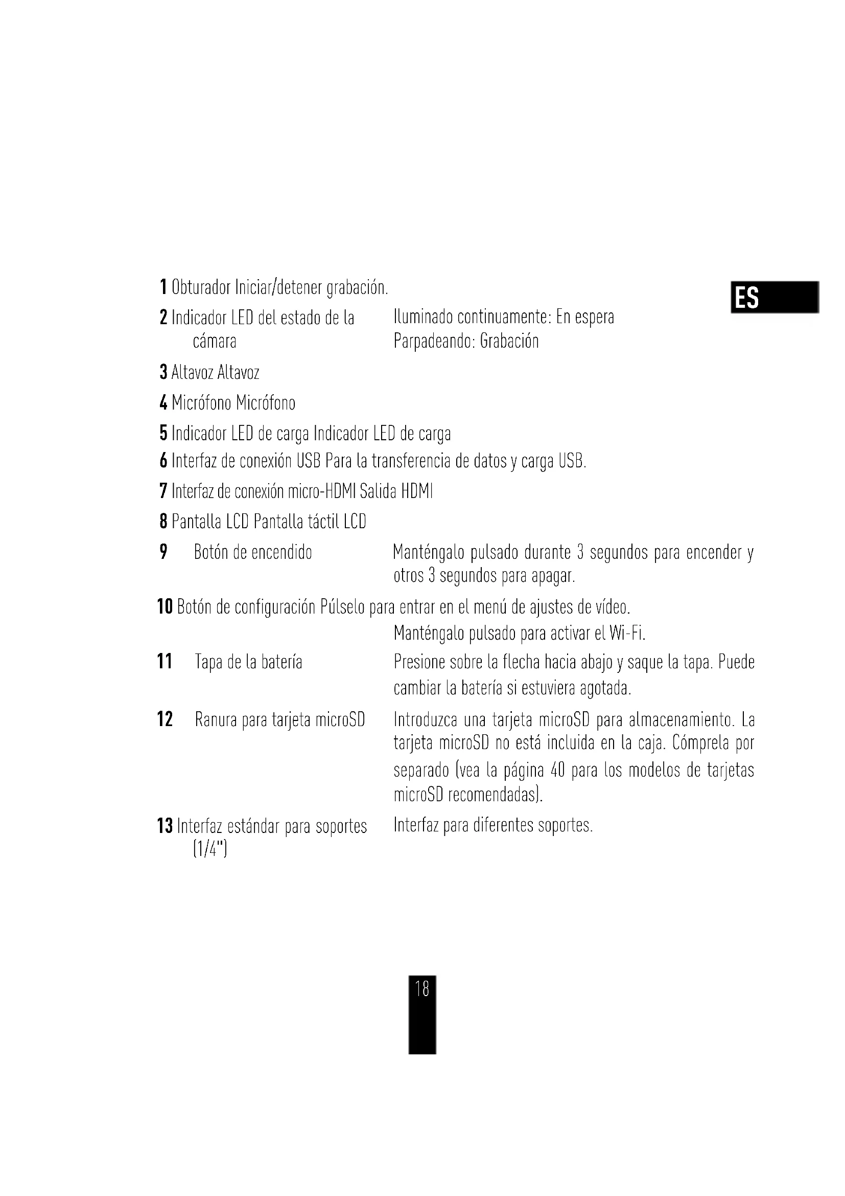 17ES 1 Obturador Iniciar/detener grabación. 2 Indicador LED del estado de la cámara Iluminado continuamente: En espera Parpadeando: Grabación 3 Altavoz Altavoz 4 Micrófono Micrófono 5 Indicador LED de carga Indicador LED de carga 6 Interfaz de conexión USB Para la transferencia de datos y carga USB. 7 Interfaz de conexión micro-HDMI Salida HDMI 8 Pantalla LCD Pantalla táctil LCD 9 Botón de encendido Manténgalo pulsado durante 3 segundos para encender y otros 3 segundos para apagar. 10 Botón de configuración Púlselo para entrar en el menú de ajustes de vídeo. Manténgalo pulsado para activar el Wi-Fi. 11 Tapa de la batería Presione sobre la flecha hacia abajo y saque la tapa. Puede cambiar la batería si estuviera agotada. 12 Ranura para tarjeta microSD Introduzca una tarjeta microSD para almacenamiento. La tarjeta microSD no está incluida en la caja. Cómprela por separado (vea la página 40 para los modelos de tarjetas microSD recomendadas). 13 Interfaz estándar para soportes (1/4") Interfaz para diferentes soportes. 18Funcionamiento Paso 1 Saque la cámara. Cuando use la cámara por primera vez, saque la cámara de su carcasa para cargarla e introducir la tarjeta microSD. Introduzca la tarjeta microSD en la ranura para la tarjeta microSD. 19ES Paso 2 Cargar la cámara.
