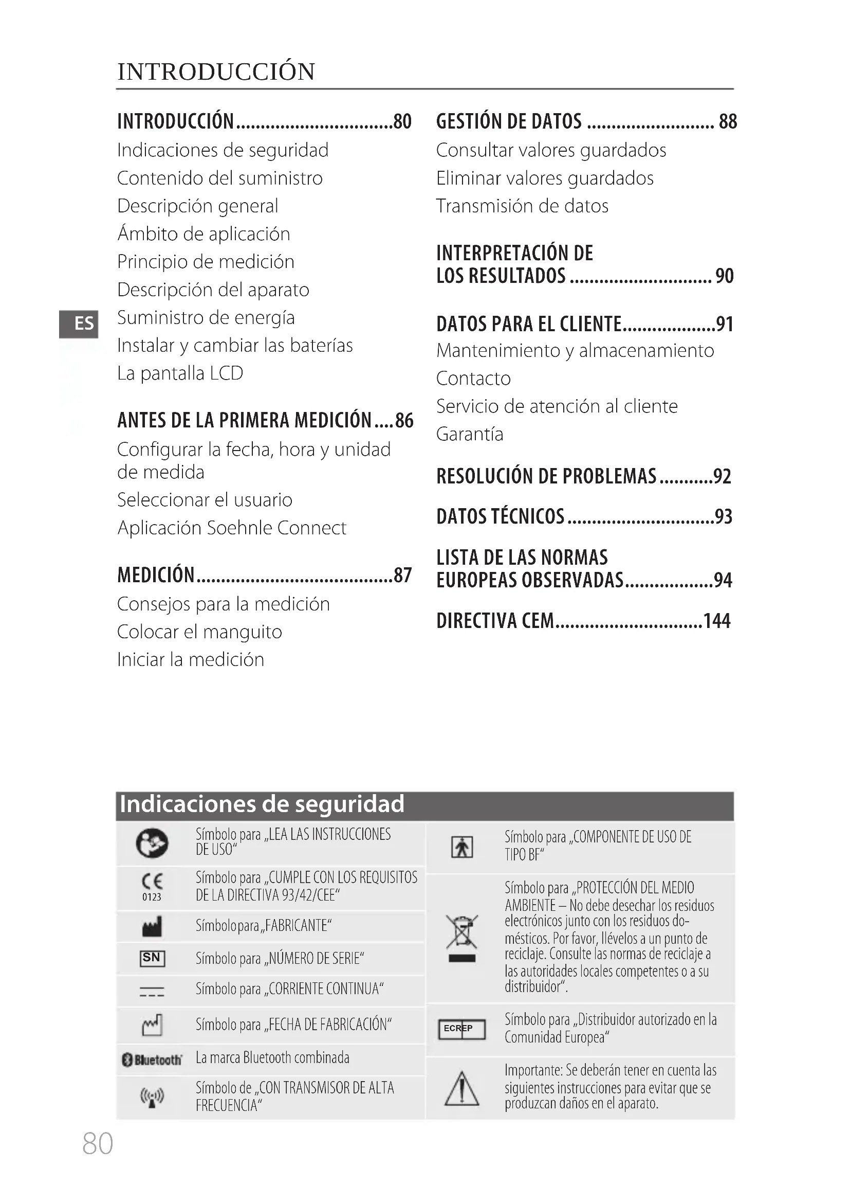 EUROPEAS OBSERVADAS .................. 94 DIRECTIVA CEM .............................. 144 Símbolo para „LEA LAS INSTRUCCIONES DE USO“0123Símbolo para „CUMPLE CON LOS REQUISITOS DE LA DIRECTIVA 93/42/CEE“Símbolo para „FABRICANTE“ Símbolo para „NÚMERO DE SERIE“Símbolo para „CORRIENTE CONTINUA“Símbolo para „FECHA DE FABRICACIÓN“La marca Bluetooth combinadaSímbolo de „CON TRANSMISOR DE ALTA FRECUENCIA“Símbolo para „COMPONENTE DE USO DE TIPO BF“Símbolo para „PROTECCIÓN DEL MEDIO AMBIENTE – No debe desechar los residuos electrónicos junto con los residuos do mésticos. Por favor, llévelos a un punto de reciclaje. Consulte las normas de reciclaje a las autoridades locales competentes o a su distribuidor“.EC REPSímbolo para „Distribuidor autorizado en la Comunidad Europea“Importante: Se deberán tener en cuenta las siguientes instrucciones para evitar que se produzcan daños en el aparato. Indicaciones de seguridadES