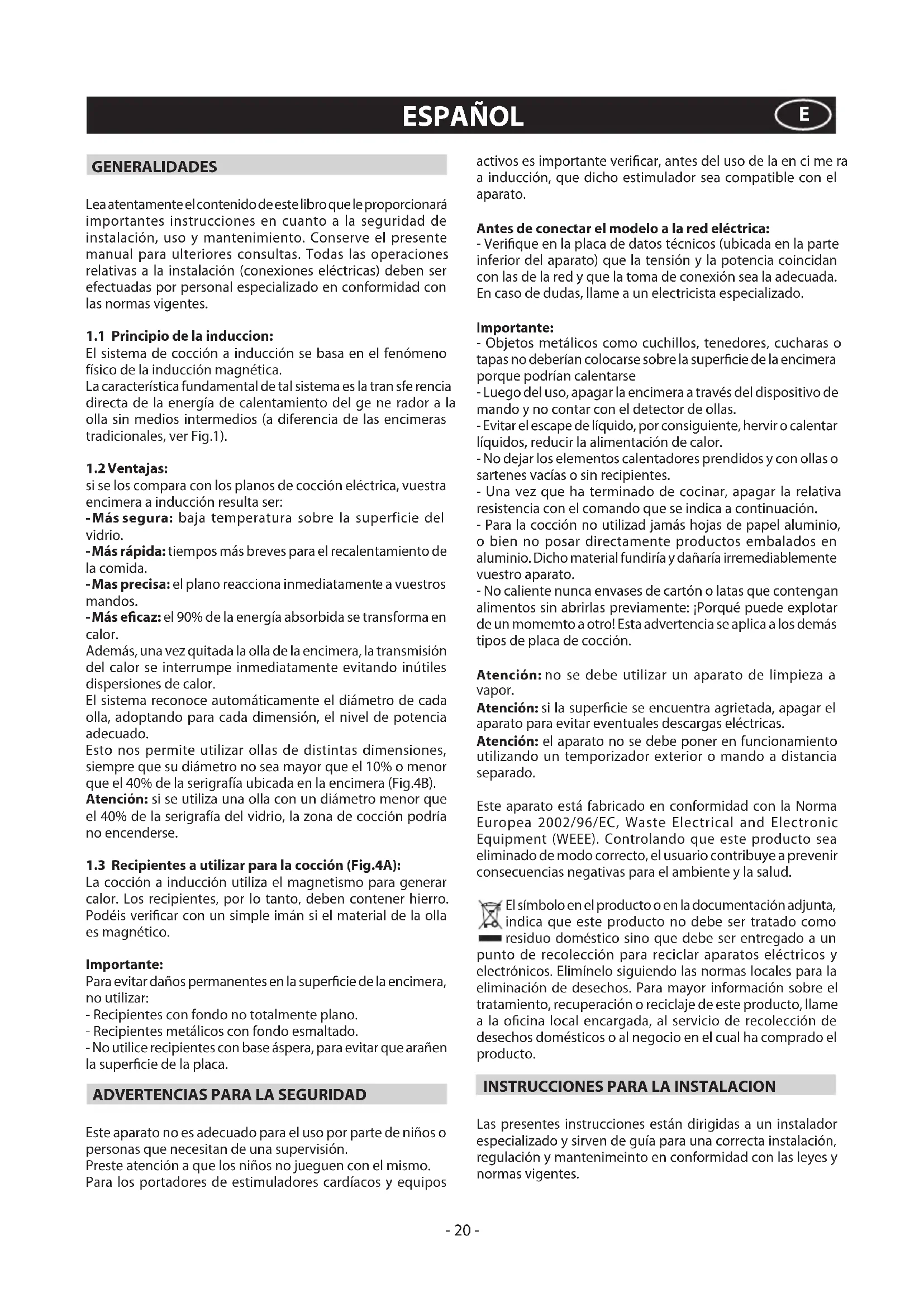 Este aparato no es adecuado para el uso por parte de niños o personas que necesitan de una supervisión. Preste atención a que los niños no jueguen con el mismo. Para los portadores de estimuladores cardíacos y equipos activos es importante vericar, antes del uso de la en ci me ra a inducción, que dicho estimulador sea compatible con el aparato. Antes de conectar el modelo a la red eléctrica: - Verique en la placa de datos técnicos (ubicada en la parte inferior del aparato) que la tensión y la potencia coincidan con las de la red y que la toma de conexión sea la adecuada. En caso de dudas, llame a un electricista especializado. Importante: - Objetos metálicos como cuchillos, tenedores, cucharas o tapas no deberían colocarse sobre la supercie de la encimera porque podrían calentarse - Luego del uso, apagar la encimera a través del dispositivo de mando y no contar con el detector de ollas. - Evitar el escape de líquido, por consiguiente, hervir o calentar líquidos, reducir la alimentación de calor. - No dejar los elementos calentadores prendidos y con ollas o sartenes vacías o sin recipientes. - Una vez que ha terminado de cocinar, apagar la relativa resistencia con el comando que se indica a continuación. - Para la cocción no utilizad jamás hojas de papel aluminio, o bien no posar directamente productos embalados en aluminio. Dicho material fundiría y dañaría irremediablemente vuestro aparato. - No caliente nunca envases de cartón o latas que contengan alimentos sin abrirlas previamente: ¡Porqué puede explotar de un momemto a otro! Esta advertencia se aplica a los demás tipos de placa de cocción. Atención: no se debe utilizar un aparato de limpieza a vapor. Atención: si la supercie se encuentra agrietada, apagar el aparato para evitar eventuales descargas eléctricas. Atención: el aparato no se debe poner en funcionamiento utilizando un temporizador exterior o mando a distancia separado. Este aparato está fabricado en conformidad con la Norma Europea 2002/96/EC, Waste Electrical and Electronic Equipment (WEEE). Controlando que este producto sea eliminado de modo correcto, el usuario contribuye a prevenir consecuencias negativas para el ambiente y la salud. El símbolo en el producto o en la documentación adjunta, indica que este producto no debe ser tratado como residuo doméstico sino que debe ser entregado a un punto de recolección para reciclar aparatos eléctricos y electrónicos. Elimínelo siguiendo las normas locales para la eliminación de desechos. Para mayor información sobre el tratamiento, recuperación o reciclaje de este producto, llame a la ocina local encargada, al servicio de recolección de desechos domésticos o al negocio en el cual ha comprado el producto.