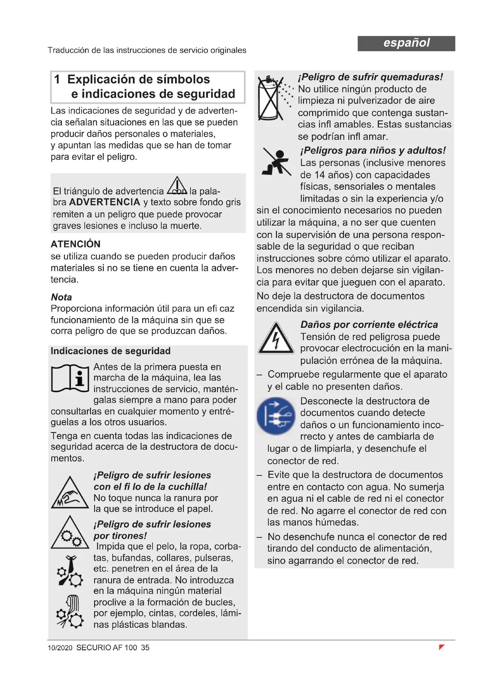 6–7 5–6 Peso 7,6 kg Larghezza di entrata 225 mm Velocità di taglio 45 mm/s Collegamento 220-240 V / 50/60 Hz 110-130 V / 50/60 Hz Potenza con numero di fogli max 185 W (EU) / 160 W (US) Consumo energetico in stand-by < 2 Wh Tempo di funzionamento numero di fogli max fi no a 15 min Tempo di funzionamento foglio singolo fi no a 20 min Condizioni ambientali durante il funzionamento: temperatura umidità relativa dell’aria altezza sopra il l.d.m. da -10 °C a +25 °C max 90%, senza condensa max 2.000 m Dimensioni L x P x H (mm) 375 x 260 x 620 Volume del contenitore per materiali di taglio 25 l Livello di pressione acustica di emissione (corsa a vuoto / carico) 55-60 dB / 65 -70 dB Livello di potenza sonora valutato A (LWAd con funzionamento a vuoto) 71 dB10/2020 SECURIO AF 100 35 español Traducción de las instrucciones de servicio originales 1 Explicación de símbolos e indicaciones de seguridad Las indicaciones de seguridad y de adverten- cia señalan situaciones en las que se pueden producir daños personales o materiales, y apuntan las medidas que se han de tomar para evitar el peligro. Nota Proporciona información útil para un efi caz funcionamiento de la máquina sin que se corra peligro de que se produzcan daños. El triángulo de advertencia con la pala- bra ADVERTENCIA y texto sobre fondo gris remiten a un peligro que puede provocar graves lesiones e incluso la muerte. ATENCIÓN se utiliza cuando se pueden producir daños materiales si no se tiene en cuenta la adver- tencia. Indicaciones de seguridad Antes de la primera puesta en marcha de la máquina, lea las instrucciones de servicio, mantén- galas siempre a mano para poder consultarlas en cualquier momento y entré- guelas a los otros usuarios. Tenga en cuenta todas las indicaciones de seguridad acerca de la destructora de docu- mentos. ¡Peligro de sufrir lesiones con el fi lo de la cuchilla! No toque nunca la ranura por la que se introduce el papel. ¡Peligro de sufrir lesiones por tirones! Impida que el pelo, la ropa, corba- tas, bufandas, collares, pulseras, etc. penetren en el área de la ranura de entrada. No introduzca en la máquina ningún material proclive a la formación de bucles, por ejemplo, cintas, cordeles, lámi- nas plásticas blandas. ¡Peligro de sufrir quemaduras! No utilice ningún producto de limpieza ni pulverizador de aire comprimido que contenga sustan- cias infl amables. Estas sustancias se podrían infl amar. ¡Peligros para niños y adultos! Las personas (inclusive menores de 14 años) con capacidades físicas, sensoriales o mentales limitadas o sin la experiencia y/o sin el conocimiento necesarios no pueden utilizar la máquina, a no ser que cuenten con la supervisión de una persona respon- sable de la seguridad o que reciban instrucciones sobre cómo utilizar el aparato. Los menores no deben dejarse sin vigilan- cia para evitar que jueguen con el aparato. No deje la destructora de documentos encendida sin vigilancia. Daños por corriente eléctrica Tensión de red peligrosa puede provocar electrocución en la mani- pulación errónea de la máquina. – Compruebe regularmente que el aparato y el cable no presenten daños. Desconecte la destructora de documentos cuando detecte daños o un funcionamiento inco- rrecto y antes de cambiarla de lugar o de limpiarla, y desenchufe el conector de red. – Evite que la destructora de documentos entre en contacto con agua. No sumerja en agua ni el cable de red ni el conector de red. No agarre el conector de red con las manos húmedas. – No desenchufe nunca el conector de red tirando del conducto de alimentación, sino agarrando el conector de red.36 SECURIO AF 100 10/2020 español 3 Vista general