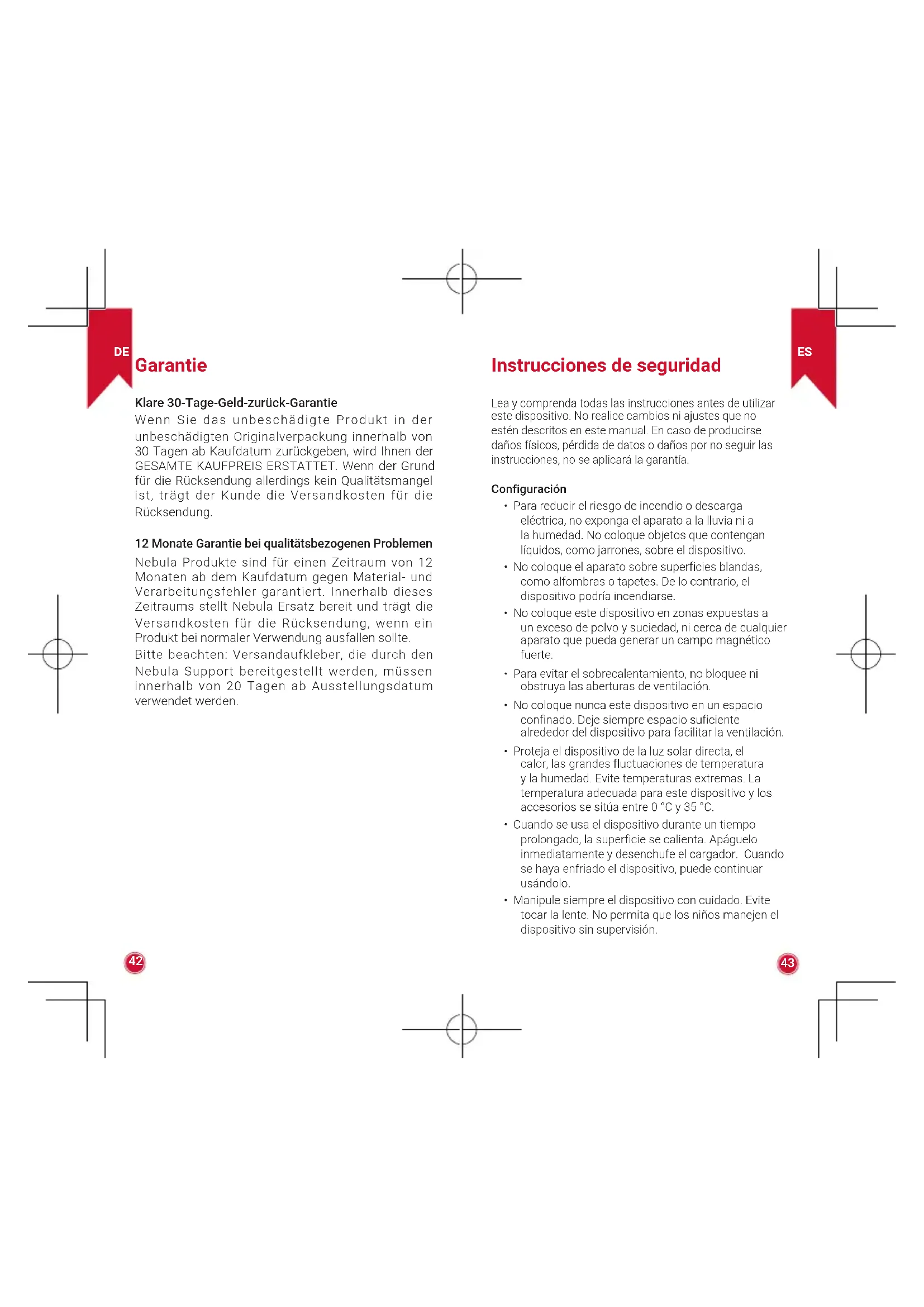 Garantía Garantía de devolución de dinero de 30 días por cualquier motivo Puede devolver el producto y el embalaje intactos en un plazo de 30 días desde la compra para recibir un REEMBOLSO COMPLETO por cualquier razón. Si el motivo de la devolución no está relacionado con la calidad, el cliente deberá pagar los gastos de envío de la devolución. 12 meses de garantía ante problemas de calidad Nebula ofrece una garantía de 12 meses a partir de la fecha de compra para cualquier defecto de material o fabricación del producto. Dentro de este periodo, Nebula proporcionará una sustitución y se hará cargo de cualquier gasto de envío relacionado con los productos que no ofrezcan un uso normal. Nota: Las etiquetas de envío suministradas deben usarse en un plazo de 20 días a partir de su fecha de emisión por parte del equipo de asistencia de Nebula. Consignes de sécurité Veuillez lire et comprendre toutes les instructions avant d'utiliser cet appareil. N'apportez pas de modifications ou de paramètres qui ne sont pas décrits dans ce manuel. Si des dommages corporels, des pertes de données ou des dommages sont causés par le non-respect des instructions, la garantie ne s'applique pas. Configuration