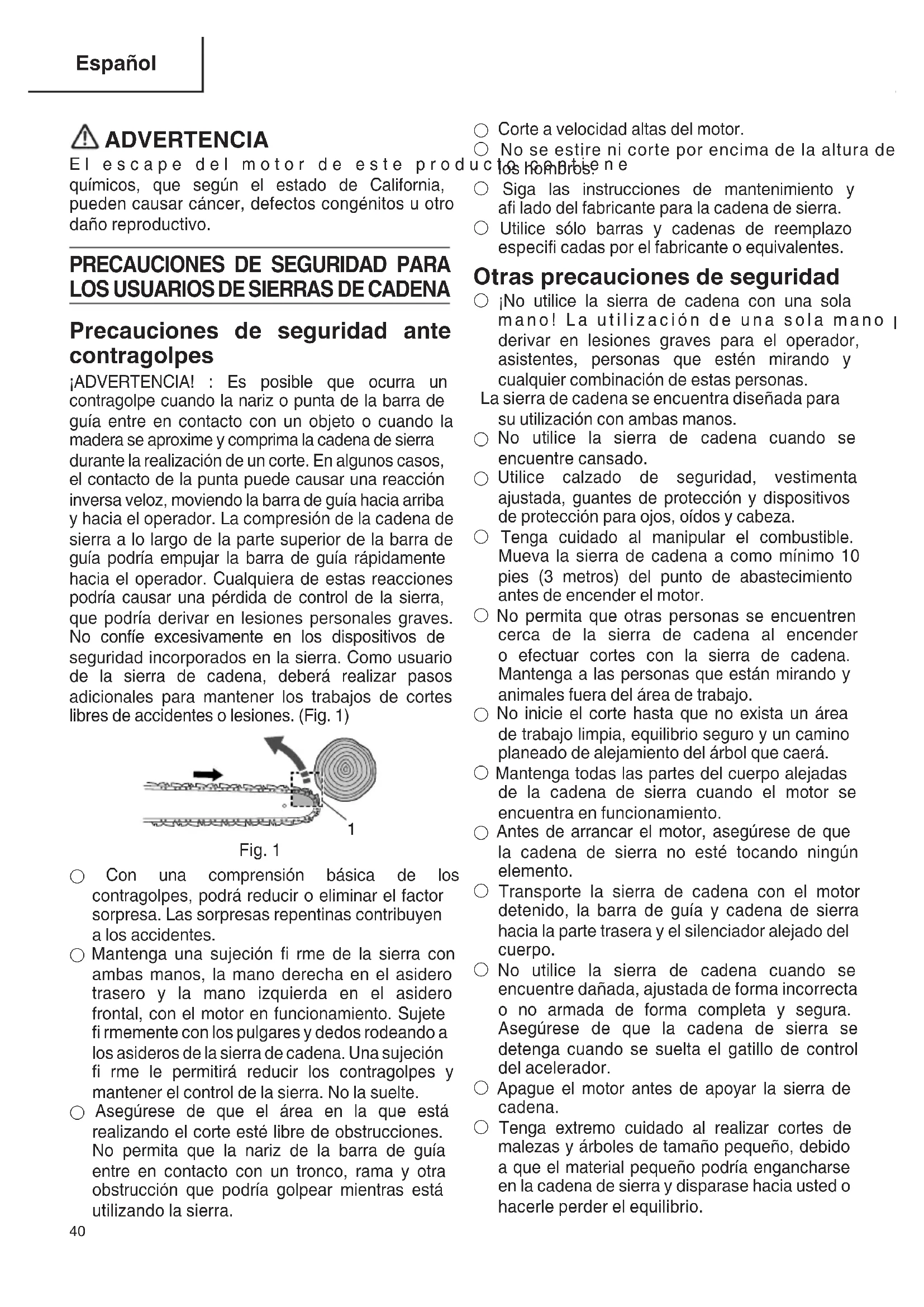 Precauciones de seguridad ante contragolpes ¡ADVERTENCIA! : Es posible que ocurra un contragolpe cuando la nariz o punta de la barra de guía entre en contacto con un objeto o cuando la madera se aproxime y comprima la cadena de sierra durante la realización de un corte. En algunos casos, el contacto de la punta puede causar una reacción inversa veloz, moviendo la barra de guía hacia arriba y hacia el operador. La compresión de la cadena de sierra a lo largo de la parte superior de la barra de guía podría empujar la barra de guía rápidamente hacia el operador. Cualquiera de estas reacciones podría causar una pérdida de control de la sierra, que podría derivar en lesiones personales graves. No confíe excesivamente en los dispositivos de seguridad incorporados en la sierra. Como usuario de la sierra de cadena, deberá realizar pasos adicionales para mantener los trabajos de cortes libres de accidentes o lesiones. (Fig. 1)