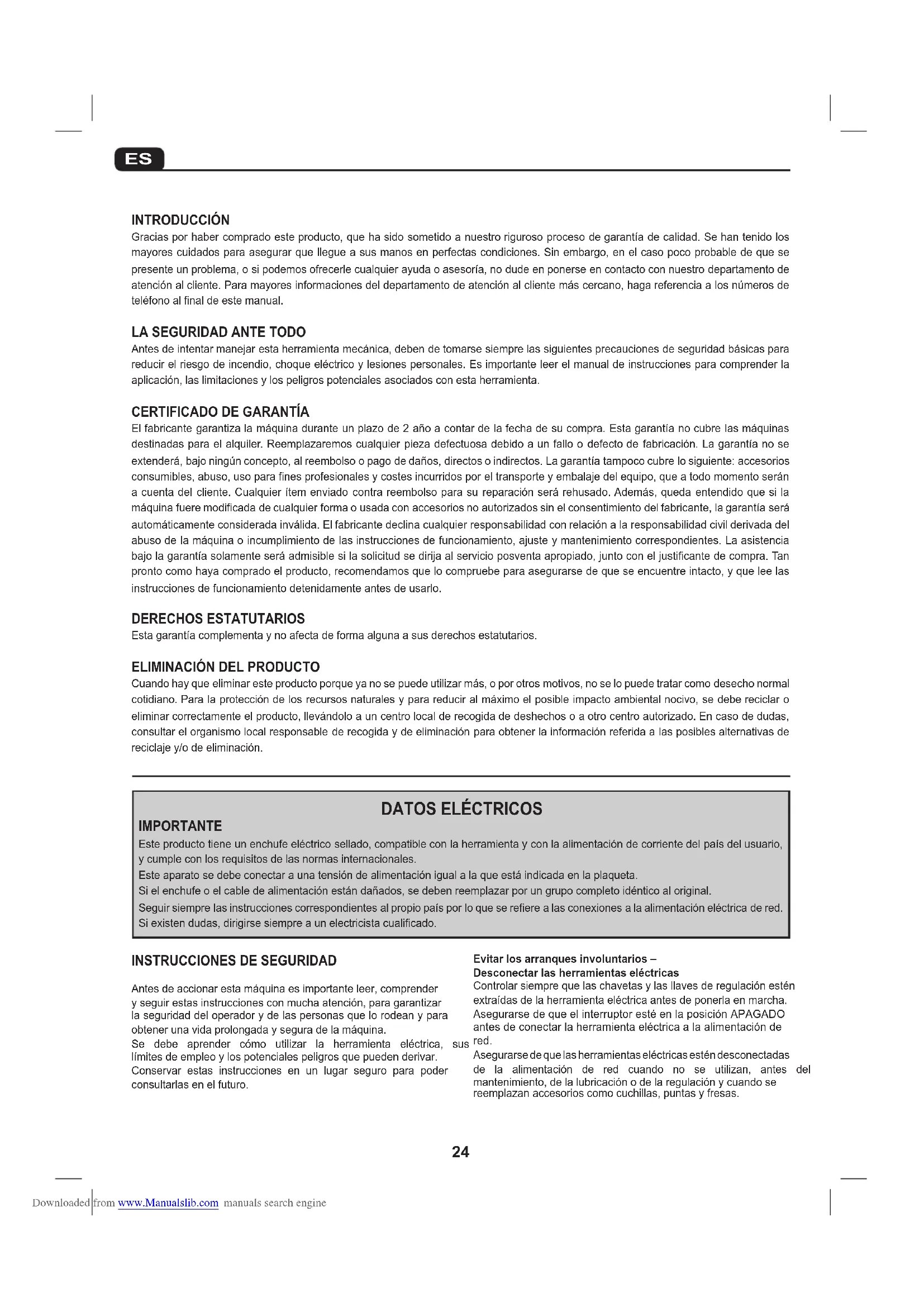Elfabricantegarantizalamáquinaduranteunplazode2añoacontardelafechadesucompra.Estagarantíanocubrelasmáquinas destinadasparaelalquiler.Reemplazaremoscualquierpiezadefectuosadebidoaunfalloodefectodefabricación.Lagarantíanose extenderá,bajoningúnconcepto,alreembolsoopagodedaños,directosoindirectos.Lagarantíatampococubrelosiguiente:accesorios consumibles,abuso,usoparafinesprofesionalesycostesincurridosporeltransporteyembalajedelequipo,queatodomomentoserán acuentadelcliente.Cualquierítemenviadocontrareembolsoparasureparaciónserárehusado.Además,quedaentendidoquesila máquinafueremodificadadecualquierformaousadaconaccesoriosnoautorizadossinelconsentimientodelfabricante,lagarantíaserá automáticamenteconsideradainválida.Elfabricantedeclinacualquierresponsabilidadconrelaciónalaresponsabilidadcivilderivadadel abusodelamáquinaoincumplimientodelasinstruccionesdefuncionamiento,ajusteymantenimientocorrespondientes.Laasistencia bajolagarantíasolamenteseráadmisiblesilasolicitudsedirijaalservicioposventaapropiado,juntoconeljustificantedecompra.Tan pronto como haya comprado el producto, recomendamos que lo compruebe para asegurarse de que se encuentre intacto, y que lee las instrucciones de funcionamiento detenidamente antes de usarlo. DERECHOS ESTATUTARIOS Estagarantíacomplementaynoafectadeformaalgunaasusderechosestatutarios.