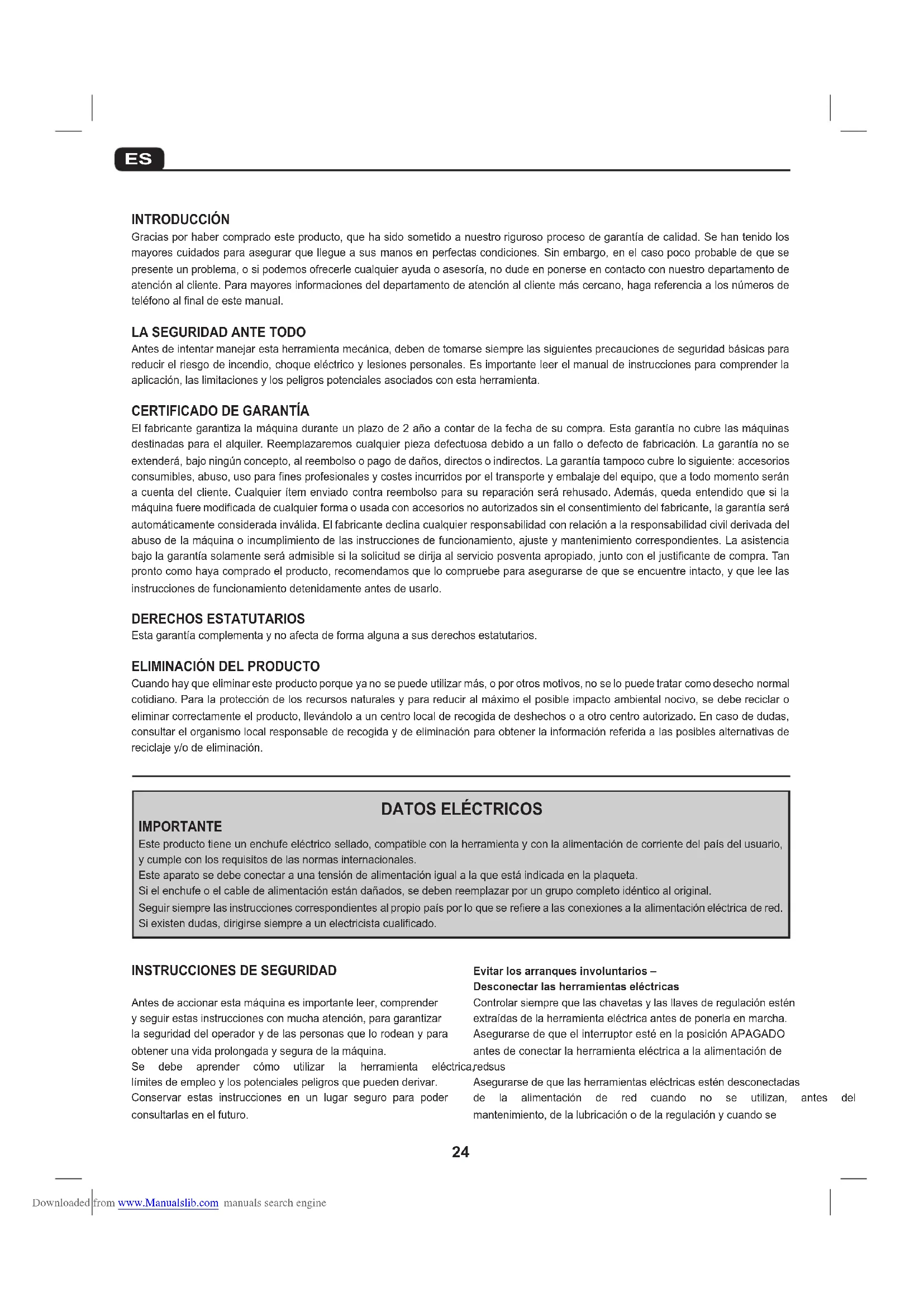 Elfabricantegarantizalamáquinaduranteunplazode2añoacontardelafechadesucompra.Estagarantíanocubrelasmáquinas destinadasparaelalquiler.Reemplazaremoscualquierpiezadefectuosadebidoaunfalloodefectodefabricación.Lagarantíanose extenderá,bajoningúnconcepto,alreembolsoopagodedaños,directosoindirectos.Lagarantíatampococubrelosiguiente:accesorios consumibles,abuso,usoparafinesprofesionalesycostesincurridosporeltransporteyembalajedelequipo,queatodomomentoserán acuentadelcliente.Cualquierítemenviadocontrareembolsoparasureparaciónserárehusado.Además,quedaentendidoquesila máquinafueremodificadadecualquierformaousadaconaccesoriosnoautorizadossinelconsentimientodelfabricante,lagarantíaserá automáticamenteconsideradainválida.Elfabricantedeclinacualquierresponsabilidadconrelaciónalaresponsabilidadcivilderivadadel abusodelamáquinaoincumplimientodelasinstruccionesdefuncionamiento,ajusteymantenimientocorrespondientes.Laasistencia bajolagarantíasolamenteseráadmisiblesilasolicitudsedirijaalservicioposventaapropiado,juntoconeljustificantedecompra.Tan pronto como haya comprado el producto, recomendamos que lo compruebe para asegurarse de que se encuentre intacto, y que lee las instruccionesdefuncionamientodetenidamenteantesdeusarlo. DERECHOS ESTATUTARIOS Estagarantíacomplementaynoafectadeformaalgunaasusderechosestatutarios.
