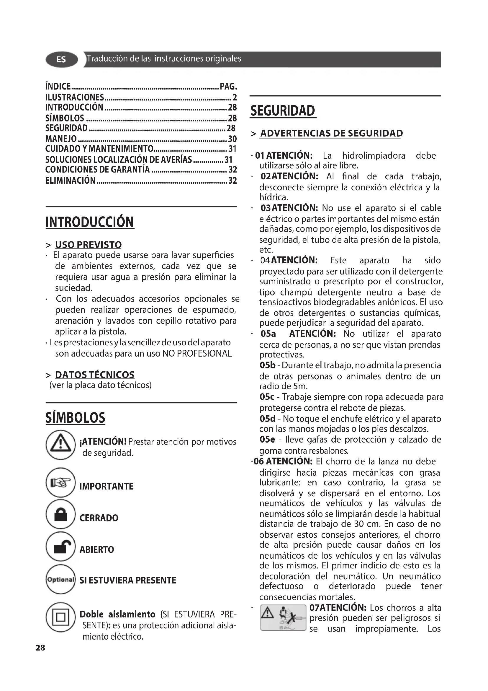 - 01 ATENCIÓN: La hidrolimpiadora debe utilizarse sólo al aire libre.