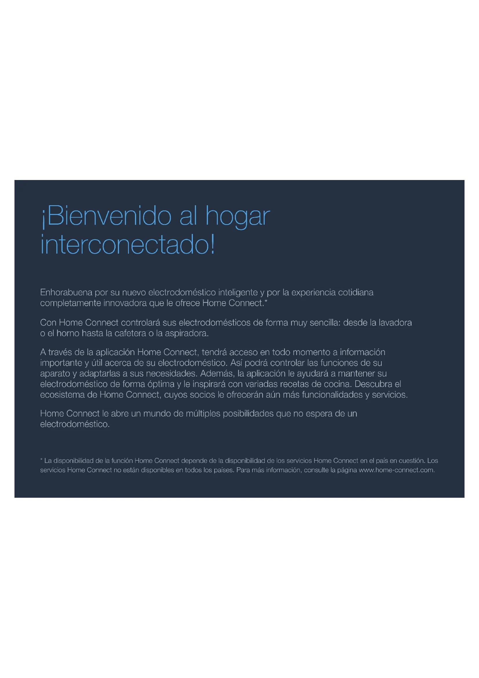 420 DE Enhorabuena por su nuevo electrodoméstico inteligente y por la experiencia cotidiana completamente innovadora que le ofrece Home Connect.* Con Home Connect controlará sus electrodomésticos de forma muy sencilla: desde la lavadora o el horno hasta la cafetera o la aspiradora. A través de la aplicación Home Connect, tendrá acceso en todo momento a información importante y útil acerca de su electrodoméstico. Así podrá controlar las funciones de su aparato y adaptarlas a sus necesidades. Además, la aplicación le ayudará a mantener su electrodoméstico de forma óptima y le inspirará con variadas recetas de cocina. Descubra el ecosistema de Home Connect, cuyos socios le ofrecerán aún más funcionalidades y servicios. Home Connect le abre un mundo de múltiples posibilidades que no espera de un electrodoméstico.