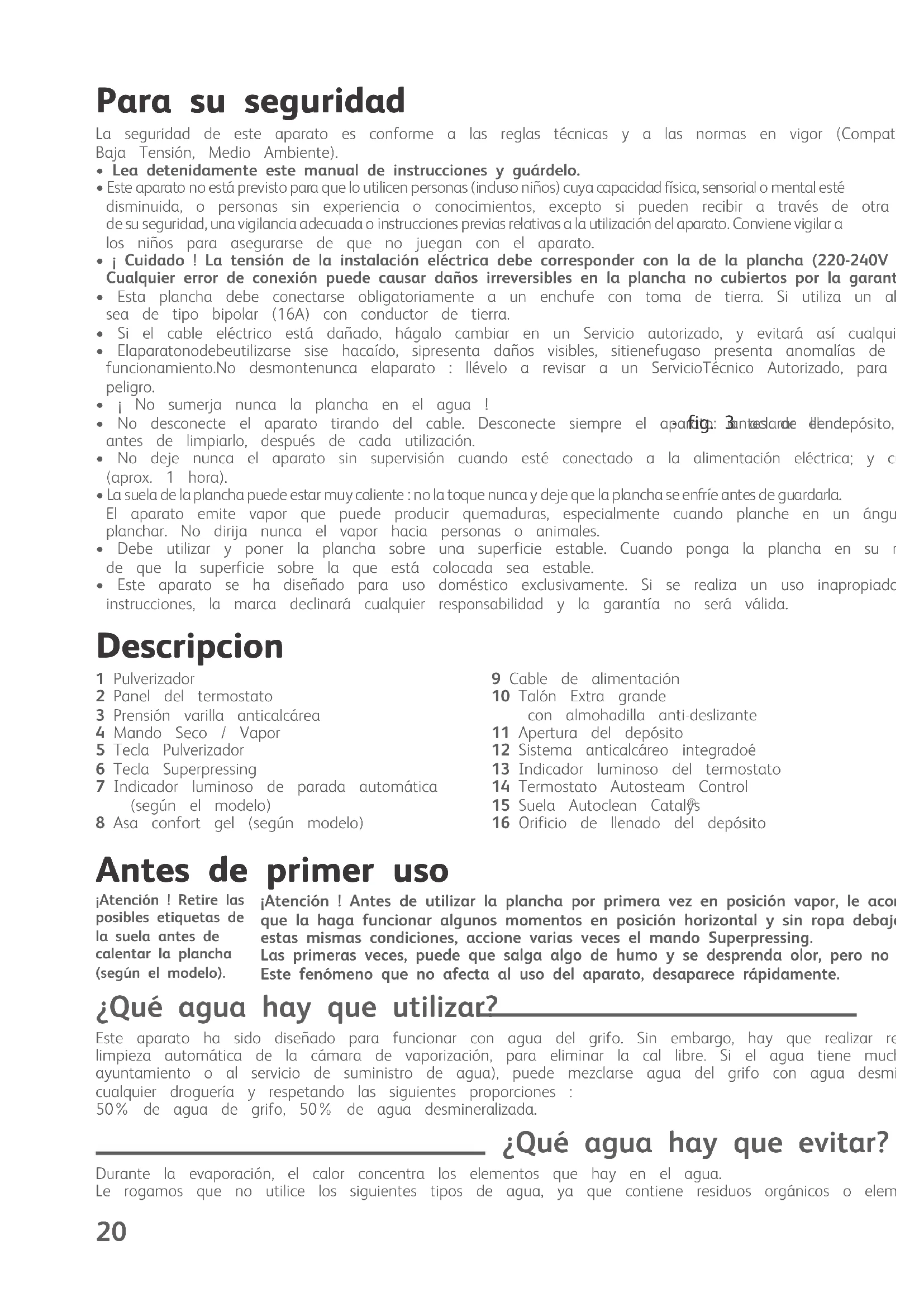 - Este aparato no está previsto para que lo utilicen personas (incluso niños) cuya capacidad física, sensorial o mental esté disminuida, o personas sin experiencia o conocimientos, excepto si pueden recibir a través de otra persona responsable de su seguridad, una vigilancia adecuada o instrucciones previas relativas a la utilización del aparato. Conviene vigilar a los niños para asegurarse de que no juegan con el aparato.• ¡ Cuidado ! La tensión de la instalación eléctrica debe corresponder con la de la plancha (220-240V a.c).Cualquier error de conexión puede causar daños irreversibles en la plancha no cubiertos por la garantía.• Esta plancha debe conectarse obligatoriamente a un enchufe con toma de tierra. Si utiliza un alargador, compruebe quesea de tipo bipolar (16A) con conductor de tierra.• Si el cable eléctrico está dañado, hágalo cambiar en un Servicio autorizado, y evitará así cualquier peligro.• Elaparatonodebeutilizarse sise hacaído, sipresenta daños visibles, sitienefugaso presenta anomalías defuncionamiento.No desmontenunca elaparato : llévelo a revisar a un ServicioTécnico Autorizado, para evitarcualquierpeligro.• ¡ No sumerja nunca la plancha en el agua !• No desconecte el aparato tirando del cable. Desconecte siempre el aparato: antes de llenar - fig. 3 o aclarar el depósito,antes de limpiarlo, después de cada utilización.• No deje nunca el aparato sin supervisión cuando esté conectado a la alimentación eléctrica; y cuando aún esté caliente(aprox. 1 hora).