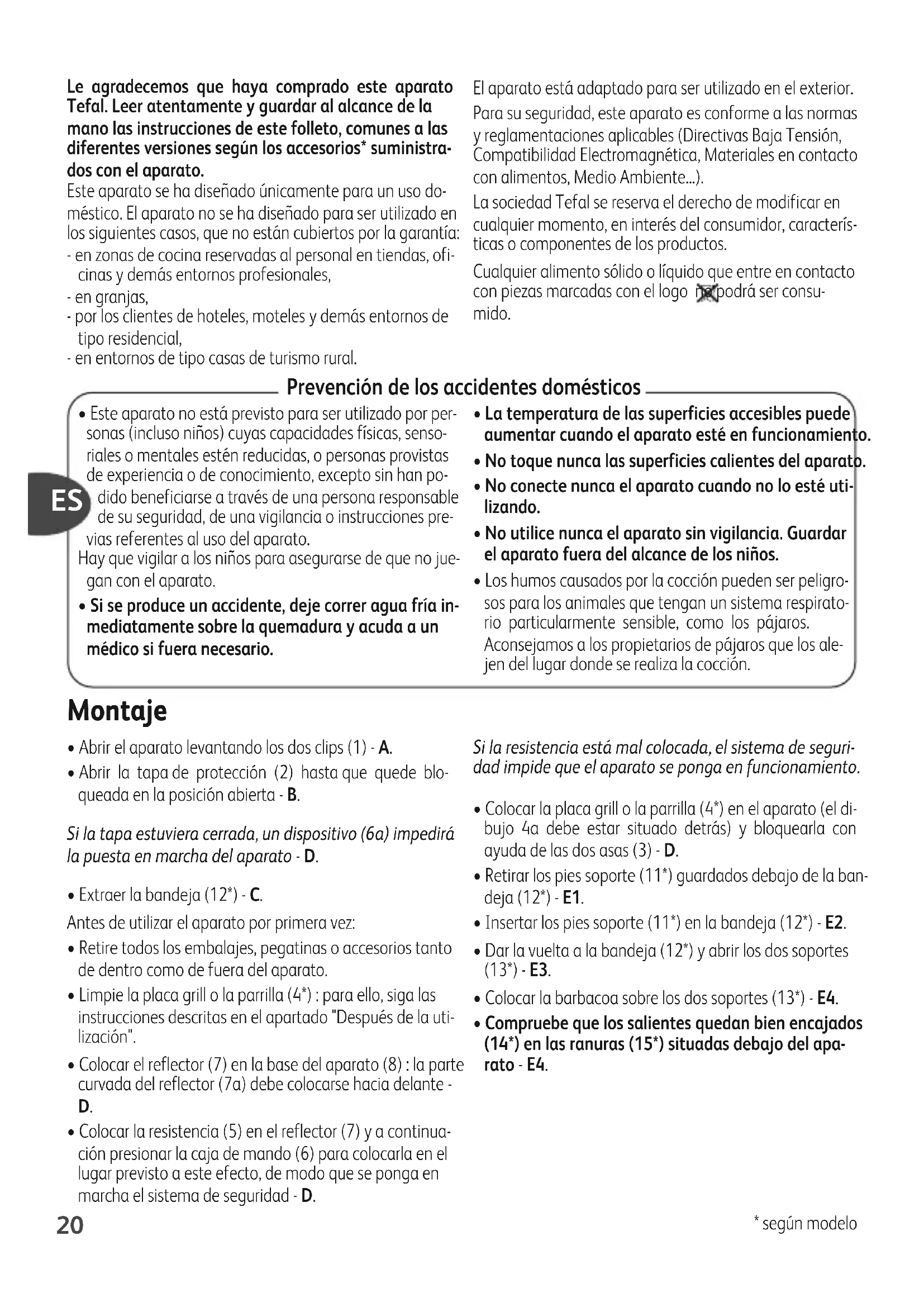 For U.K. users only: If you have any problems or queries, please contact our Customer Relations team on : HELPLINE 0845 602 1454 – UK, (01) 677 4003 - ROI – www.tefal.co.uk This product has been designed for domestic use only. Any commercial use, inappropriate use or failure to comply with the instructions, the manufacturer accepts no responsibility and the guarantee will not apply.20 Le agradecemos que haya comprado este aparato Tefal. Leer atentamente y guardar al alcance de la mano las instrucciones de este folleto, comunes a las diferentes versiones según los accesorios* suministra- dos con el aparato. Este aparato se ha diseñado únicamente para un uso do- méstico. El aparato no se ha diseñado para ser utilizado en los siguientes casos, que no están cubiertos por la garantía: - en zonas de cocina reservadas al personal en tiendas, ofi- cinas y demás entornos profesionales, - en granjas, - por los clientes de hoteles, moteles y demás entornos de tipo residencial, - en entornos de tipo casas de turismo rural. El aparato está adaptado para ser utilizado en el exterior. Para su seguridad, este aparato es conforme a las normas y reglamentaciones aplicables (Directivas Baja Tensión, Compatibilidad Electromagnética, Materiales en contacto con alimentos, Medio Ambiente...). La sociedad Tefal se reserva el derecho de modificar en cualquier momento, en interés del consumidor, caracterís- ticas o componentes de los productos. Cualquier alimento sólido o líquido que entre en contacto con piezas marcadas con el logo no podrá ser consu- mido. Prevención de los accidentes domésticos