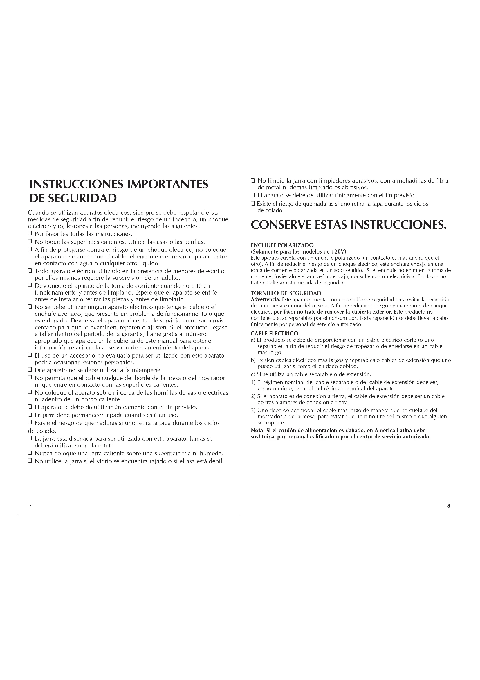 No utilice la jarra si el vidrio se encuentra rajado o si el asa está débil. INSTRUCCIONES IMPORTANTES DE SEGURIDAD CONSERVE ESTAS INSTRUCCIONES.