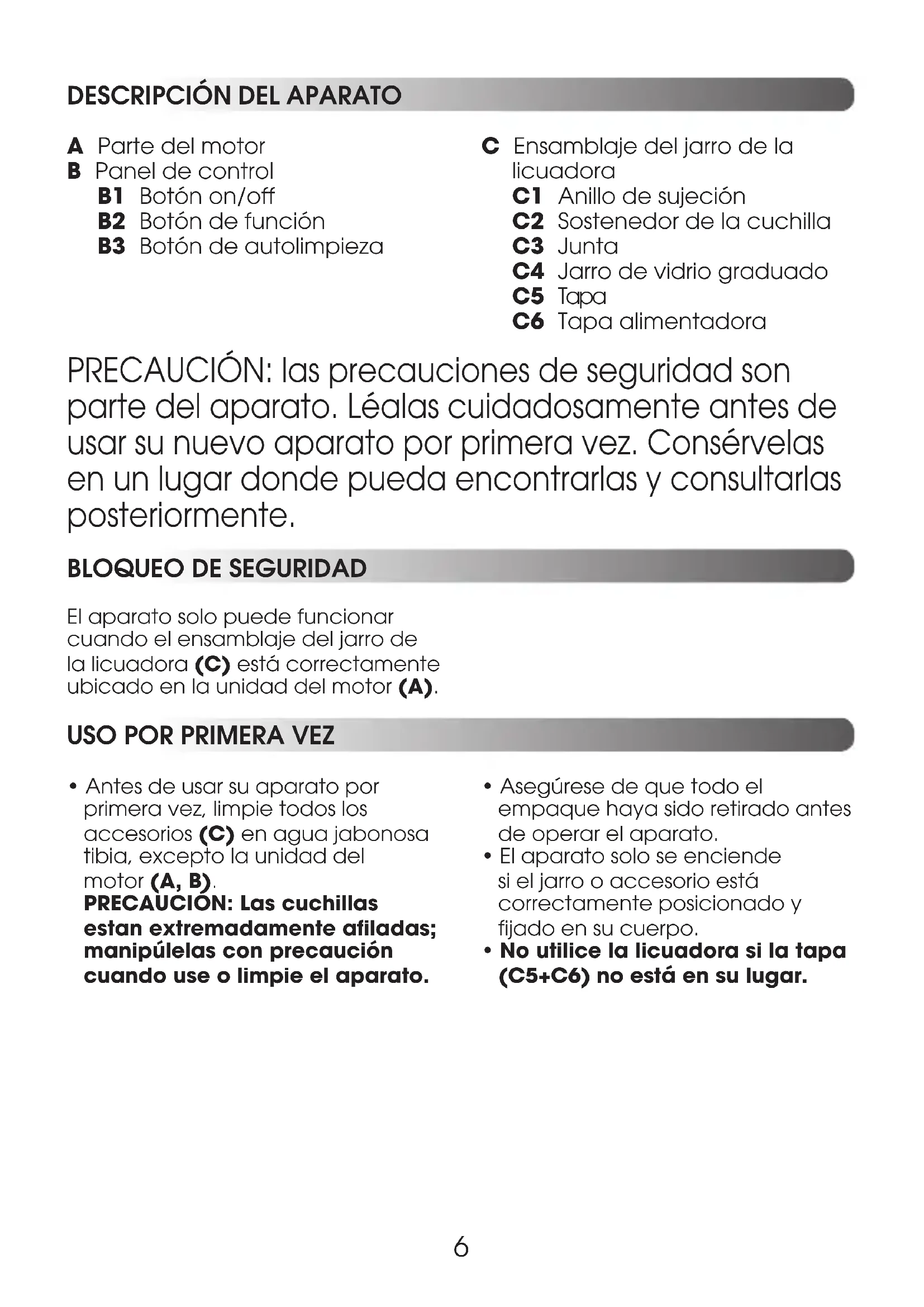 A Parte del motor B Panel de control B1 Botón on/off B2 Botón de función B3 Botón de autolimpieza C Ensamblaje del jarro de la licuadora C1 Anillo de sujeción C2 Sostenedor de la cuchilla C3 Junta C4 Jarro de vidrio graduado C5 Tapa C6 Tapa alimentadora El aparato solo puede funcionar cuando el ensamblaje del jarro de la licuadora (C) está correctamente ubicado en la unidad del motor (A). PRECAUCIÓN: las precauciones de seguridad son parte del aparato. Léalas cuidadosamente antes de usar su nuevo aparato por primera vez. Consérvelas en un lugar donde pueda encontrarlas y consultarlas posteriormente.