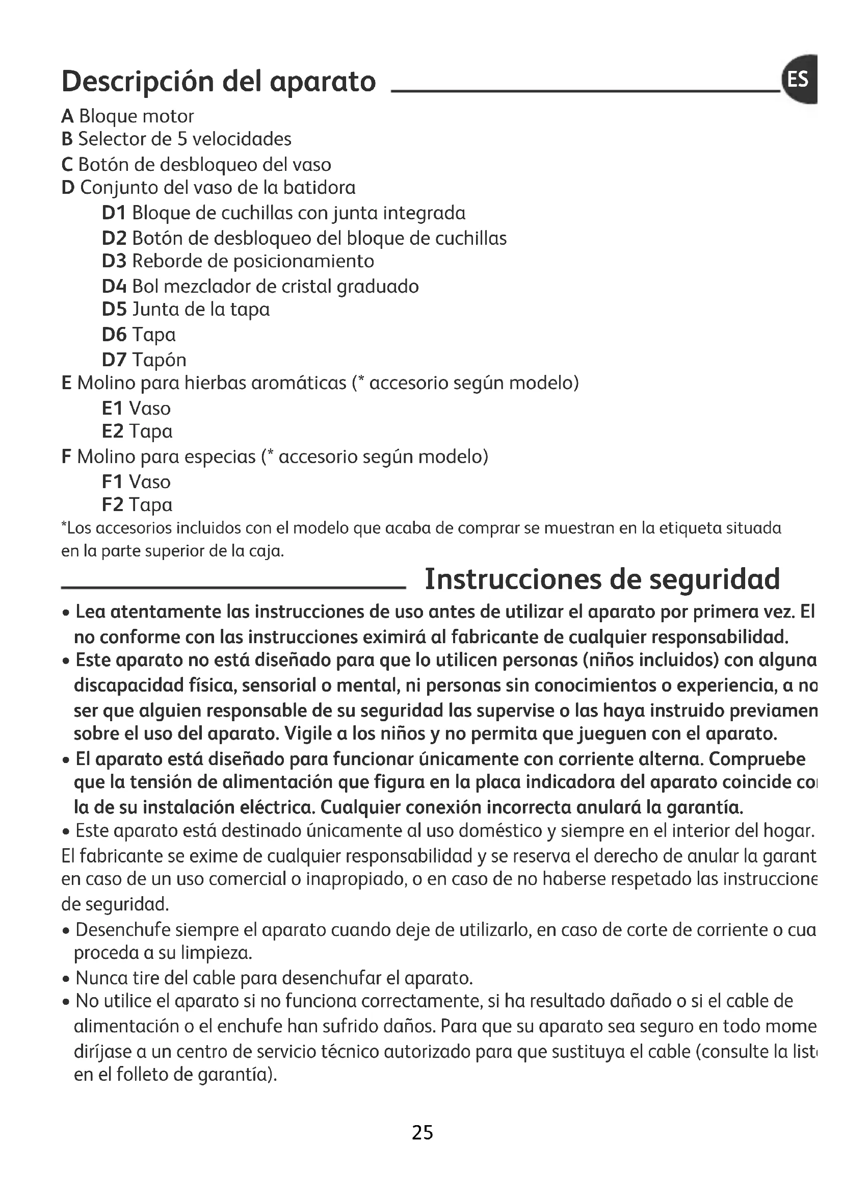 - El molino para especias (F) le permite moler en pocos segundos diferentes especias como granos de cilantro, pimienta, etc.28 Estos accesorios incorporan un vaso y una tapa que evita el acceso a las cuchillas durante su uso. Vierta los ingredientes en el vaso (E1) o (F1). Haga coincidir la marca t de la tapa (E2) o (F2) con la marca s del vaso (E1) o (F1). Encaje el vaso en la tapa y gire la tapa en el sentido de las agujas del reloj hasta la para bloquear el conjunto (fig. 5). Coloque el conjunto (E) o (F) sobre el bloque motor haciendo que coincidan los 2 rebordes del accesorio con las dos muescas del bloque motor y la marca "clic" de la tapa alineada con el botón "clic" (C) del bloque motor (fig. 6a), y presione el accesorio para cerrarlo sobre el bloque motor (se oirá un doble clic) (fig. 6b). Enchufe el aparato y gire el selector de velocidad (B) a la posición deseada o realice varias pulsaciones hacia "pulse". Mantenga el accesorio mientras el aparato esté en funcionamiento. Para detener el aparato, gire el selector de velocidad (B) a la posición "0". Desenchufe el aparato. Mantenga el accesorio y sepárelo del bloque motor pulsando el botón "clic" (C) del bloque motor (A) (fig. 4). Para desbloquear la tapa, proceda de manera inversa a su colocación. A continuación, puede recuperar la mezcla del vaso. Limpieza del aparato Desenchufe el aparato y retire el vaso o los accesorios. Manipúlelo con cuidado, las hojas de las cuchillas y los accesorios están muy afilados. Después de su uso, enjuague inmediatamente los vasos y las tapas con agua corriente, así como las piezas desmontables con agua caliente y con jabón. Para facilitar la limpieza el bloque de cuchillas (D1) se separa del vaso (D4) pulsando el botón "clic" (D2) (fig. 7a 7b 7c). La junta del bloque de cuchillas (D1) no se desmonta. La junta (D5) de la tapa (D6) es desmontable. Ingredientes Cantidades (máx.) Tiempo de funcionamiento Accesorios Albaricoques secos 80g 4 seg pulso mantenido E Pan rallado 1 biscote por pulsaciones E Cebolla 50g 5 seg velocidad 1 E Perejil 6g por pulsaciones E Carne sin nervios en trozos 60g por pulsaciones E Granos de coriandro 50g 60s velocidad 5 F Pimienta 50g 60s velocidad 5 F29 El vaso (D) y los accesorios (E) y (F) pueden lavarse en la cesta superior del lavavajillas en un programa "ECONÓMICO" o "LAVADO RÁPIDO". Para limpiar el bloque motor (A), utilice un paño húmedo y séquelo con cuidado. No sumerja el bloque motor (A) en agua. ¿Qué hacer si el aparato no funciona? Problemas Causas Soluciones El producto no funciona. El cable no está enchufado. Enchufe el aparato a una toma del mismo voltaje. El vaso o el accesorio no están colocados o acoplados sobre el bloque motor correctamente. Compruebe que el vaso o los accesorios están bien colocados y acoplados sobre el bloque motor tal y como se indica en las instrucciones. Deberá oír un doble "clic". El bloque de cuchillas (D1) no está correctamente montado en el bol (D4). Desbloquee el bloque de cuchillas (D1) y ajústelo nuevamente sobre el bol (D4) (fig 1a, 1b, 1c). Vibraciones excesivas. El producto no está colocado sobre una superficie plana. Coloque el producto sobre una superficie plana. El volumen de ingredientes es demasiado grande. Reduzca la cantidad de ingredientes. Fugas por la tapa. El volumen de ingredientes es demasiado grande. Reduzca la cantidad de ingredientes. La tapa no está bien colocada. Acople correctamente la tapa al vaso de la batidora. La junta (D5) no está colocada en su sitio sobre la tapa. Coloque la junta (D5) sobre la tapa (D6) (fig. 2a). Fugas por la parte inferior del vaso. El bloque de cuchillas (D1) está mal o no lo suficientemente acoplado en el vaso (D4). Vuelva a acoplar el bloque de cuchillas correctamente en el vaso, hasta que oiga el clic. El botón (D2) debe estar completamente alineado con el bloque de cuchillas (D1).30 ¿Su aparato sigue sin funcionar? Póngase en contacto con el servicio al consumidor (consulte la dirección en el folleto de garantía). Accesorios Puede personalizar su aparato y adquirir en su distribuidor habitual o en un centro de servicio oficial los siguientes accesorios: El molino para hierbas aromáticas (E), el molino para especias (F) o un vaso de batidora (D) adicional. Reciclaje