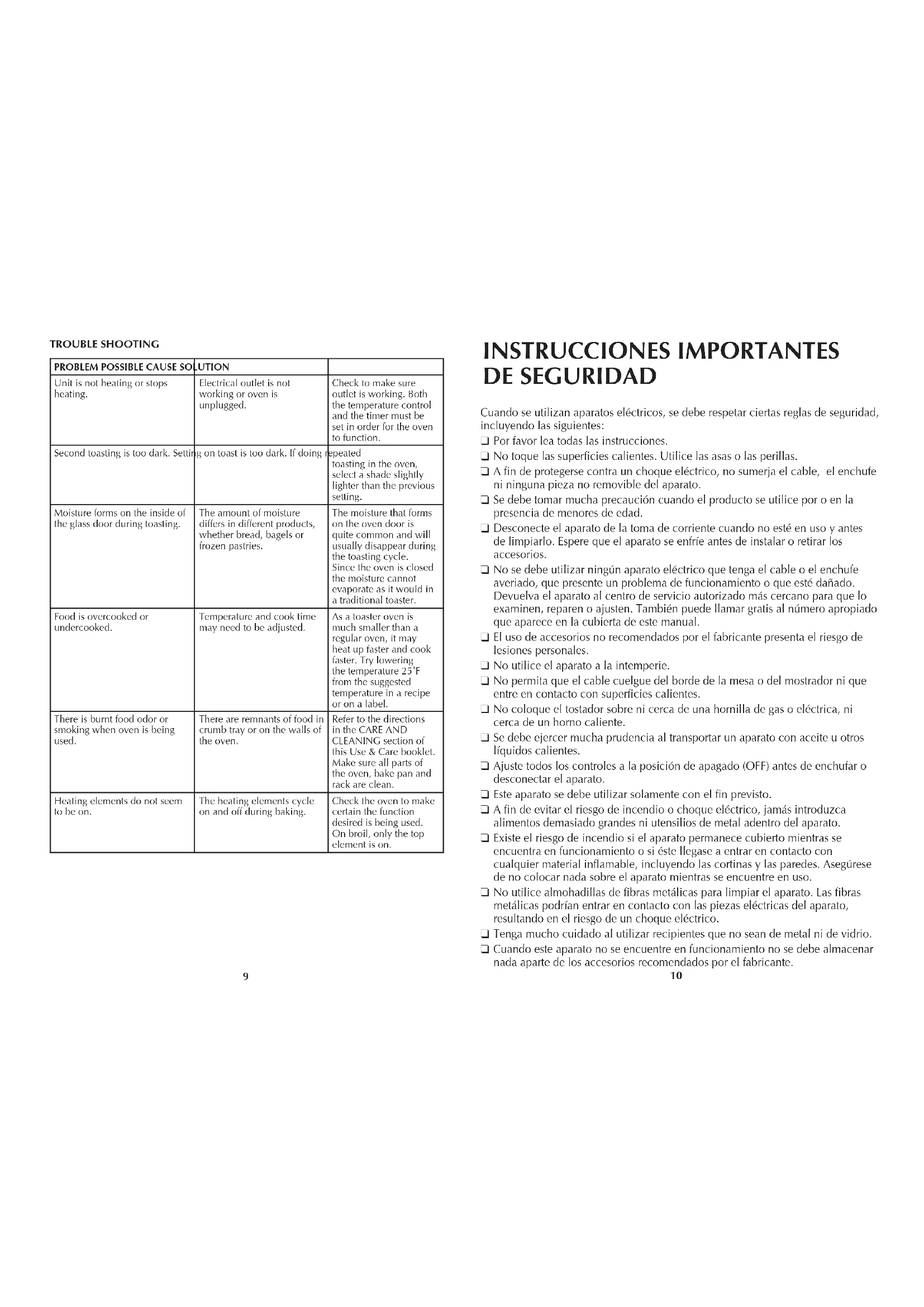 El aparato no calienta o deja de calentar. La toma de corriente no funciona o el horno está desconectado. Verique que la toma de corriente esté funcionando. Tanto el control de temperatura como el cronómetro deben ser ajustados para que el horno funcione. La segunda tanda de tostado resulta muy oscura. El control del grado de tostado está a un nivel demasiado alto. Si repite varias tandas, escoja un grado de tostado más bajo que el anterior. Se forma humedad por dentro en la puerta de vidrio durante el ciclo de tostado. La cantidad de humedad varía entre un producto y otro según los productos; pan, bagels, pasteles etc. La humedad que se forma por dentro en la puerta del horno es bastante común y generalmente desaparece durante el ciclo de tostado. Como la puerta permanece cerrada, la humedad no se puede evaporar como en un tostador normal. Los alimentos se sobre cocinan o no se cocinan bien. La temperatura y el tiempo de cocción pueden requerir reajuste. Como un horno tostador es mucho más pequeño que un horno regular, puede que se caliente y cocine más rápido. Ensaye, reduciendo 25˚F de la temperatura indicada en la receta o en el paquete. El aparato despide olor a comida quemada o humea cuando está en funcionamiento. Hay residuos de comida en la bandeja de recolección o en las paredes del horno. Consulte las instrucciones en la sección de CUIDADO Y LIMPIEZA de este manual. Asegúrese de que todas las partes del horno, bandeja de hornear y parrilla estén limpias. Los elementos calefactores parecen no estar encendidos. Los elementos calefactores funcionan intermitentemente durante el ciclo de cocción. Asegúrese que el aparato esté ajustado a la función correcta. Para el caso, cuando uno asa los alimentos, solamente se enciende el elemento calefactor superior.