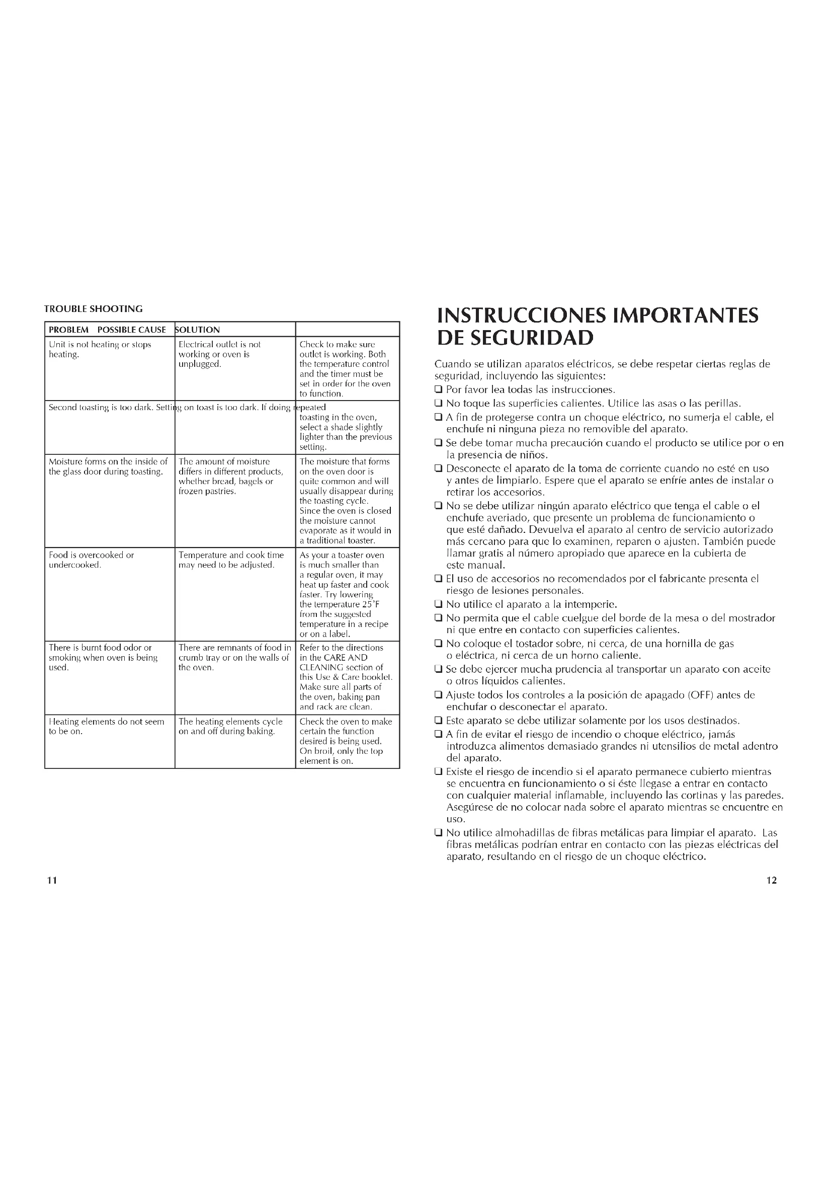 Metal, ovenproof glass or ceramic bakeware without glass lids can be used in your oven. Follow manufacturer’s instructions. Be sure the top edge of the container is at least 1½” (3.81 cm) away from the upper heating elements. INSTRUCCIONESIMPORTANTES DESEGURIDAD Cuando se utilizan aparatos eléctricos, se debe respetar ciertas reglas de seguridad, incluyendo las siguientes: ❑ Por favor lea todas las instrucciones. ❑ No toque las superficies calientes. Utilice las asas o las perillas. ❑ A fin de protegerse contra un choque eléctrico, no sumerja el cable, el enchufe ni ninguna pieza no removible del aparato. ❑ Se debe tomar mucha precaución cuando el producto se utilice por o en la presencia de niños. ❑ Desconecte el aparato de la toma de corriente cuando no esté en uso y antes de limpiarlo. Espere que el aparato se enfríe antes de instalar o retirar los accesorios. ❑ No se debe utilizar ningún aparato eléctrico que tenga el cable o el enchufe averiado, que presente un problema de funcionamiento o que esté dañado. Devuelva el aparato al centro de servicio autorizado más cercano para que lo examinen, reparen o ajusten. También puede llamar gratis al número apropiado que aparece en la cubierta de este manual. ❑ El uso de accesorios no recomendados por el fabricante presenta el riesgo de lesiones personales. ❑ No utilice el aparato a la intemperie. ❑ No permita que el cable cuelgue del borde de la mesa o del mostrador ni que entre en contacto con superficies calientes. ❑ No coloque el tostador sobre, ni cerca, de una hornilla de gas o eléctrica, ni cerca de un horno caliente. ❑ Se debe ejercer mucha prudencia al transportar un aparato con aceite o otros líquidos calientes. ❑ Ajuste todos los controles a la posición de apagado (OFF) antes de enchufar o desconectar el aparato. ❑ Este aparato se debe utilizar solamente por los usos destinados. ❑ A fin de evitar el riesgo de incendio o choque eléctrico, jamás introduzca alimentos demasiado grandes ni utensilios de metal adentro del aparato. ❑ Existe el riesgo de incendio si el aparato permanece cubierto mientras se encuentra en funcionamiento o si éste llegase a entrar en contacto con cualquier material inflamable, incluyendo las cortinas y las paredes. Asegúrese de no colocar nada sobre el aparato mientras se encuentre en uso. ❑ No utilice almohadillas de fibras metálicas para limpiar el aparato. Las fibras metálicas podrían entrar en contacto con las piezas eléctricas del aparato, resultando en el riesgo de un choque eléctrico. TROUBLESHOOTING