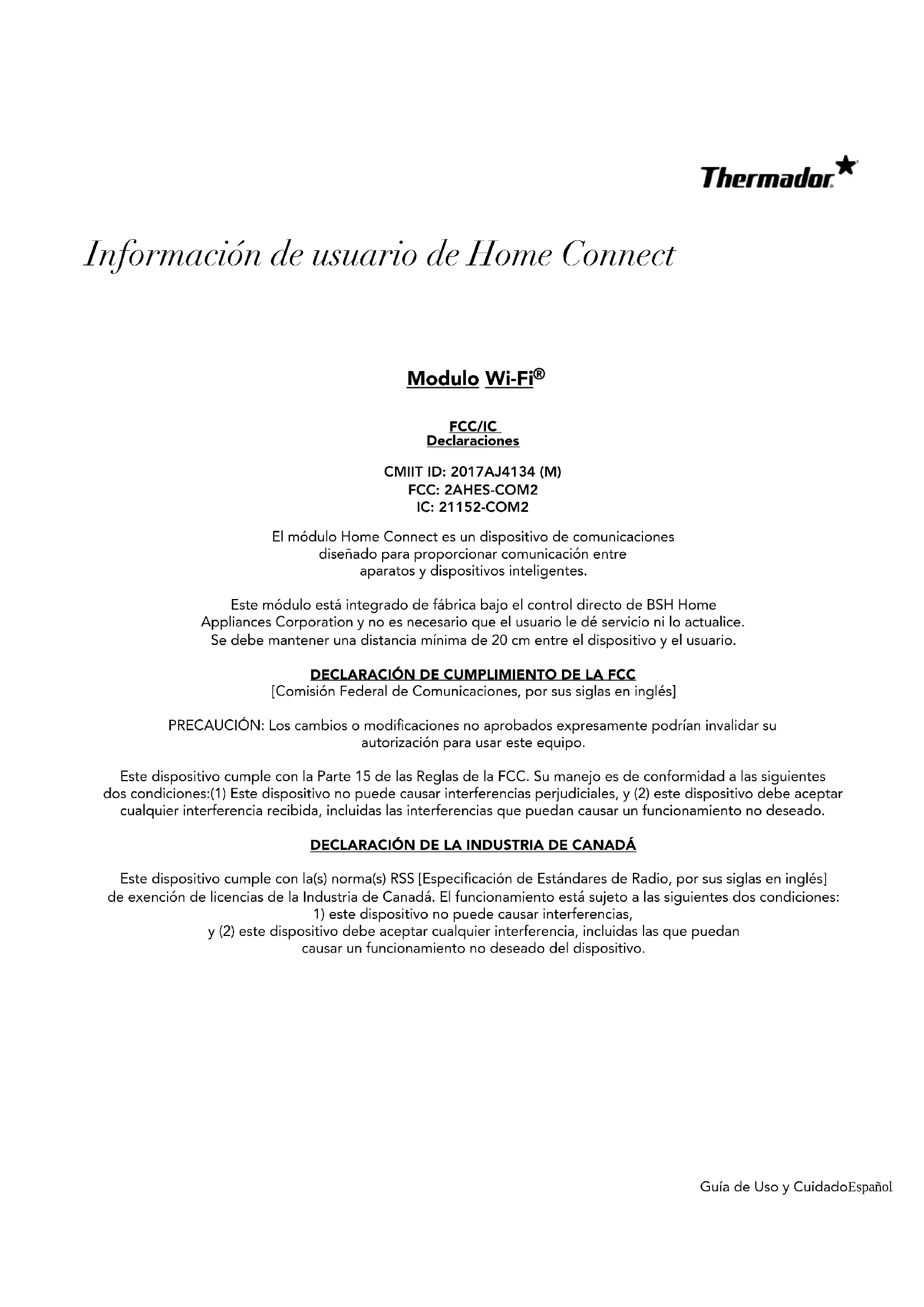 El módulo Home Connect es un dispositivo de comunicaciones diseñado para proporcionar comunicación entre aparatos y dispositivos inteligentes. Este módulo está integrado de fábrica bajo el control directo de BSH Home Appliances Corporation y no es necesario que el usuario le dé servicio ni lo actualice. Se debe mantener una distancia mínima de 20 cm entre el dispositivo y el usuario. DECLARACIÓN DE CUMPLIMIENTO DE LA FCC [Comisión Federal de Comunicaciones, por sus siglas en inglés] PRECAUCIÓN: Los cambios o modificaciones no aprobados expresamente podrían invalidar su autorización para usar este equipo. Este dispositivo cumple con la Parte 15 de las Reglas de la FCC. Su manejo es de conformidad a las siguientes dos condiciones:(1) Este dispositivo no puede causar interferencias perjudiciales, y (2) este dispositivo debe aceptar cualquier interferencia recibida, incluidas las interferencias que puedan causar un funcionamiento no deseado. DECLARACIÓN DE LA INDUSTRIA DE CANADÁ Este dispositivo cumple con la(s) norma(s) RSS [Especificación de Estándares de Radio, por sus siglas en inglés] de exención de licencias de la Industria de Canadá. El funcionamiento está sujeto a las siguientes dos condiciones: