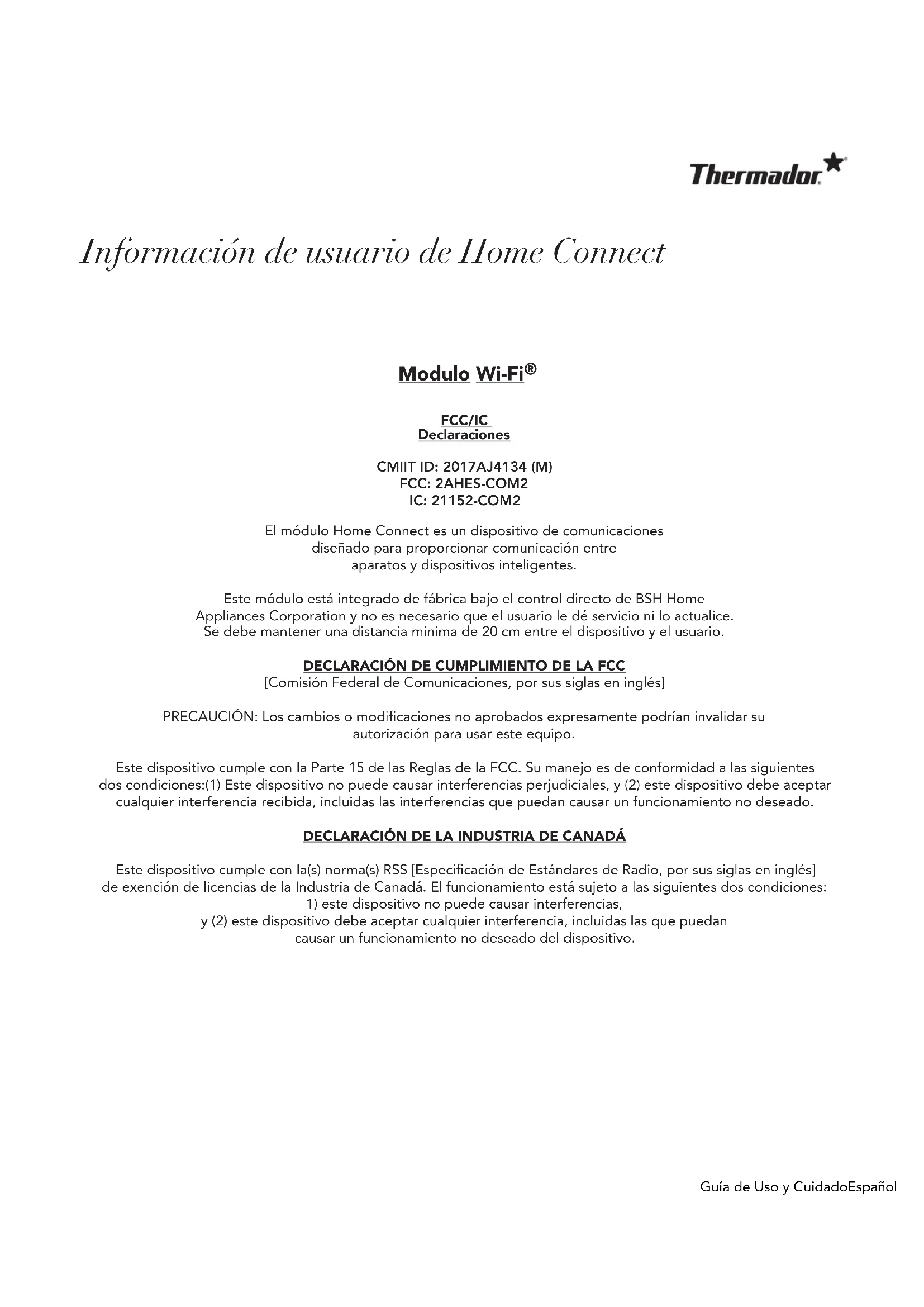 El módulo Home Connect es un dispositivo de comunicaciones diseñado para proporcionar comunicación entre aparatos y dispositivos inteligentes. Este módulo está integrado de fábrica bajo el control directo de BSH Home Appliances Corporation y no es necesario que el usuario le dé servicio ni lo actualice. Se debe mantener una distancia mínima de 20 cm entre el dispositivo y el usuario. DECLARACIÓN DE CUMPLIMIENTO DE LA FCC [Comisión Federal de Comunicaciones, por sus siglas en inglés] PRECAUCIÓN: Los cambios o modificaciones no aprobados expresamente podrían invalidar su autorización para usar este equipo. Este dispositivo cumple con la Parte 15 de las Reglas de la FCC. Su manejo es de conformidad a las siguientes dos condiciones:(1) Este dispositivo no puede causar interferencias perjudiciales, y (2) este dispositivo debe aceptar cualquier interferencia recibida, incluidas las interferencias que puedan causar un funcionamiento no deseado. DECLARACIÓN DE LA INDUSTRIA DE CANADÁ Este dispositivo cumple con la(s) norma(s) RSS [Especificación de Estándares de Radio, por sus siglas en inglés] de exención de licencias de la Industria de Canadá. El funcionamiento está sujeto a las siguientes dos condiciones: