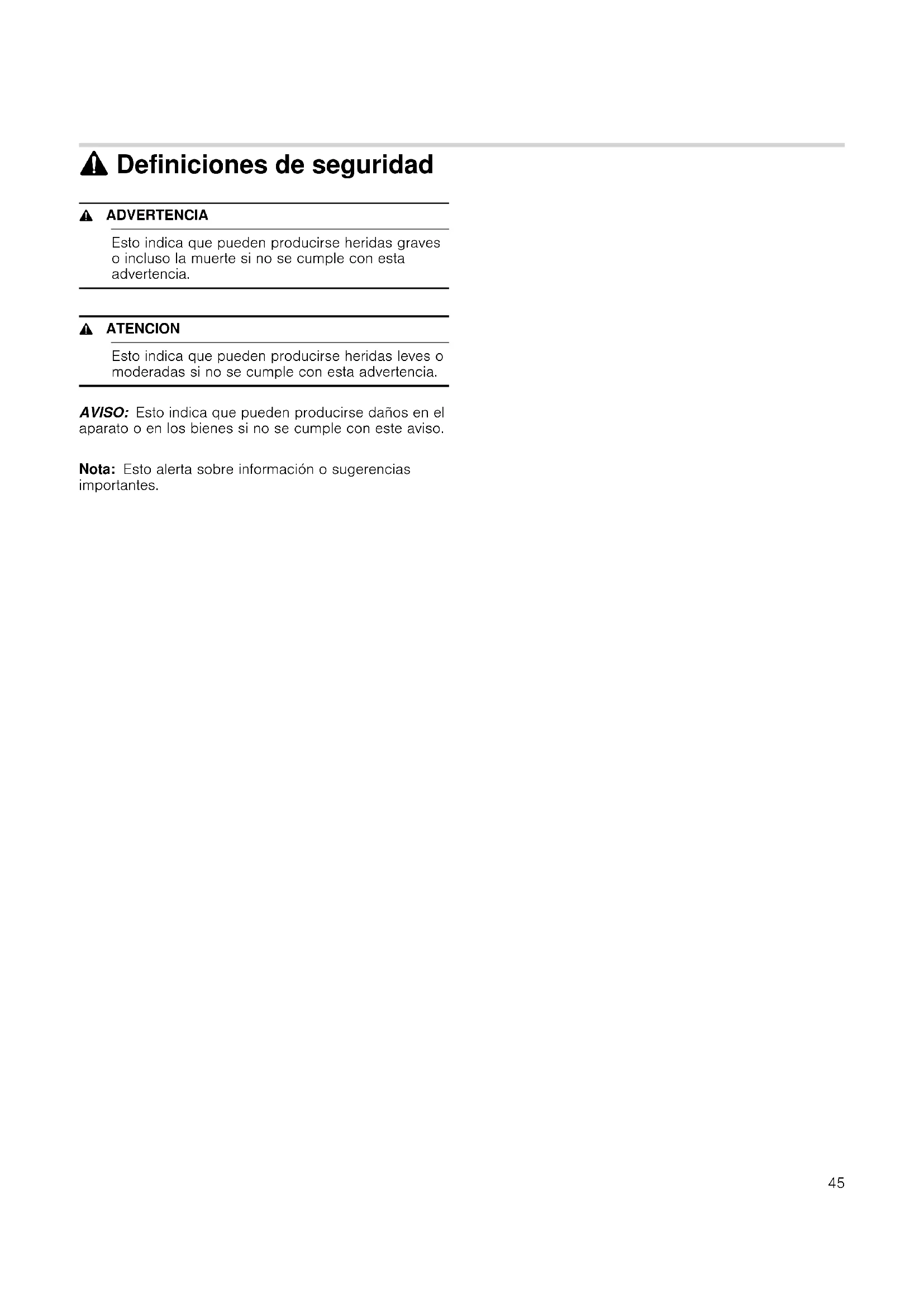 9 Definiciones de seguridad Defi niciones de seguridad 9 ADVERTENCIA Esto indica que pueden producirse heridas graves o incluso la muerte si no se cumple con esta advertencia. 9 ATENCION Esto indica que pueden producirse heridas leves o moderadas si no se cumple con esta advertencia. AVISO: Esto indica que pueden producirse daños en el aparato o en los bienes si no se cumple con este aviso. Nota: Esto alerta sobre información o sugerencias importantes.9 INSTRUCCIONES DE SEGURIDAD IMPORTANTES