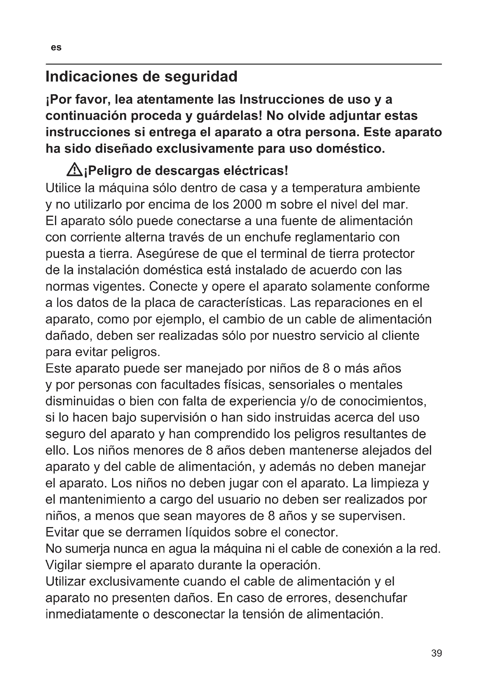 Indicaciones de seguridad ¡Por favor, lea atentamente las Instrucciones de uso y a continuación proceda y guárdelas! No olvide adjuntar estas instrucciones si entrega el aparato a otra persona. Este aparato ha sido diseñado exclusivamente para uso doméstico. W¡Peligro de descargas eléctricas! Utilice la máquina sólo dentro de casa y a temperatura ambiente y no utilizarlo por encima de los 2000 m sobre el nivel del mar. El aparato sólo puede conectarse a una fuente de alimentación con corriente alterna través de un enchufe reglamentario con puesta a tierra. Asegúrese de que el terminal de tierra protector de la instalación doméstica está instalado de acuerdo con las normas vigentes. Conecte y opere el aparato solamente conforme a los datos de la placa de características. Las reparaciones en el aparato, como por ejemplo, el cambio de un cable de alimentación dañado, deben ser realizadas sólo por nuestro servicio al cliente para evitar peligros. Este aparato puede ser manejado por niños de 8 o más años y por personas con facultades físicas, sensoriales o mentales disminuidas o bien con falta de experiencia y/o de conocimientos, si lo hacen bajo supervisión o han sido instruidas acerca del uso seguro del aparato y han comprendido los peligros resultantes de ello. Los niños menores de 8 años deben mantenerse alejados del aparato y del cable de alimentación, y además no deben manejar el aparato. Los niños no deben jugar con el aparato. La limpieza y el mantenimiento a cargo del usuario no deben ser realizados por niños, a menos que sean mayores de 8 años y se supervisen. Evitar que se derramen líquidos sobre el conector. No sumerja nunca en agua la máquina ni el cable de conexión a la red. Vigilar siempre el aparato durante la operación. Utilizar exclusivamente cuando el cable de alimentación y el aparato no presenten daños. En caso de errores, desenchufar inmediatamente o desconectar la tensión de alimentación.40