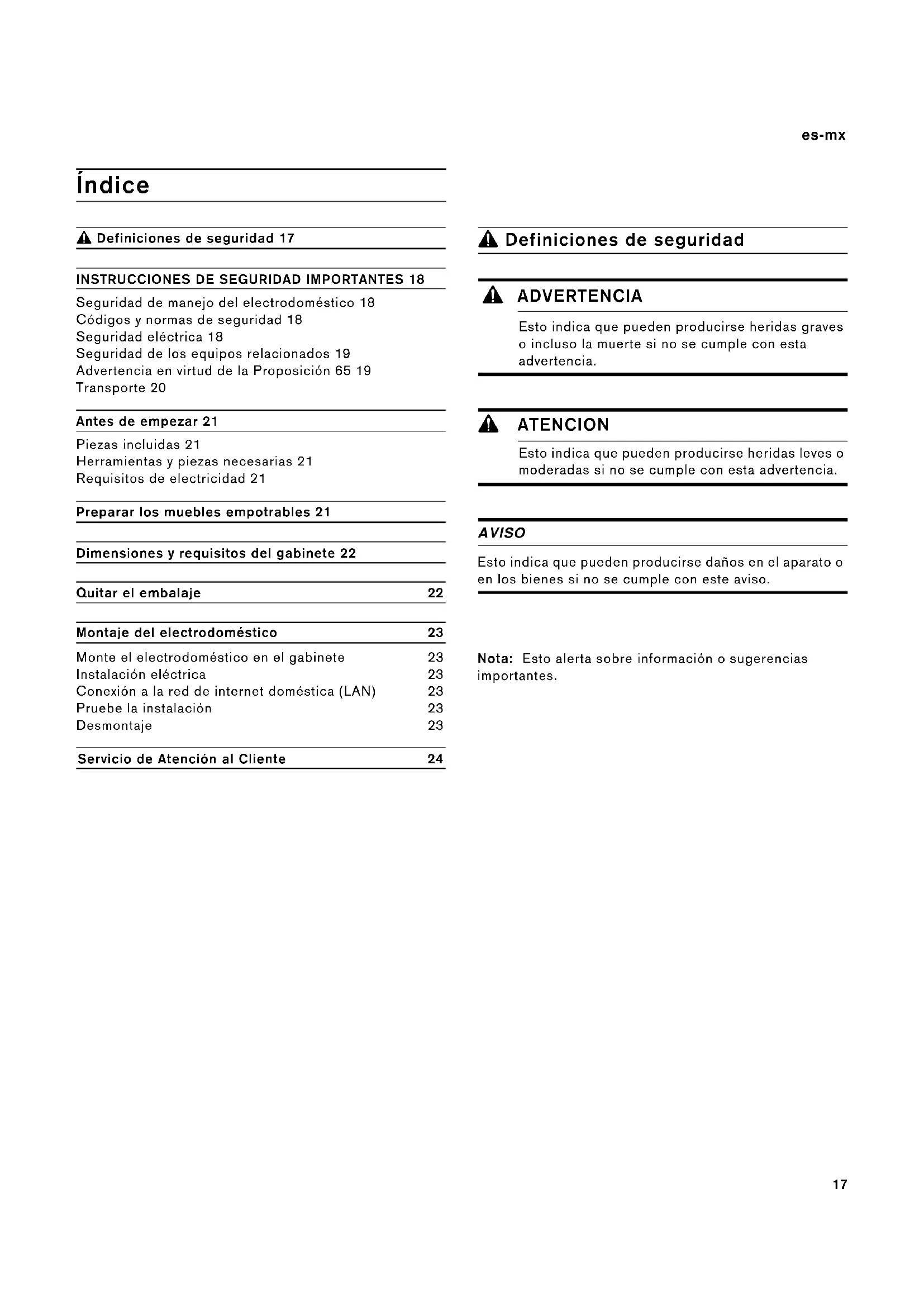 /$123 Preparar los muebles empotrables es-mx Montaje del electrodoméstico Nota: El aparato pesa demasiado. Se aconseja dos personas para insertarlo. AVISO Antes de instalar el aparato, asegúrese de verificar las dimensiones del gabinete y las conexiones eléctricas. Monte el electrodoméstico en el gabinete