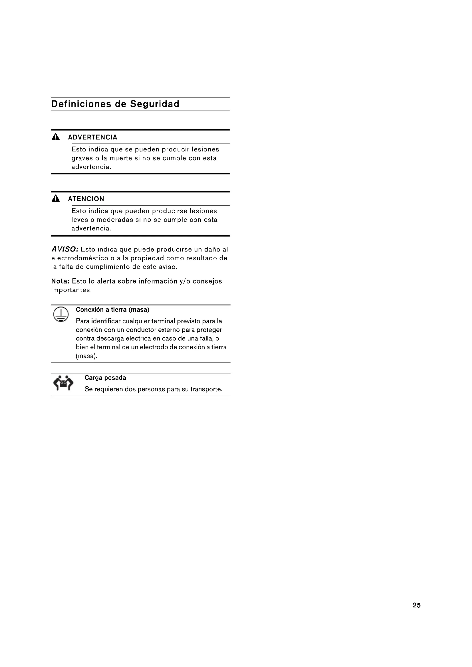 CA 877 442 4436 toll-free25 Contenido Instrucciones de instalación Definiciones de Seguridad 9 ADVERTENCIA Esto indica que se pueden producir lesiones graves o la muerte si no se cumple con esta advertencia. 9 ATENCION Esto indica que pueden producirse lesiones leves o moderadas si no se cumple con esta advertencia. AVISO: Esto indica que puede producirse un daño al electrodoméstico o a la propiedad como resultado de la falta de cumplimiento de este aviso. Nota: Esto lo alerta sobre información y/o consejos importantes. Conexión a tierra (masa) Para identificar cualquier terminal previsto para la conexión con un conductor externo para proteger contra descarga eléctrica en caso de una falla, o bien el terminal de un electrodo de conexión a tierra (masa). Carga pesada Se requieren dos personas para su transporte.9 INSTRUCCIONES DE SEGURIDAD IMPORTANTES LEER TODAS LAS INSTRUCCIONES ANTES DE UTILIZAR EL APARATO