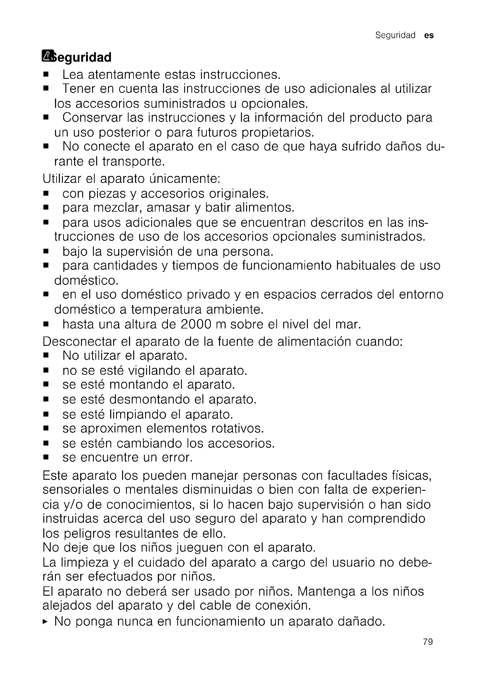 "»Profi«-pallovispilän hienosäätö", Sivu 74 77fi Käytöstä poistetun laitteen hävittäminen Käytöstä poistetun laitteen hävittäminenKäytöstä poistetun laitteen hävittäminen Hävitä laite ympäristöystävällisesti. Tarkempia tietoja kierrätysmahdollisuuksista saat kodinkoneliikkeistä sekä paikkakuntasi jätehuollosta vastaavilta viranomaisilta. Tämän laitteen merkintä perustuu käytettyjä sähkö- ja elektroniikkalaitteita (waste electrical and electronic equipment - WEEE) koskevaan direktiiviin 2012/19/EU. Tämä direktiivi määrittää käytettyjen laitteiden palautus- ja kierrätys-säännökset koko EU:n alueella. HuoltopalveluHuoltopalvelu Lisätietoja käyttömaan takuuajasta ja takuuehdoista saat QR-koodista, joka on mukana olevassa huoltoyhteystietoja ja takuuehtoja koskevassa dokumentissa, huoltopalvelustamme, kauppiaaltasi tai verkkosivultamme. Huoltopalvelun yhteystiedot saat QR- koodista, joka on mukana olevassa huoltoyhteystietoja ja takuuehtoja koskevassa dokumentissa, tai verkkosivultamme. Asetuksen (EU) 2023/826 mukaiset tiedot löytyvät verkosta osoitteesta www.bosch- home.com laitteesi tuotesivulta ja huoltosivulta käyttöohjeen ja lisädokumenttien kohdasta. 78Seguridad es Seguridad Seguridad ¡ Lea atentamente estas instrucciones. ¡ Tener en cuenta las instrucciones de uso adicionales al utilizar los accesorios suministrados u opcionales. ¡ Conservar las instrucciones y la información del producto para un uso posterior o para futuros propietarios. ¡ No conecte el aparato en el caso de que haya sufrido daños du- rante el transporte. Utilizar el aparato únicamente: ¡ con piezas y accesorios originales. ¡ para mezclar, amasar y batir alimentos. ¡ para usos adicionales que se encuentran descritos en las ins- trucciones de uso de los accesorios opcionales suministrados. ¡ bajo la supervisión de una persona. ¡ para cantidades y tiempos de funcionamiento habituales de uso doméstico. ¡ en el uso doméstico privado y en espacios cerrados del entorno doméstico a temperatura ambiente. ¡ hasta una altura de 2000msobre el nivel del mar. Desconectar el aparato de la fuente de alimentación cuando: ¡ No utilizar el aparato. ¡ no se esté vigilando el aparato. ¡ se esté montando el aparato. ¡ se esté desmontando el aparato. ¡ se esté limpiando el aparato. ¡ se aproximen elementos rotativos. ¡ se estén cambiando los accesorios. ¡ se encuentre un error. Este aparato los pueden manejar personas con facultades físicas, sensoriales o mentales disminuidas o bien con falta de experien- cia y/o de conocimientos, si lo hacen bajo supervisión o han sido instruidas acerca del uso seguro del aparato y han comprendido los peligros resultantes de ello. No deje que los niños jueguen con el aparato. La limpieza y el cuidado del aparato a cargo del usuario no debe- rán ser efectuados por niños. El aparato no deberá ser usado por niños. Mantenga a los niños alejados del aparato y del cable de conexión. No ponga nunca en funcionamiento un aparato dañado. 79es Seguridad No hacer funcionar nunca un aparato con una superficie agrieta- da o rota. No tirar nunca del cable de conexión a la red eléctrica para de- senchufar el aparato. Desenchufar siempre el cable de conexión de red de la toma de corriente. Si el aparato o el cable de conexión de red están dañados, de- senchufar inmediatamente el cable de conexión de red o desco- nectar el interruptor automático del cuadro eléctrico. Llame al Servicio de Asistencia Técnica.