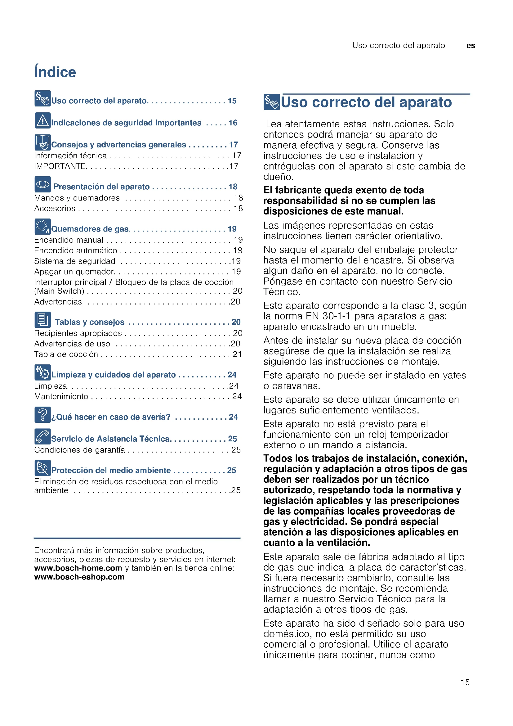 - Presentación del aparato . . . . . . . . . . . . . . . . . 18 Mandos y quemadores . . . . . . . . . . . . . . . . . . . . . . . 18 Accesorios . . . . . . . . . . . . . . . . . . . . . . . . . . . . . . . . . 18 Ä Quemadores de gas. . . . . . . . . . . . . . . . . . . . . . 19 Encendido manual . . . . . . . . . . . . . . . . . . . . . . . . . . . 19 Encendido automático . . . . . . . . . . . . . . . . . . . . . . . . 19 Sistema de seguridad . . . . . . . . . . . . . . . . . . . . . . . .19 Apagar un quemador. . . . . . . . . . . . . . . . . . . . . . . . . 19 Interruptor principal / Bloqueo de la placa de cocción (Main Switch) . . . . . . . . . . . . . . . . . . . . . . . . . . . . . . . 20 Advertencias . . . . . . . . . . . . . . . . . . . . . . . . . . . . . . .20 J Tablas y consejos . . . . . . . . . . . . . . . . . . . . . . . 20 Recipientes apropiados . . . . . . . . . . . . . . . . . . . . . . . 20 Advertencias de uso . . . . . . . . . . . . . . . . . . . . . . . . .20 Tabla de cocción . . . . . . . . . . . . . . . . . . . . . . . . . . . . 21 2 Limpieza y cuidados del aparato . . . . . . . . . . . 24 Limpieza. . . . . . . . . . . . . . . . . . . . . . . . . . . . . . . . . . .24 Mantenimiento . . . . . . . . . . . . . . . . . . . . . . . . . . . . . . 24 3 ¿Qué hacer en caso de avería? . . . . . . . . . . . . 24 4 Servicio de Asistencia Técnica. . . . . . . . . . . . . 25 Condiciones de garantía . . . . . . . . . . . . . . . . . . . . . . 25 7 Protección del medio ambiente . . . . . . . . . . . . 25 Eliminación de residuos respetuosa con el medio ambiente . . . . . . . . . . . . . . . . . . . . . . . . . . . . . . . . . .25 Produktinfo Encontrará más información sobre productos, accesorios, piezas de repuesto y servicios en internet: www.bosch-home.com y también en la tienda online: www.bosch-eshop.com 8Uso correcto del aparato Us o cor r ect o del apar at o Lea atentamente estas instrucciones. Solo entonces podrá manejar su aparato de manera efectiva y segura. Conserve las instrucciones de uso e instalación y entréguelas con el aparato si este cambia de dueño. El fabricante queda exento de toda responsabilidad si no se cumplen las disposiciones de este manual. Las imágenes representadas en estas instrucciones tienen carácter orientativo. No saque el aparato del embalaje protector hasta el momento del encastre. Si observa algún daño en el aparato, no lo conecte. Póngase en contacto con nuestro Servicio Técnico. Este aparato corresponde a la clase 3, según la norma EN 30-1-1 para aparatos a gas: aparato encastrado en un mueble. Antes de instalar su nueva placa de cocción asegúrese de que la instalación se realiza siguiendo las instrucciones de montaje. Este aparato no puede ser instalado en yates o caravanas. Este aparato se debe utilizar únicamente en lugares suficientemente ventilados. Este aparato no está previsto para el funcionamiento con un reloj temporizador externo o un mando a distancia. Todos los trabajos de instalación, conexión, regulación y adaptación a otros tipos de gas deben ser realizados por un técnico autorizado, respetando toda la normativa y legislación aplicables y las prescripciones de las compañías locales proveedoras de gas y electricidad. Se pondrá especial atención a las disposiciones aplicables en cuanto a la ventilación. Este aparato sale de fábrica adaptado al tipo de gas que indica la placa de características. Si fuera necesario cambiarlo, consulte las instrucciones de montaje. Se recomienda llamar a nuestro Servicio Técnico para la adaptación a otros tipos de gas. Este aparato ha sido diseñado solo para uso doméstico, no está permitido su uso comercial o profesional. Utilice el aparato únicamente para cocinar, nunca comoes Indicaciones de seguridad importantes