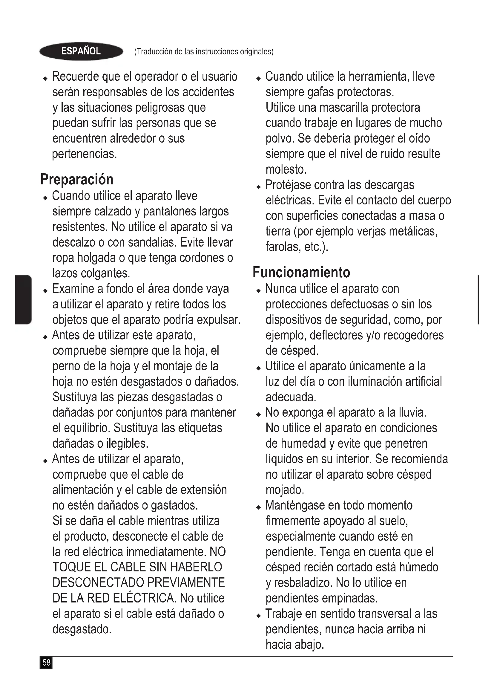 DESCONECTADO PREVIAMENTE DE LA RED ELÉCTRICA. No utilice el aparato si el cable está dañado o desgastado. u Cuando utilice la herramienta, lleve siempre gafas protectoras. Utilice una mascarilla protectora cuando trabaje en lugares de mucho polvo. Se debería proteger el oído siempre que el nivel de ruido resulte molesto. u Protéjase contra las descargas eléctricas. Evite el contacto del cuerpo con supercies conectadas a masa o tierra (por ejemplo verjas metálicas, farolas, etc.). Funcionamiento u Nunca utilice el aparato con protecciones defectuosas o sin los dispositivos de seguridad, como, por ejemplo, deectores y/o recogedores de césped. u Utilice el aparato únicamente a la luz del día o con iluminación articial adecuada. u No exponga el aparato a la lluvia. No utilice el aparato en condiciones de humedad y evite que penetren líquidos en su interior. Se recomienda no utilizar el aparato sobre césped mojado. u Manténgase en todo momento rmemente apoyado al suelo, especialmente cuando esté en pendiente. Tenga en cuenta que el césped recién cortado está húmedo y resbaladizo. No lo utilice en pendientes empinadas. u Trabaje en sentido transversal a las pendientes, nunca hacia arriba ni hacia abajo.59 (Traducción de las instrucciones originales) ESPAÑOL Tenga sumo cuidado al cambiar de sentido en las pendientes. u No corte el césped en pendientes demasiado empinadas. u Camine mientras utiliza el aparato, sin correr nunca. No dirija el aparato hacia usted ni camine hacia atrás cuando utilice el aparato. u Siga las instrucciones para encender el aparato y mantenga los pies alejados de la hoja. u No encienda el aparato cuando se encuentre delante de la abertura de expulsión de residuos. u No incline el aparato cuando lo encienda, excepto si es necesario inclinarlo para arrancarlo. En ese caso, no levante el aparato más de lo imprescindiblemente necesario y levante sólo la parte que esté lejos del usuario. Asegúrese de mantener ambas manos en posición de trabajo antes de volver a dejar el aparato en el suelo. u Si debe levantar el aparato y transportarlo para atravesar supercies que no sean de césped o para dirigirse al área de trabajo, apague el aparato y espere a que las cuchillas se detengan por completo. u No levante ni transporte el aparato hasta que la hoja no se haya detenido por completo. u Mantenga las manos y los pies apartados de la hoja. u No coloque las manos ni los pies cerca o debajo de las piezas giratorias. u Manténgase alejado en todo momento de las aberturas de expulsión de residuos. u Antes de dejar el aparato sin vigilancia o de eliminar una obstrucción, o cuando se disponga a cambiar, limpiar o revisar alguna de sus piezas, apáguelo, desenchufe el cable de la toma de corriente y asegúrese de que las piezas móviles se han detenido por completo. Después de golpear un objeto extraño. Compruebe que la máquina no tenga daños, si lo tiene repárelos antes de volver a ponerla en marcha y utilizarla. u Si el aparato empieza a vibrar de forma inusual o si choca con un objeto extraño, apague el aparato y desenchufe el cable de la toma de corriente. Compruebe los daños del aparado, sustituya o repare las piezas dañadas y je las piezas sueltas. u Tenga mucho cuidado de mantener el cable de alimentación lejos de la hoja. Tenga cuidado con la posición del cable en todo momento. u Después de apagar el aparato, el motor continuará en marcha durante unos segundos. No intente forzar la hoja para que se pare. Mantenimiento y almacenamiento u Antes de utilizarlo, compruebe que el aparato no contenga piezas dañadas ni defectuosas.60 (Traducción de las instrucciones originales) ESPAÑOL Compruebe si las piezas móviles están desalineadas o agarrotadas, si hay piezas rotas, daños a las protecciones e interruptores o cualquier otro problema que pueda afectar al funcionamiento. Asegúrese de que el aparato funciona correctamente y realiza las funciones para las que ha sido diseñado. No utilice el aparato con protecciones o cierres dañados ni mal colocados. No utilice el aparato si presenta alguna pieza dañada o defectuosa. No utilice el aparato si no es posible encenderlo y apagarlo con el interruptor. Solicite al servicio técnico autorizado la reparación o sustitución de las piezas dañadas o defectuosas. u Compruebe con frecuencia que el cable no haya sufrido daños. Si se llegase a dañar el cable, deberá ser sustituido por un agente autorizado para evitar cualquier situación de riesgo. Inspeccione los cables de extensión periódicamente. Si el cable de extensión está dañado o es defectuoso, sustitúyalo inmediatamente. u Mantenga todas las tuercas, pernos y tornillos del aparato apretados para asegurar unas condiciones de trabajo seguras. u Compruebe que el colector de césped no esté dañado ni desgastado y sustitúyalo si es necesario. No utilice nunca el aparato sin el colector de césped. u Tenga cuidado durante el ajuste del aparato para evitar que se le enganchen los dedos entre las hojas en movimiento y las piezas jas del aparato. u Cuando revise las cuchillas, tenga cuidado porque, aunque la fuente de alimentación esté desconectada, aún se pueden mover. u Cuando no utilice el aparato, debe guardarlo en un lugar seco. Los niños no deben tener acceso a los aparatos guardados. u Deje siempre enfriar el aparato antes de guardarlo. u Asegúrese de que solo se utilizan los repuestos de corte del tipo correcto. u Utilice únicamente piezas de repuesto y accesorios recomendados por BLACK+DECKER. Instrucciones de seguridad adicionales para cortacéspedes u Utilice siempre un cable de prolongación autorizado que sea adecuado para la entrada de corriente de esta herramienta (consulte los datos técnicos). El cable de prolongación debe ser adecuado para su uso en exteriores y presentar las indicaciones oportunas. Se puede utilizar un cable de prolongación HO5VV-F de 1.5 mm2 y de hasta 30 m sin pérdida de rendimiento del pro