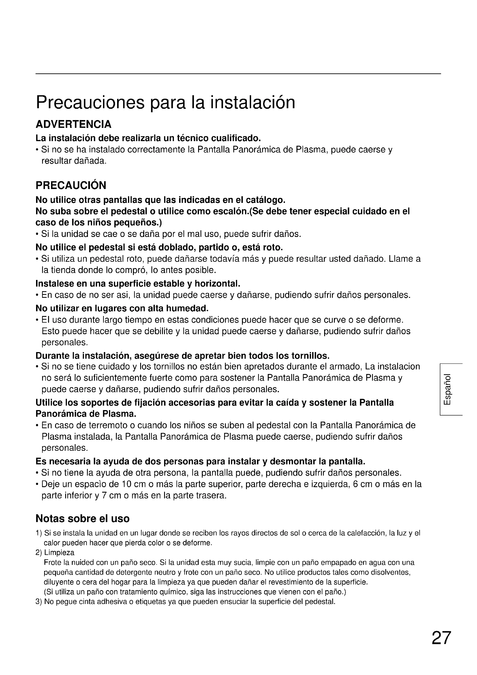 - Si no se ha instalado correctamente la Pantalla Panorámica de Plasma, puede caerse y resultar dañada. PRECAUCIÓN No utilice otras pantallas que las indicadas en el catálogo. No suba sobre el pedestal o utilice como escalón.(Se debe tener especial cuidado en el caso de los niños pequeños.)