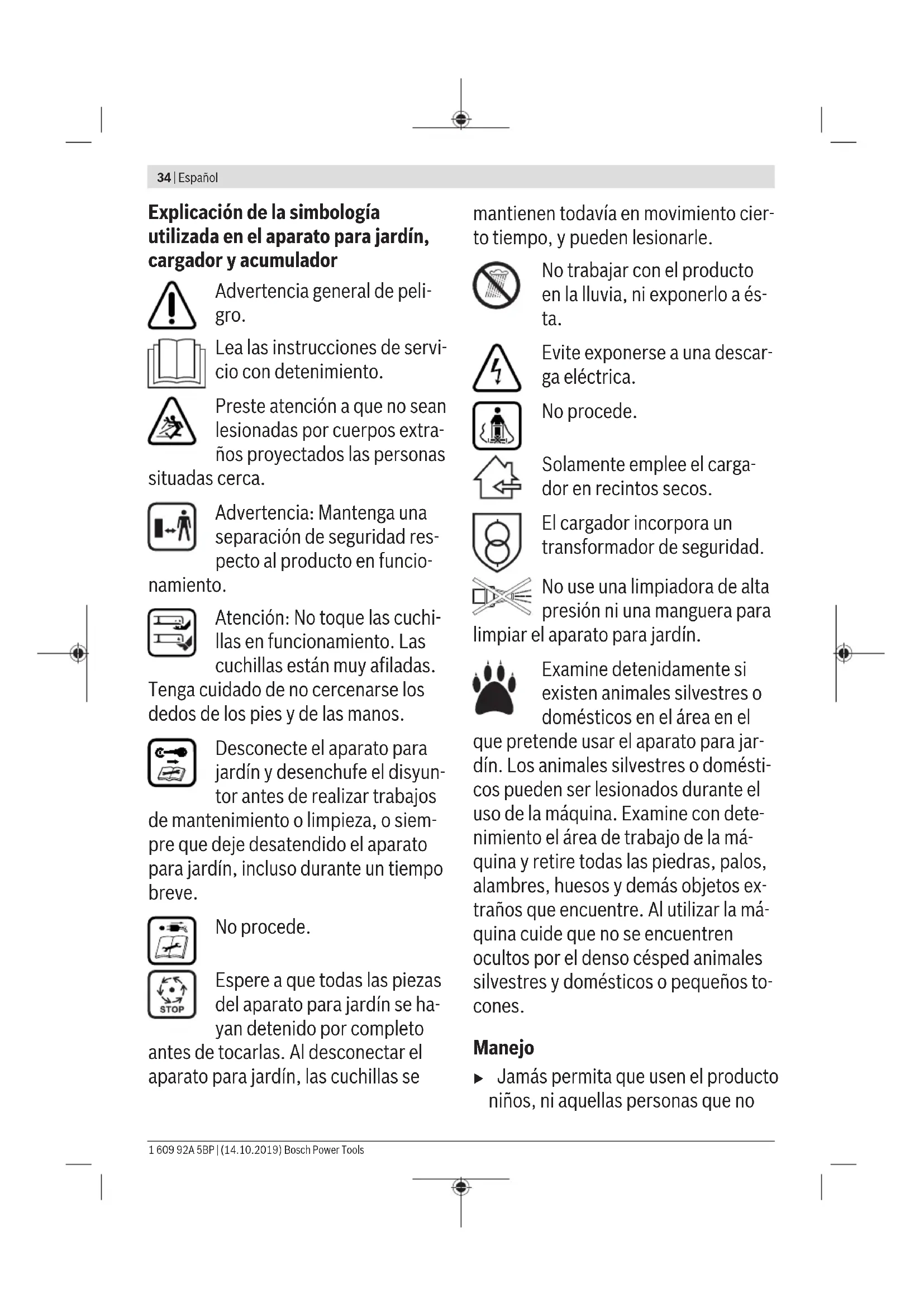 Para aumentar la autonomía puede adquirirse un acumula- dor adicional a través de un servicio técnico de aparatos pa- ra jardín Bosch. Localización de fallos Síntoma Posible causa Solución El motor no funciona Cableado interior de la máquina defectuoso Diríjase a un servicio técnico Bosch Acumulador descargado Recargue el acumulador Acumulador demasiado frío o caliente Dejar que se caliente/enfríe el acumulador Césped demasiado alto Altura máx. del césped 30 cm con el ajuste máxi- mo de la altura de corte El guardamotor se ha activado Dejar que se enfríe el motor y ajustar una altura de corte mayor Disyuntor enchufado de forma incorrecta o in- completa Montarlo correctamente El aparato para jardín funciona de forma in- termitente Cableado interior de la máquina defectuoso Diríjase a un servicio técnico Bosch El guardamotor se ha activado Dejar que se enfríe el motor y ajustar una altura de corte mayor La altura de corte obte- nida con el aparato de Altura de corte muy baja Ajustar una altura de corte mayor Cuchilla mellada Cambiar cuchilla (ver figura J) 1 609 92A 5BP | (14.10.2019) Bosch Power ToolsEspañol | 43 Síntoma Posible causa Solución jardín es irregular y/o el motor trabaja con di- ficultad Puede que exista una obstrucción Desconectar el aparato para jardín y desenchufar el disyuntor Examine la parte inferior del aparato para jardín y desobstrúyala, si procede (siempre use guantes para jardín) Cuchilla montada al revés Montar la cuchilla en la posición correcta Al conectar el aparato para jardín, la cuchilla de corte no gira Cuchilla obstaculizada por la hierba Desconectar el aparato para jardín y desenchufar el disyuntor Eliminar la obstrucción (siempre use guantes para jardín) Tuerca/tornillo de sujeción de la cuchilla flojos Apretar la tuerca/tornillo de sujeción de la cuchi- lla (27Nm) Vibraciones o ruidos in- tensos Tuerca/tornillo de sujeción de la cuchilla flojos Apretar la tuerca/tornillo de sujeción de la cuchi- lla (27Nm) Cuchilla dañada Cambiar cuchilla (ver figura J) Acumulador y cargador Síntomas Posible causa Solución El indicador rojo de carga del acumulador parpadea en el carga- dor No es posible realizar el proceso de carga Acumulador mal montado Montar correctamente el acumulador en el carga- dor Contactos sucios del acumulador Limpiar los contactos del acumulador, p.ej., me- tiéndolo y sacándolo repetidamente, o bien, sus- tituir el acumulador Acumulador defectuoso Sustituir el acumulador Los indicadores de car- ga del acumulador no se encienden en el car- gador El enchufe de red del cargador no está correcta- mente conectado Introducir completamente el enchufe en la toma de corriente Toma de corriente, cable de red o cargador defec- tuoso Verifique la tensión de red, y si fuese preciso, acuda a un servicio técnico autorizado para herra- mientas eléctricas Bosch para hacer revisar el cargador Mantenimiento y servicio Cuidado del acumulador u ¡Atención! Desconecte el aparato para jardín, desen- chufe el disyuntor, y desmonte el acumulador y el saco colector de césped antes de realizar trabajos de man- tenimiento y limpieza. u Póngase siempre unos guantes de protección al mani- pular o trabajar en el área de las cuchillas. Para asegurar un aprovechamiento óptimo del acumulador tenga en cuenta las siguientes indicaciones y medidas: – Proteja el acumulador de la humedad y del agua. – Únicamente almacene el acumulador a una temperatura situada entre -20 °C y 50 °C. No deje, p. ej., el acumula- dor dentro del coche en el verano. – Guarde el acumulador por separado, sin tenerlo montado en el aparato para jardín. – No deje el acumulador en el aparato para jardín si éste es- tuviese directamente expuesto a sol. – La temperatura ideal para almacenar el acumulador es de 5°C. – Limpie de vez en cuando las rejillas de refrigeración del acumulador con un pincel suave, limpio y seco. Si después de haberlo recargado, el tiempo de funciona- miento del acumulador fuese muy corto, ello es síntoma de que está agotado y debe sustituirse. Servicio técnico y atención al cliente www.bosch-garden.com Para cualquier consulta o pedido de piezas de repuesto es imprescindible indicar el nº de artículo de 10dígitos que fi- gura en la placa de características del producto. España Robert Bosch España S.L.U. Departamento de ventas Herramientas Eléctricas C/Hermanos García Noblejas, 19 28037 Madrid Para efectuar su pedido online de recambios o pedir la reco- gida para la reparación de su máquina, entre en la página Bosch Power Tools 1 609 92A 5BP | (14.10.2019)44 | Português www.herramientasbosch.net. Tel. Asesoramiento al cliente: 902 531 553 Fax: 902 531554 Argentina Robert Bosch Argentina Industrial S.A. Calle Blanco Encalada 250 – San Isidro B1642AMQ Ciudad Autónoma de Buenos Aires Tel.: (54) 11 5296 5200 E-Mail: herramientas.bosch@ar.bosch.com www.argentina.bosch.com.ar Chile Robert Bosch Chile S.A. Calle El Cacique, 0258 Providencia