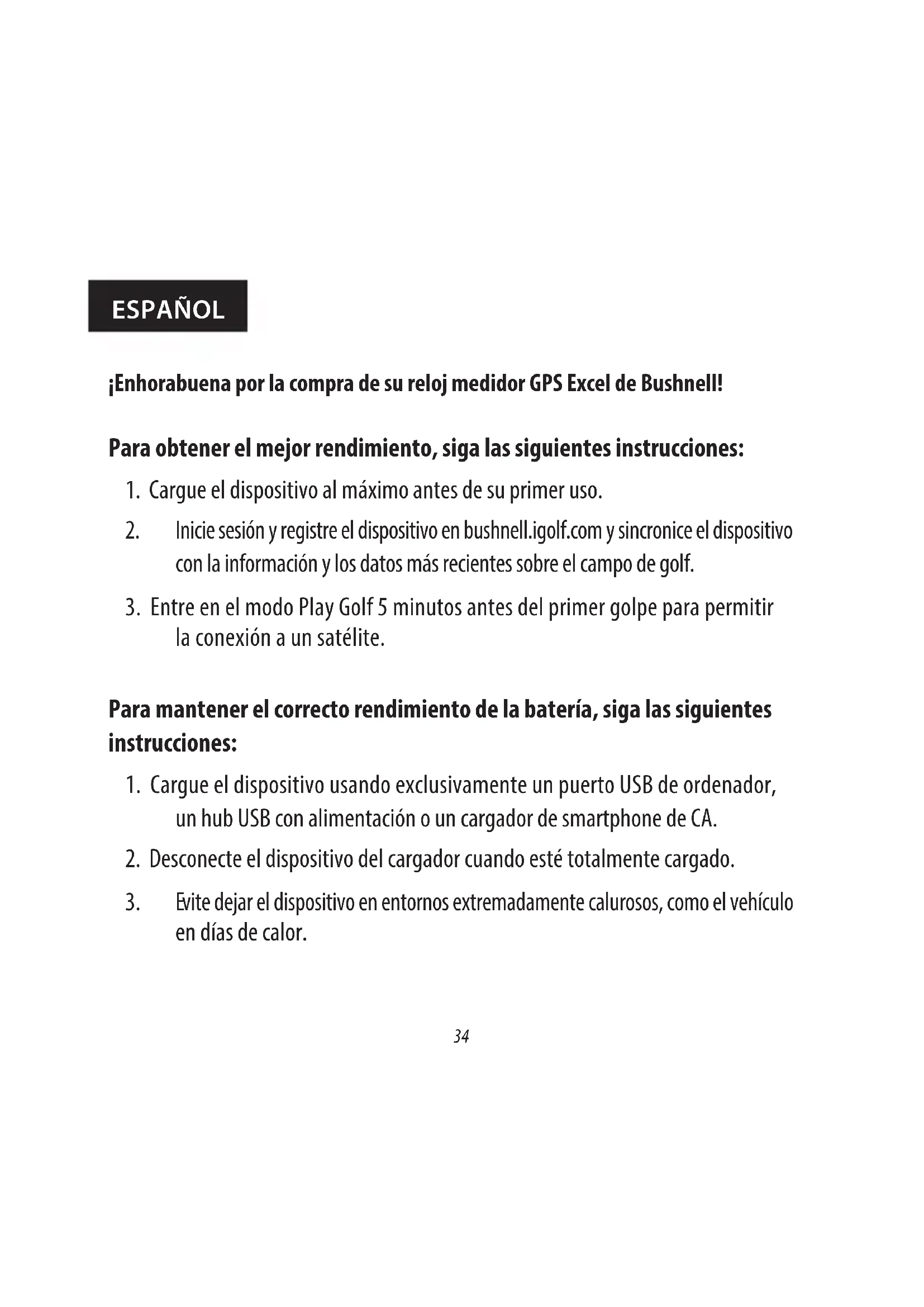- Deseche o recicle el dispositivo de forma adecuada. No lo tire al agua ni a un fuego. Aviso legal Al utilizar este producto, usted acepta que Bushnell Outdoor Products no será legalmente responsable de lesiones o daños austed ni a ninguna otra persona ni propiedad causados por el funcionamiento inadecuado por parte del usuario y/o un mal criterio durante el uso de este producto. Nota: vea la Garantía limitada para conocer otras limitaciones de nuestra responsabilidad. Información adicional El sistema de posicionamiento global (GPS), una red de 32 satélites en la órbita terrestre, está operado y mantenido por el gobierno de los Estados Unidos. Este dispositivo GPS necesita la conexión a al menos 3 satélites para determinar adecuadamente su posición. Cualquier cambio realizado en el sistema por parte del gobierno podría afectar a la precisión y el rendimiento de este producto. Página web de Bushnell Golf GPS www.bushnellgolf.com o www.bushnellgolf.eu es el mejor recurso online para todos los propietarios de nuestros productos GPS para golf, incluido soporte de producto, preguntas frecuentes, etc. También sirve como portal de acceso alosarchivos del campo GPS iGolf.com que se utilizan con estos productos Bushnell. No es necesario registrar su reloj Excel en www.bushnell.igolf.com, pero si lo hace se asegurará el acceso a los últimos datos de campos GPS.47 GARANTÍA LIMITADA DE UN AÑO Bushnell