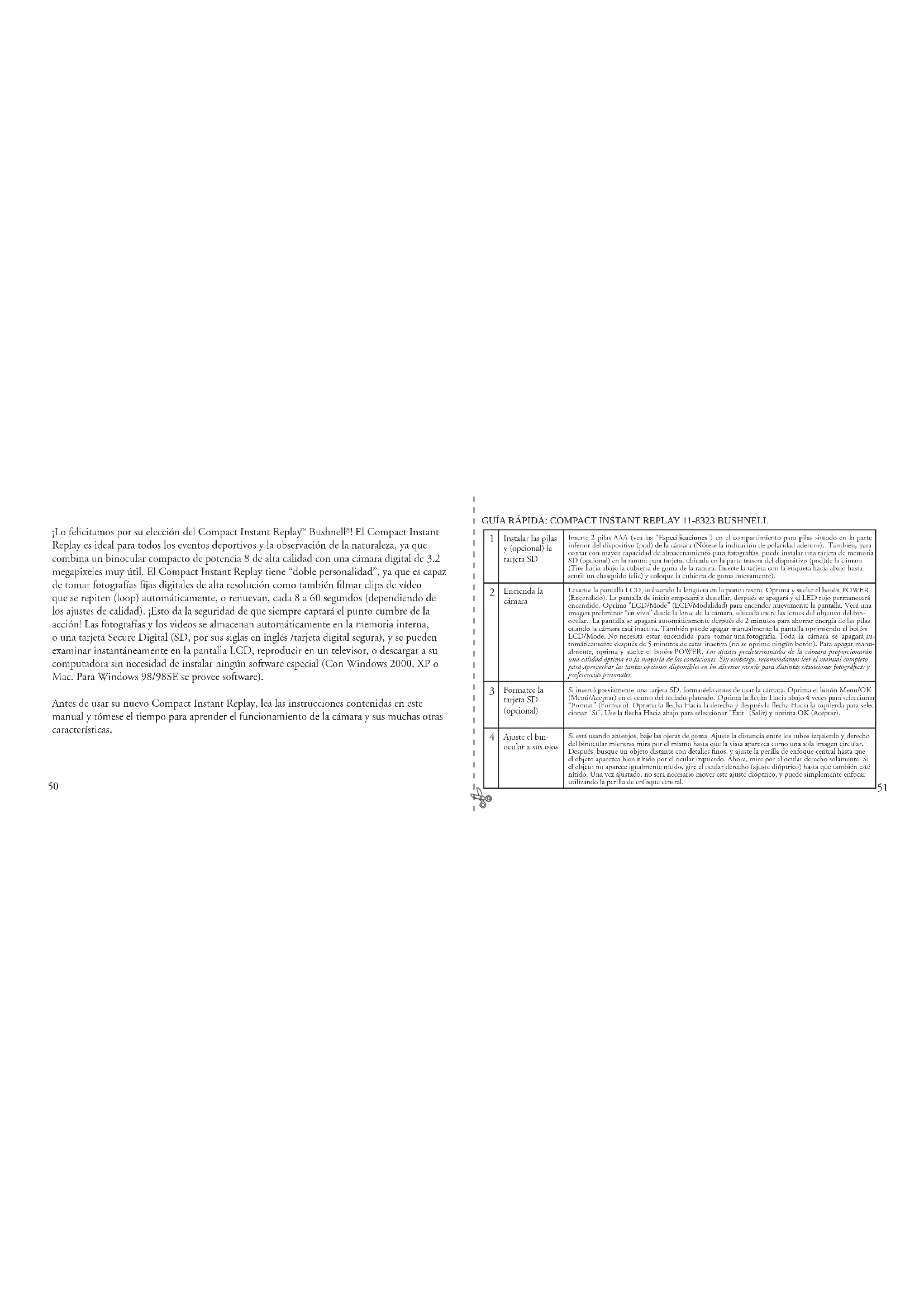 ! El Compact Instant Replay es ideal para todos los eventos deportivos y la observación de la naturaleza, ya que combina un binocular compacto de potencia 8 de alta calidad con una cámara digital de 3.2 megapixeles muy útil. El Compact Instant Replay tiene “doble personalidad”, ya que es capaz de tomar fotografías fijas digitales de alta resolución como también filmar clips de vídeo que se repiten (loop) automáticamente, o renuevan, cada 8 a 60 segundos (dependiendo de los ajustes de calidad). ¡Esto da la seguridad de que siempre captará el punto cumbre de la acción! Las fotografías y los videos se almacenan automáticamente en la memoria interna, o una tarjeta Secure Digital (SD, por sus siglas en inglés /tarjeta digital segura), y se pueden examinar instantáneamente en la pantalla LCD, reproducir en un televisor, o descargar a su computadora sin necesidad de instalar ningún software especial (Con Windows 2000, XP o Mac. Para Windows 98/98SE se provee software). Antes de usar su nuevo Compact Instant Replay, lea las instrucciones contenidas en este manual y tómese el tiempo para aprender el funcionamiento de la cámara y sus muchas otras características. GUÍA RÁPIDA: COMPACT INSTANT REPLAY 11-8323 BUSHNELL