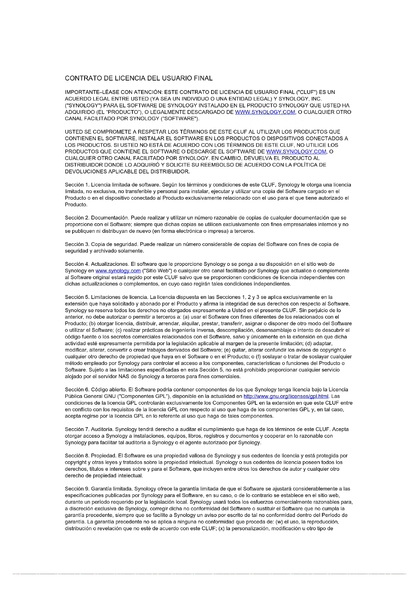 Annexe RXD1215sas Voyant à LED Couleur État Description Voyant d'état de disque dur (sur le plateau à disque dur) Vert Statique Disque prêt et inactif Clignotant Accès au disque en cours Rouge Statique Erreur disque Éteint Pas de disque dur interne Alimentation Bleu Statique Allumé Éteint Arrêté ALERT avant Orange Clignotant Panne du ventilateur Éteint Système normal ALERT arrière Orange Statique Arrêté Clignotant Panne du ventilateur Éteint Système normal STATUS arrière Vert Clignotant Allumé Éteint Arrêté Voyant PSU Vert Statique Unité d'alimentation normale Éteint Unité d'alimentation hors tension Remarque : les caractéristiques du modèle sont sujettes à modication sans préavis. Reportez-vous à www. synology.com pour les dernières informations.CONTRATO DE LICENCIA DEL USUARIO FINAL IMPORTANTE–LÉASE CON ATENCIÓN: ESTE CONTRATO DE LICENCIA DE USUARIO FINAL ("CLUF") ES UN ACUERDO LEGAL ENTRE USTED (YA SEA UN INDIVIDUO O UNA ENTIDAD LEGAL) Y SYNOLOGY, INC. ("SYNOLOGY") PARA EL SOFTWARE DE SYNOLOGY INSTALADO EN EL PRODUCTO SYNOLOGY QUE USTED HA ADQUIRIDO (EL “PRODUCTO”), O LEGALMENTE DESCARGADO DE WWW.SYNOLOGY.COM, O CUALQUIER OTRO CANAL FACILITADO POR SYNOLOGY ("SOFTWARE"). USTED SE COMPROMETE A RESPETAR LOS TÉRMINOS DE ESTE CLUF AL UTILIZAR LOS PRODUCTOS QUE CONTIENEN EL SOFTWARE, INSTALAR EL SOFTWARE EN LOS PRODUCTOS O DISPOSITIVOS CONECTADOS A LOS PRODUCTOS. SI USTED NO ESTÁ DE ACUERDO CON LOS TÉRMINOS DE ESTE CLUF, NO UTILICE LOS PRODUCTOS QUE CONTIENE EL SOFTWARE O DESCARGE EL SOFTWARE DE WWW.SYNOLOGY.COM, O CUALQUIER OTRO CANAL FACILITADO POR SYNOLOGY. EN CAMBIO, DEVUELVA EL PRODUCTO AL DISTRIBUIDOR DONDE LO ADQUIRIÓ Y SOLICITE SU REEMBOLSO DE ACUERDO CON LA POLÍTICA DE DEVOLUCIONES APLICABLE DEL DISTRIBUIDOR. Sección 1. Licencia limitada de software. Según los términos y condiciones de este CLUF, Synology le otorga una licencia limitada, no exclusiva, no transferible y personal para instalar, ejecutar y utilizar una copia del Software cargado en el Producto o en el dispositivo conectado al Producto exclusivamente relacionado con el uso para el que tiene autorizado el Producto. Sección 2. Documentación. Puede realizar y utilizar un número razonable de copias de cualquier documentación que se proporcione con el Software; siempre que dichas copias se utilicen exclusivamente con fines empresariales internos y no se publiquen ni distribuyan de nuevo (en forma electrónica o impresa) a terceros. Sección 3. Copia de seguridad. Puede realizar un número considerable de copias del Software con fines de copia de seguridad y archivado solamente. Sección 4. Actualizaciones. El software que le proporcione Synology o se ponga a su disposición en el sitio web de Synology en www.synology.com ("Sitio Web") o cualquier otro canal facilitado por Synology que actualice o complemente al Software original estará regido por este CLUF salvo que se proporcionen condiciones de licencia independientes con dichas actualizaciones o complementos, en cuyo caso regirán tales condiciones independientes. Sección 5. Limitaciones de licencia. La licencia dispuesta en las Secciones 1, 2 y 3 se aplica exclusivamente en la extensión que haya solicitado y abonado por el Producto y afirma la integridad de sus derechos con respecto al Software. Synology se reserva todos los derechos no otorgados expresamente a Usted en el presente CLUF. Sin perjuicio de lo anterior, no debe autorizar o permitir a terceros a: (a) usar el Software con fines diferentes de los relacionados con el Producto; (b) otorgar licencia, distribuir, arrendar, alquilar, prestar, transferir, asignar o disponer de otro modo del Software o utilizar el Software; (c) realizar prácticas de ingeniería inversa, descompilación, desensamblaje o intento de descubrir el código fuente o los secretos comerciales relacionados con el Software, salvo y únicamente en la extensión en que dicha actividad esté expresamente permitida por la legislación aplicable al margen de la presente limitación; (d) adaptar, modificar, alterar, convertir o crear trabajos derivados del Software; (e) quitar, alterar confundir los avisos de copyright o cualquier otro derecho de propiedad que haya en el Software o en el Producto; o (f) soslayar o tratar de soslayar cualquier método empleado por Synology para controlar el acceso a los componentes, características o funciones del Producto o Software. Sujeto a las limitaciones especificadas en esta Sección 5, no está prohibido proporcionar cualquier servicio alojado por el servidor NAS de Synology a terceros para fines comerciales. Sección 6. Código abierto. El Software podría contener componentes de los que Synology tenga licencia bajo la Licencia Pública General GNU ("Componentes GPL"), disponible en la actualidad en http://www.gnu.org/licenses/gpl.html. Las condiciones de la licencia GPL controlarán exclusivamente los Componentes GPL en la extensión en que este CLUF entre en conflicto con los requisitos de la licencia GPL con respecto al uso que haga de los componentes GPL y, en tal caso, acepta regirse por la licencia GPL en lo referente al uso que haga de tales componentes. Sección 7. Auditoría. Synology tendrá derecho a auditar el cumplimiento que haga de los términos de este CLUF. Acepta otorgar acceso a Synology a instalaciones, equipos, libros, registros y documentos y cooperar en lo razonable con Synology para facilitar tal auditoría a Synology o el agente autorizado por Synology. Sección 8. Propiedad. El Software es una propiedad valiosa de Synology y sus cedentes de licencia y está protegida por copyright y otras leyes y tratados sobre la propiedad intelectual. Synology o sus cedentes de licencia poseen todos los derechos, títulos e intereses sobre y para el Software, que incluyen entre otros los derechos de autor y cualquier otro derecho de propiedad intelectual. Sección 9. Garantía limitada. Synology ofrece la garantía limitada de que el Softwar