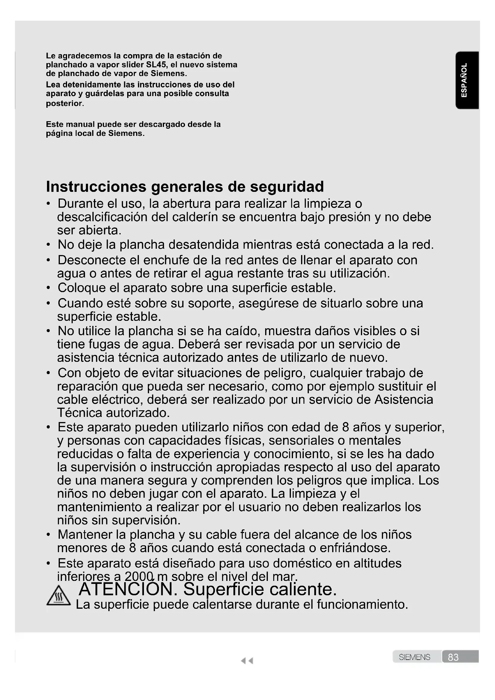 - Este aparato está diseñado para uso doméstico en altitudes inferiores a 2000 m sobre el nivel del mar. ATENCIÓN. Supercie caliente. La supercie puede calentarse durante el funcionamiento.84 S I E M E N S ESPAÑOL Descripción
