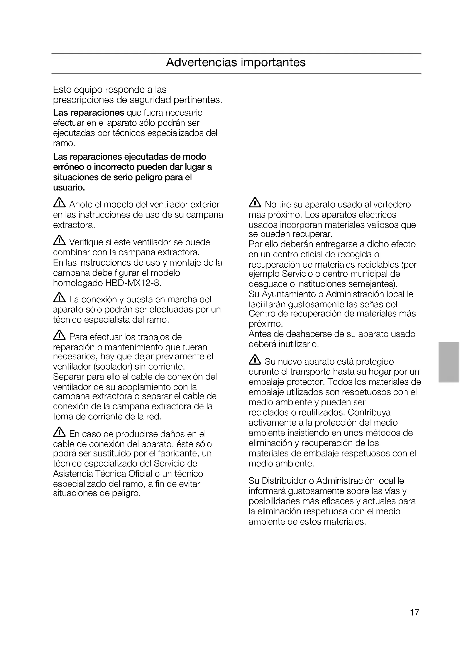 cappa aspirante. Per motivi di sicurezza, la copertura supplementare della spina deve essere sempre applicata e chiusa.17 Advertencias importantes Este equipo responde a las prescripciones de seguridad pertinentes. Las reparaciones que fuera necesario efectuar en el aparato sólo podrán ser ejecutadas por técnicos especializados del ramo. Las reparaciones ejecutadas de modo erróneo o incorrecto pueden dar lugar a situaciones de serio peligro para el usuario. Anote el modelo del ventilador exterior en las instrucciones de uso de su campana extractora. Verifique si este ventilador se puede combinar con la campana extractora. En las instrucciones de uso y montaje de la campana debe figurar el modelo homologado HBD-MX12-8. La conexión y puesta en marcha del aparato sólo podrán ser efectuadas por un técnico especialista del ramo. Para efectuar los trabajos de reparación o mantenimiento que fueran necesarios, hay que dejar previamente el ventilador (soplador) sin corriente. Separar para ello el cable de conexión del ventilador de su acoplamiento con la campana extractora o separar el cable de conexión de la campana extractora de la toma de corriente de la red. En caso de producirse daños en el cable de conexión del aparato, éste sólo podrá ser sustituido por el fabricante, un técnico especializado del Servicio de Asistencia Técnica Oficial o un técnico especializado del ramo, a fin de evitar situaciones de peligro. Este equipo responde a las prescripciones de seguridad pertinentes. Las reparaciones que fuera necesario efectuar en el aparato sólo podrán ser ejecutadas por técnicos especializados del ramo. Las reparaciones ejecutadas de modo erróneo o incorrecto pueden dar lugar a situaciones de serio peligro para el usuario. No tire su aparato usado al vertedero más próximo. Los aparatos eléctricos usados incorporan materiales valiosos que se pueden recuperar. Por ello deberán entregarse a dicho efecto en un centro oficial de recogida o recuperación de materiales reciclables (por ejemplo Servicio o centro municipal de desguace o instituciones semejantes). Su Ayuntamiento o Administración local le facilitarán gustosamente las señas del Centro de recuperación de materiales más próximo. Antes de deshacerse de su aparato usado deberá inutilizarlo. Su nuevo aparato está protegido durante el transporte hasta su hogar por un embalaje protector. Todos los materiales de embalaje utilizados son respetuosos con el medio ambiente y pueden ser reciclados o reutilizados. Contribuya activamente a la protección del medio ambiente insistiendo en unos métodos de eliminación y recuperación de los materiales de embalaje respetuosos con el medio ambiente. Su Distribuidor o Administración local le informará gustosamente sobre las vías y posibilidades más eficaces y actuales para la eliminación respetuosa con el medio ambiente de estos materiales.18 Antes del montaje