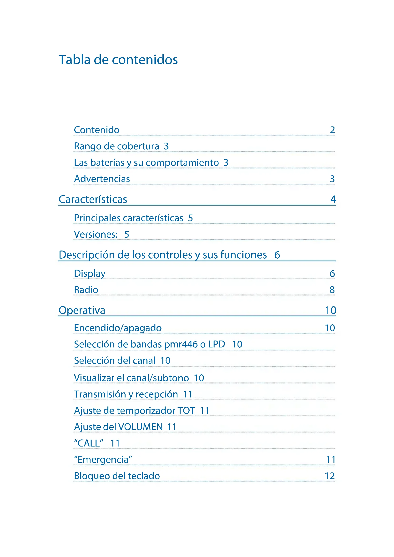 - Versión E (pmr446) En este manual nos referimos a ambas versiones y encontrará resaltadas las diferencias entre ellas. Contenido