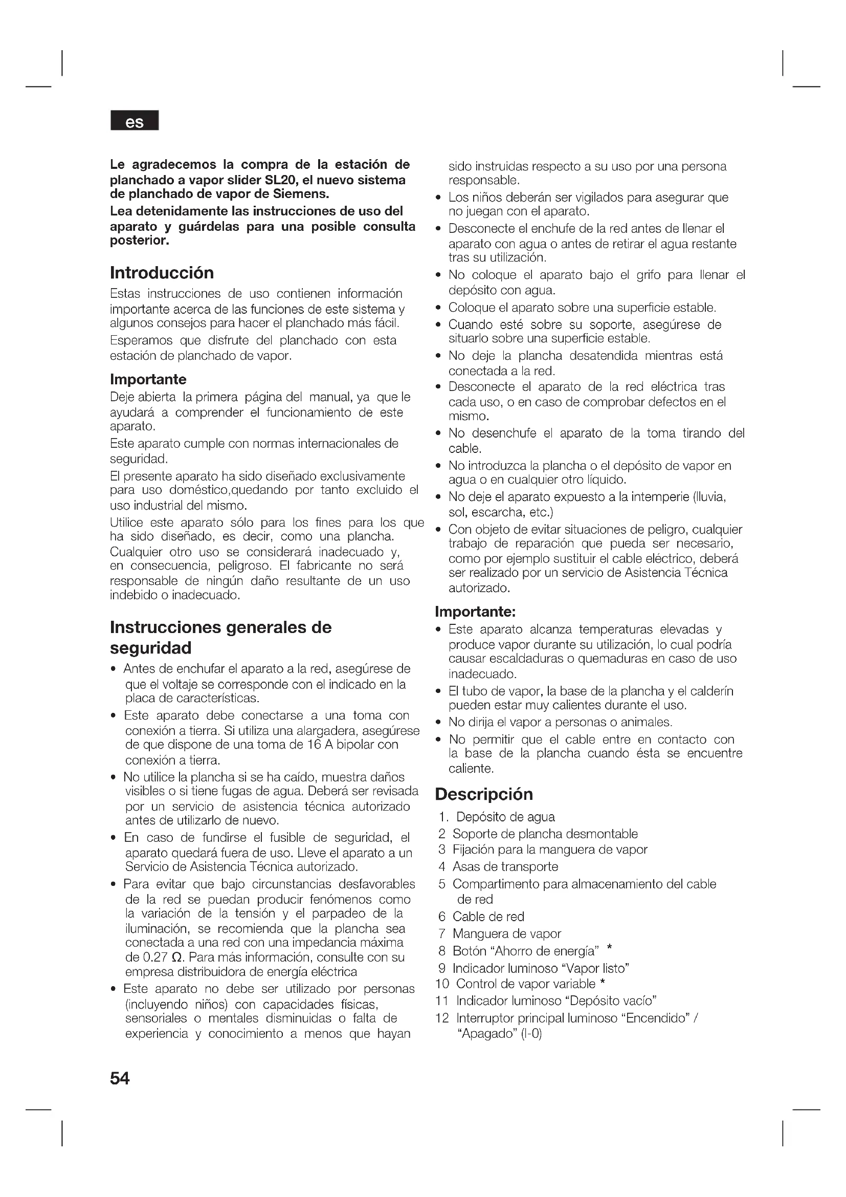 Le agradecemos la compra de la estación de planchado a vapor slider SL20, el nuevo sistema de planchado de vapor de Siemens. Lea detenidamente las instrucciones de uso del aparato y guárdelas para una posible consulta posterior. Introducción Estas instrucciones de uso contienen información importante acerca de las funciones de este sistema y algunos consejos para hacer el planchado más fácil. Esperamos que disfrute del planchado con esta estación de planchado de vapor. Importante Deje abierta la primera página del manual, ya que le ayudará a comprender el funcionamiento de este aparato. Este aparato cumple con normas internacionales de seguridad. El presente aparato ha sido diseñado exclusivamente para uso doméstico,quedando por tanto excluido el uso industrial del mismo. Utilice este aparato sólo para los fines para los que ha sido diseñado, es decir, como una plancha. Cualquier otro uso se considerará inadecuado y, en consecuencia, peligroso. El fabricante no será responsable de ningún daño resultante de un uso indebido o inadecuado. Instrucciones generales de seguridad
