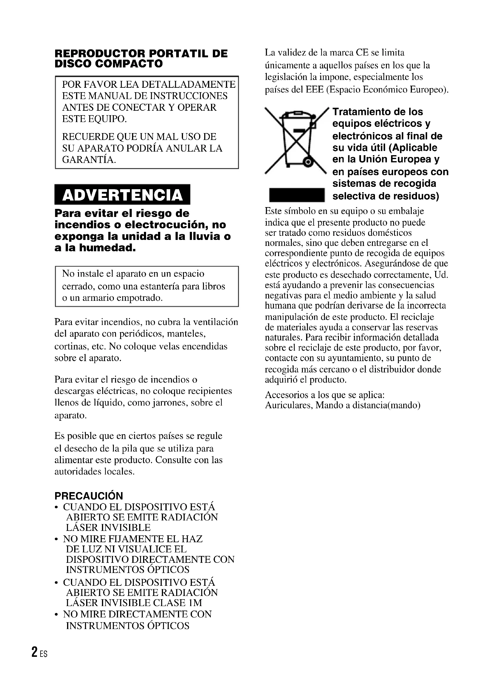 GARANTÍA. ADVERTENCIA Para evitar el riesgo de incendios o electrocución, no exponga la unidad a la lluvia o a la humedad. No instale el aparato en un espacio cerrado, como una estantería para libros o un armario empotrado. Para evitar incendios, no cubra la ventilación del aparato con periódicos, manteles, cortinas, etc. No coloque velas encendidas sobre el aparato. Para evitar el riesgo de incendios o descargas eléctricas, no coloque recipientes llenos de líquido, como jarrones, sobre el aparato. Es posible que en ciertos países se regule el desecho de la pila que se utiliza para alimentar este producto. Consulte con las autoridades locales. PRECAUCIÓN
