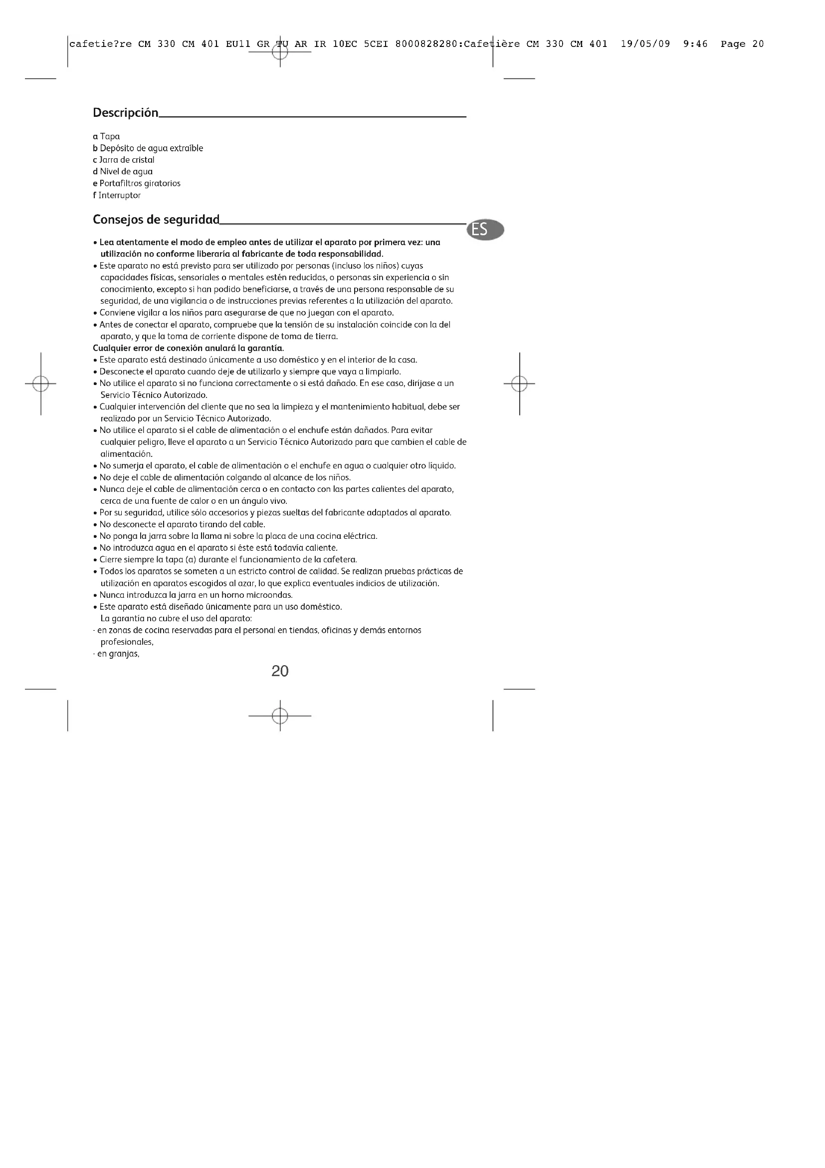 cafetie?re CM 330 CM 401 EU11 GR TU AR IR 10EC 5CEI 8000828280:Cafetière CM 330 CM 401 19/05/09 9:46 Page 20- por parte de clientes de hoteles, moteles y demás entornos de carácter residencial, - en entornos de tipo habitaciones rurales. Antes de la primera utilización